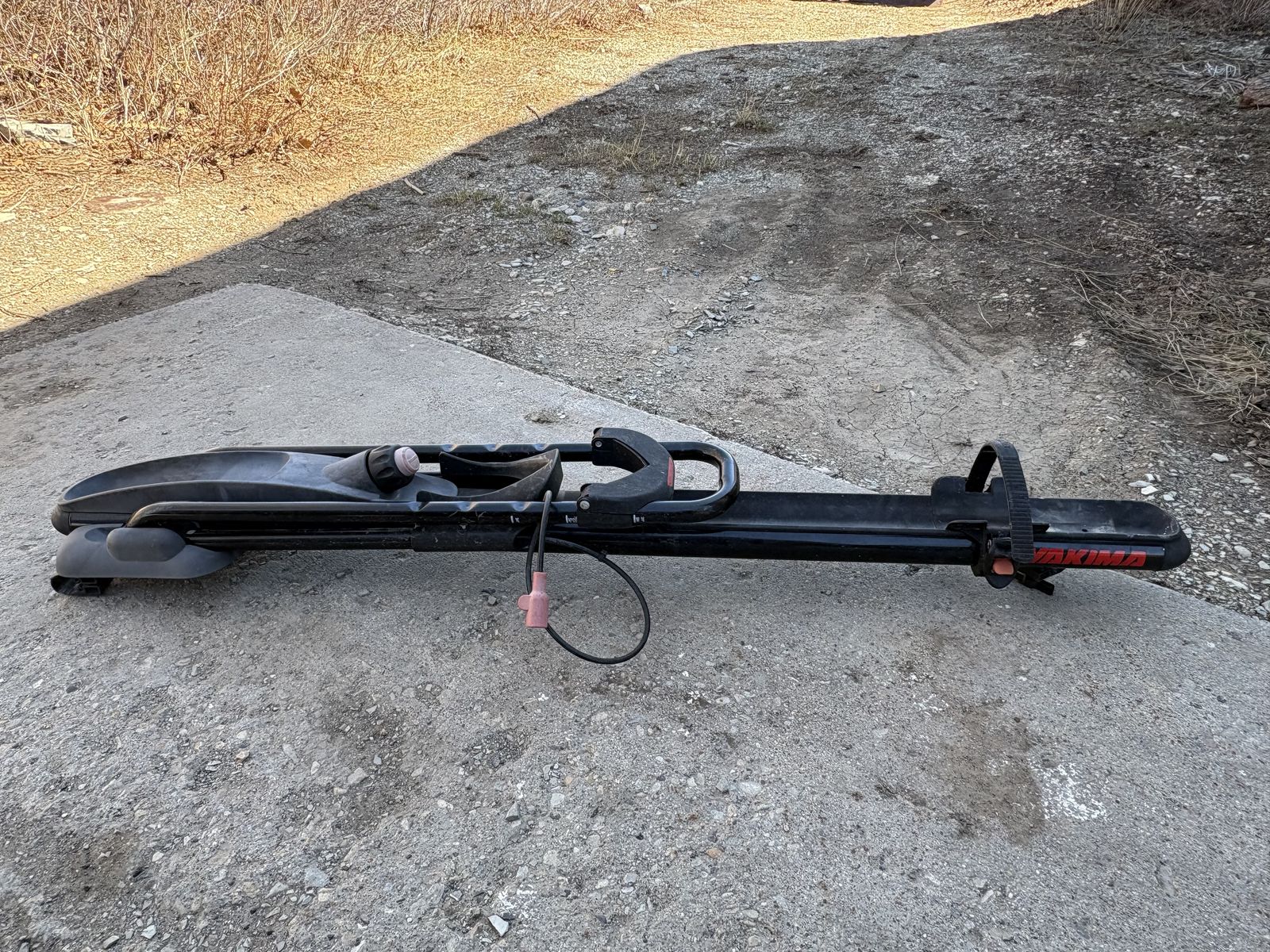 Venmoroof mount Yakima bike rack. Secures over wheel and other wheel clamp. Adjustable for 24 to 29 inch wheels. Includes lock and key. Includes mounting hardware for Yakima round bars.