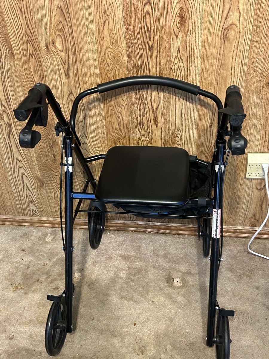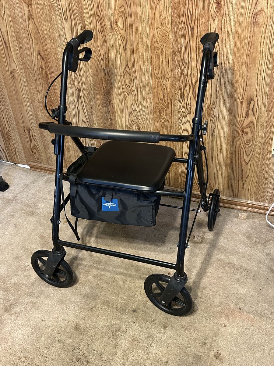 VenmoMidline rolling walker with seat and brakes. Great condition. Padded seat and back rest. Built-in storage under the seat. Adjustable height. Loop brakes that lock. Folds up easy.