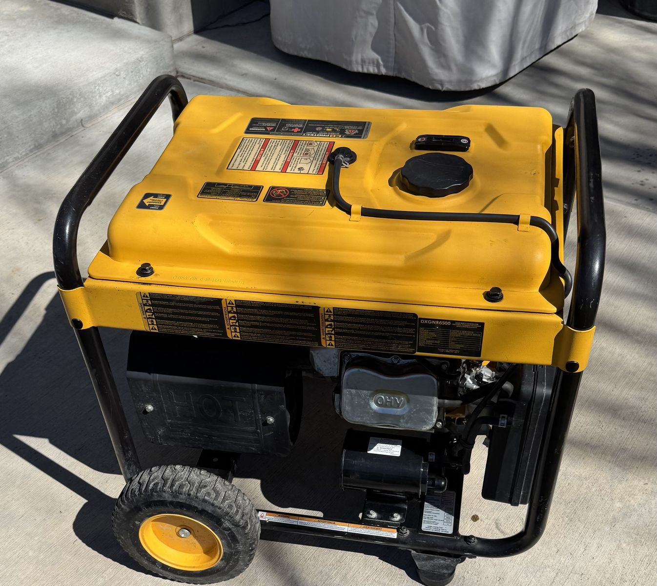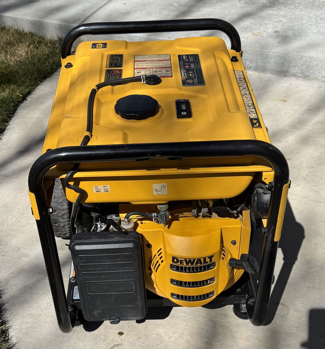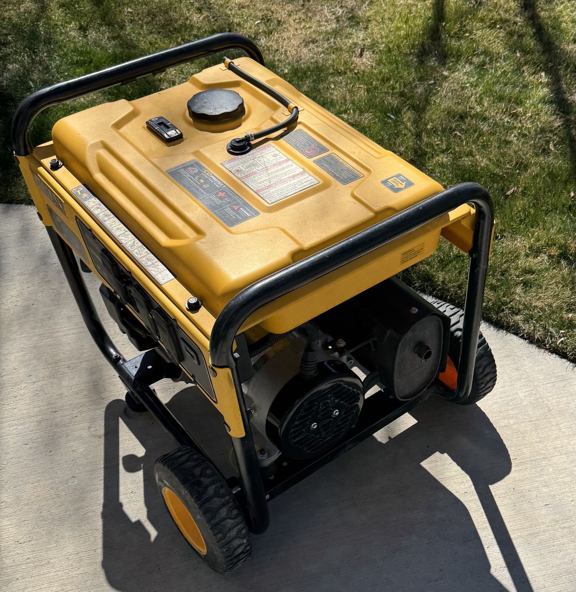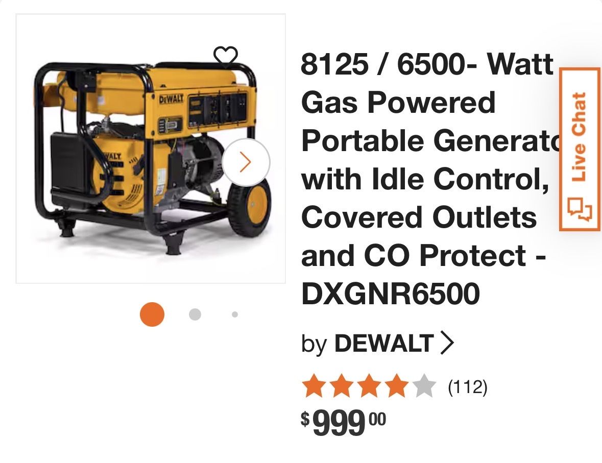 The DEWALT DXGNR6500 is designed with the professional in mind. The generator is powered by a premium 389cc DEWALT engine with low oil shut off which protects the engine from damage. The Idle control feature conserves fuel and reduces noise on the job site while CO-Protect Technology automatically shuts down the generator if CO levels become unsafe or rapidly increase. This generator is equipped with GFCI protected outlets for job site compliance and safety and features never-flat wheels for maximum portability and durability. The 7.5 Gal. steel fuel tank provides up to 10-hours of runtime at 50% load. The Hardened 1 steel tube frame is job site tested for superior durability and strength. The DEWALT DXGNR6500 Portable Gas Generator Guaranteed Tough. See Less