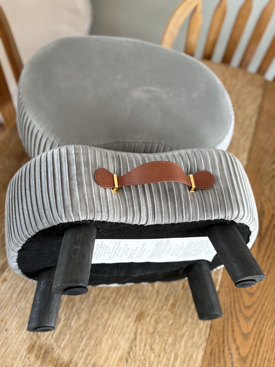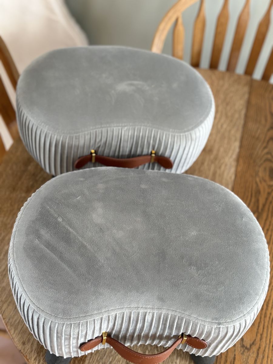 CashAppTwo cute gray foot stools. $15 each or both for $25. They have removable legs that are stored in a little zipper compartment on the bottom. They’ve only been used for once or twice when my mother-in-law was visiting.