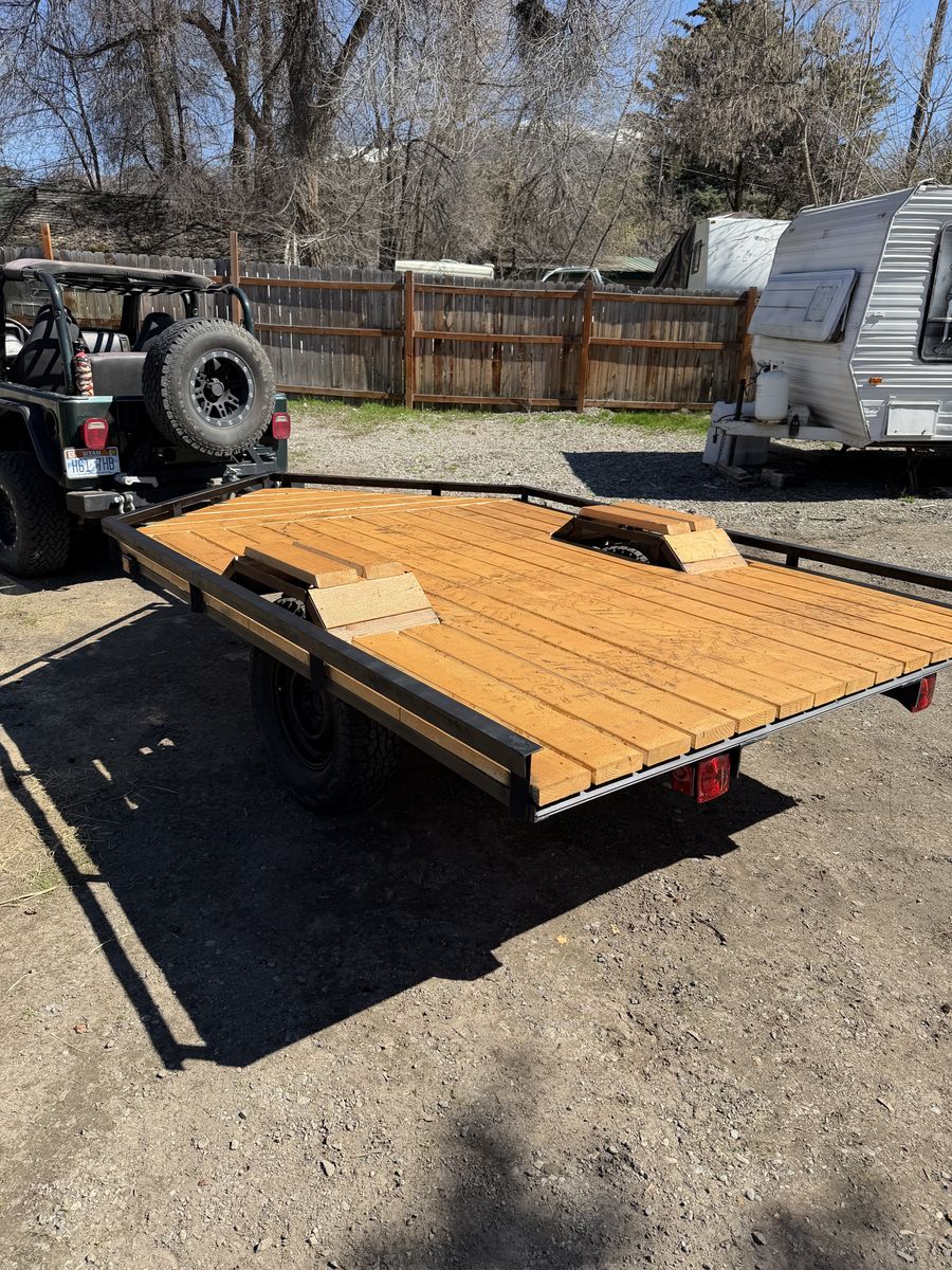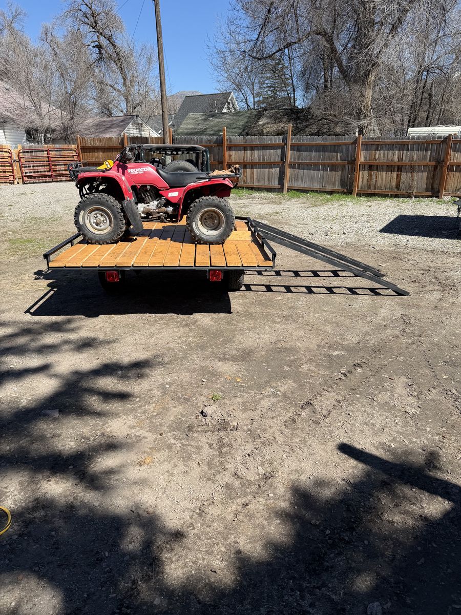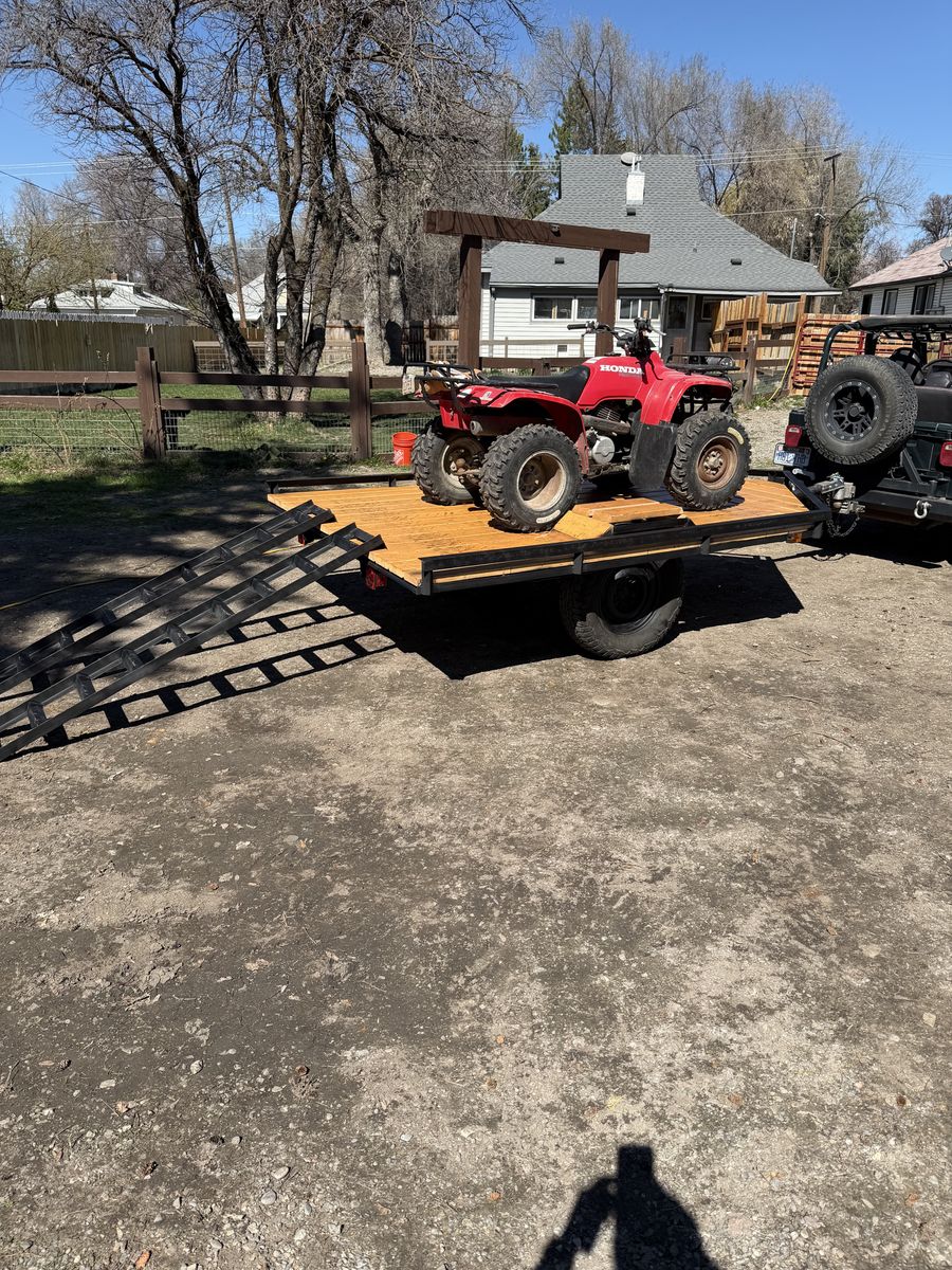 Single axle ATV Trailer 7’ wide 8’ square and 11’ to the deck nose for carrying gear and gas. This is a home build trailer on a truck axle it’s got a new deck new lights, newer tires 80% tread left and a new coupler. This trailer carries 2 quads side loaded, With plenty of room for the ramps and gear up front. I have carried two rototillers on this trailer each weighing 590lb and that seems to be about the maximum weight. This trailer pulls straight and rides really well. Willing to sell with the ramps or without. Ramps are 6’6” long and 12” wide. They are super heavy duty.
