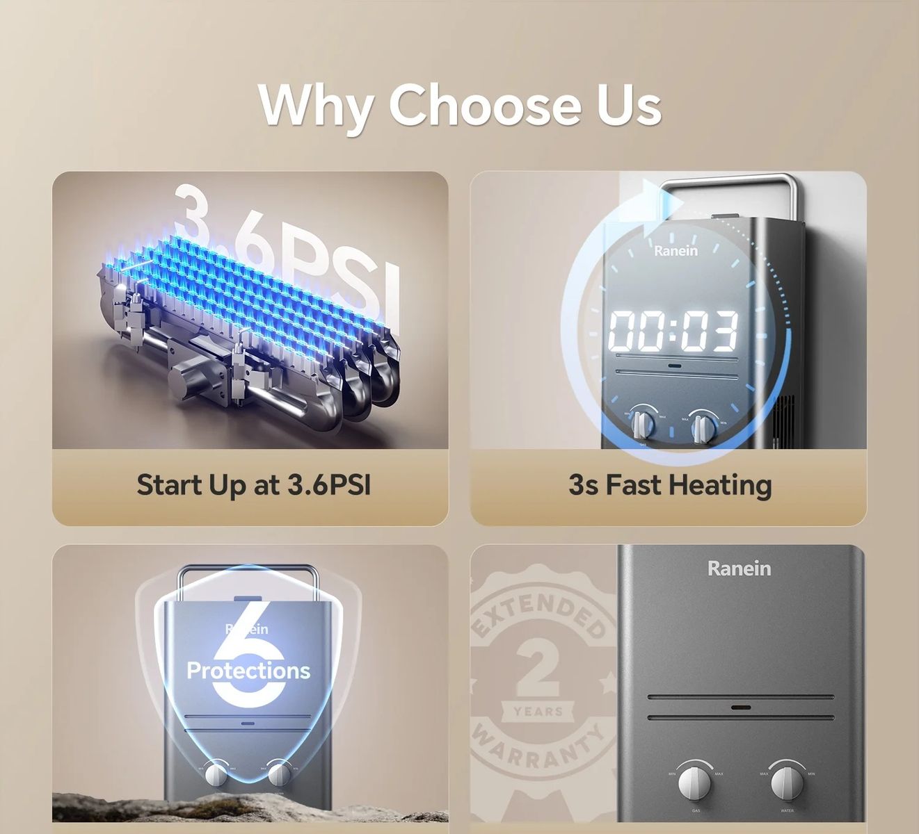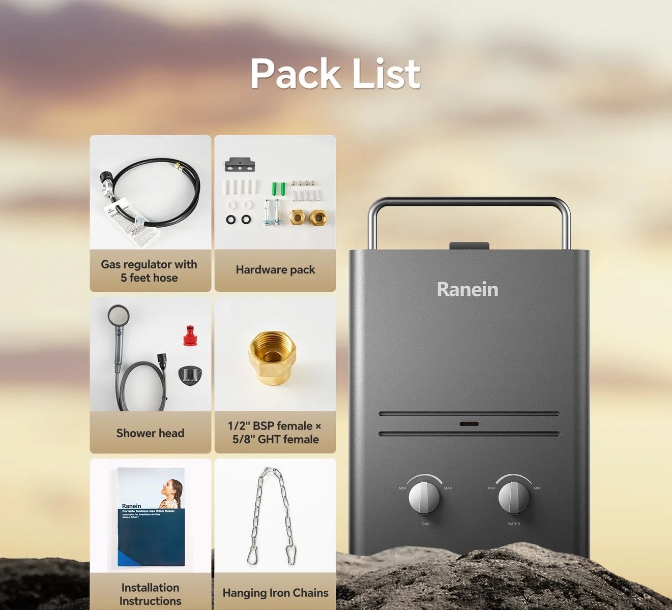 Ranein- Portable Water Heater 1.58 GPM will be your family's best hot water partner. This tankless gas water heater adopts a 41000 btu heating system; the instant water heater can provide instant, stable, unlimited hot water in the range of 86℉-131℉ and heats up in 3 seconds, with no need to wait to preheat unstable water. The portable tankless water heater is the perfect companion for your outdoor installation, providing a fast and effective solution for your daily needs.
