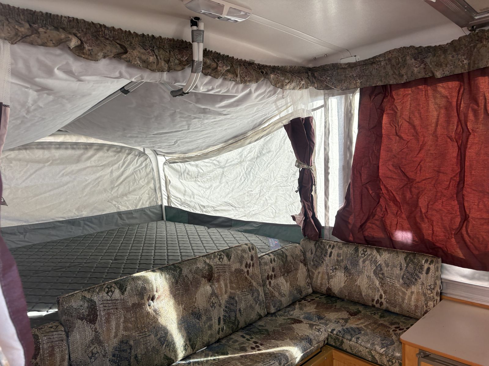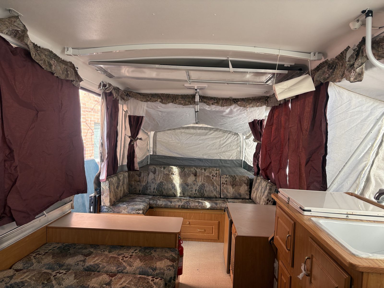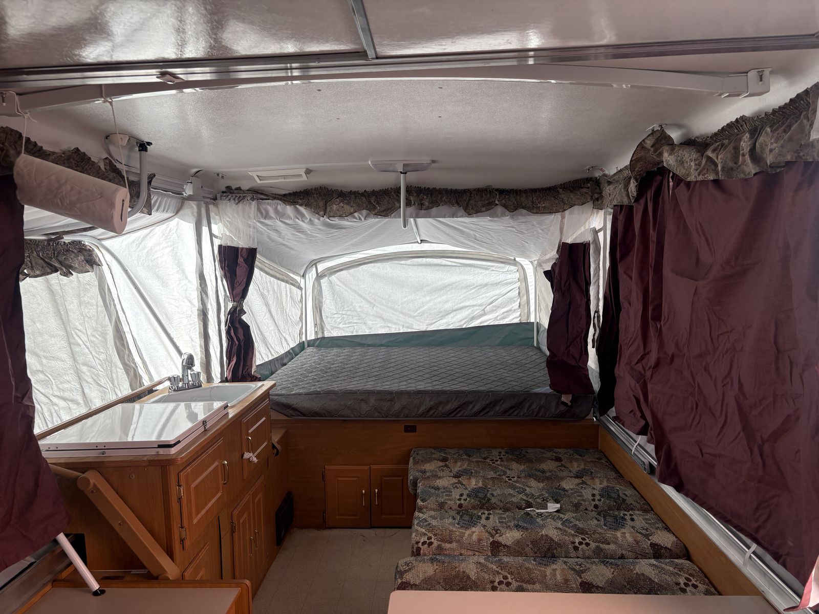 2queen size pull out beds, optional bed over the kitchen table area, kitchen sink and stove, dinning table area, refrigerator, heater, hot water heater, plenty of inside storage under cushions benches and cabinets, separate storage compartment in front, roof rack, new heavy duty leveling jacks, new tires, 2 propane hook ups, battery box, optional outside stove and side wall mount, awning, rear hitch for bike rack or for storage rack. Trailer is in great shape for its year and has not had a lot of use. I have maintained it well over the years and are the original owners, let me know if you have any questions, it is ready for camping!
