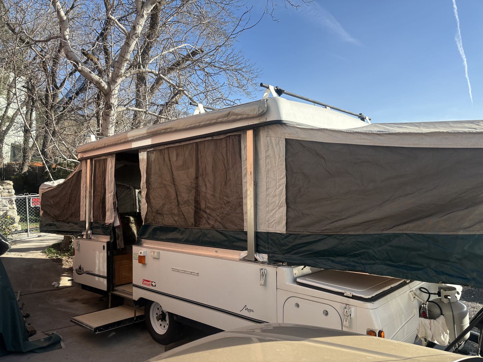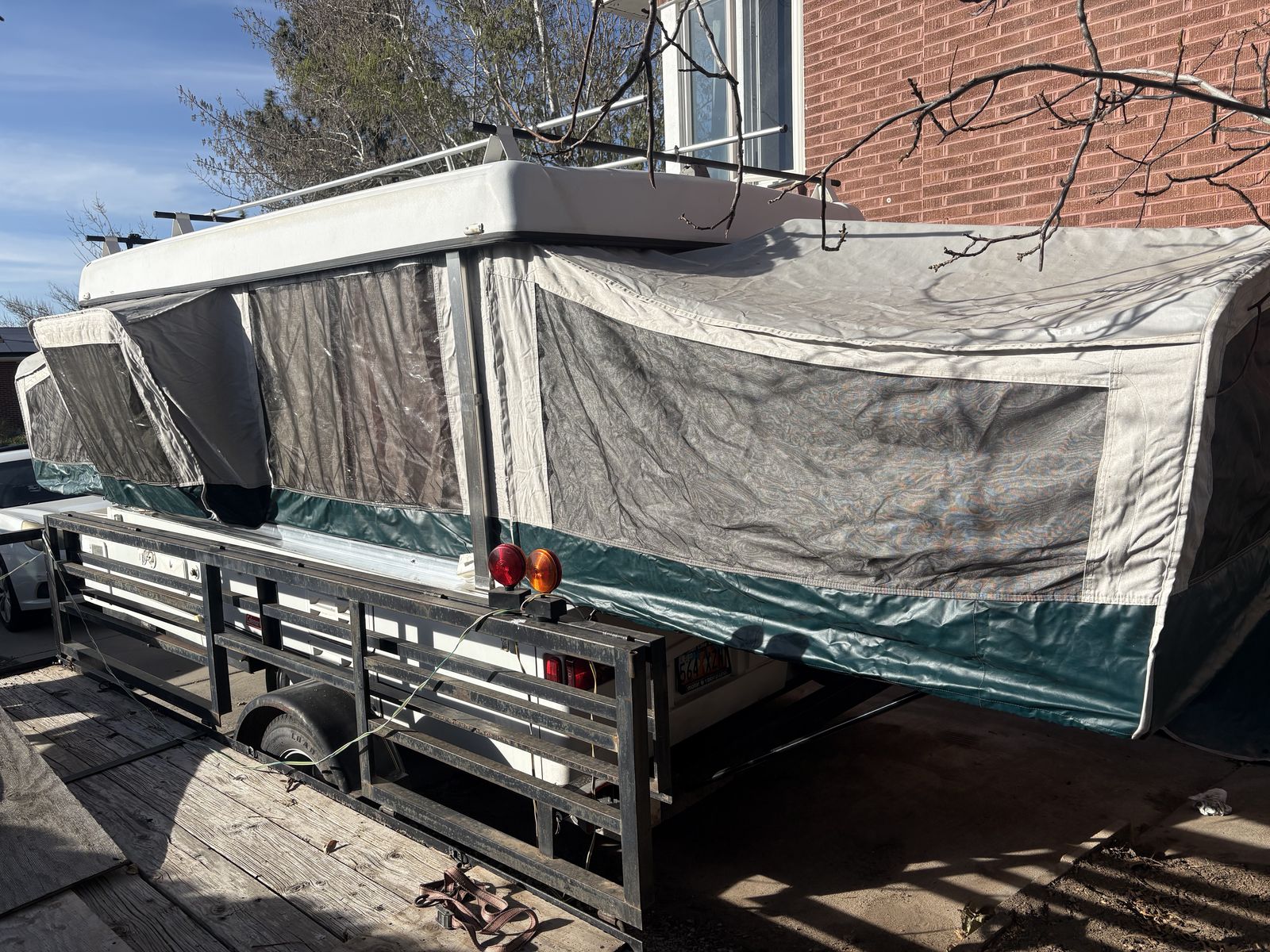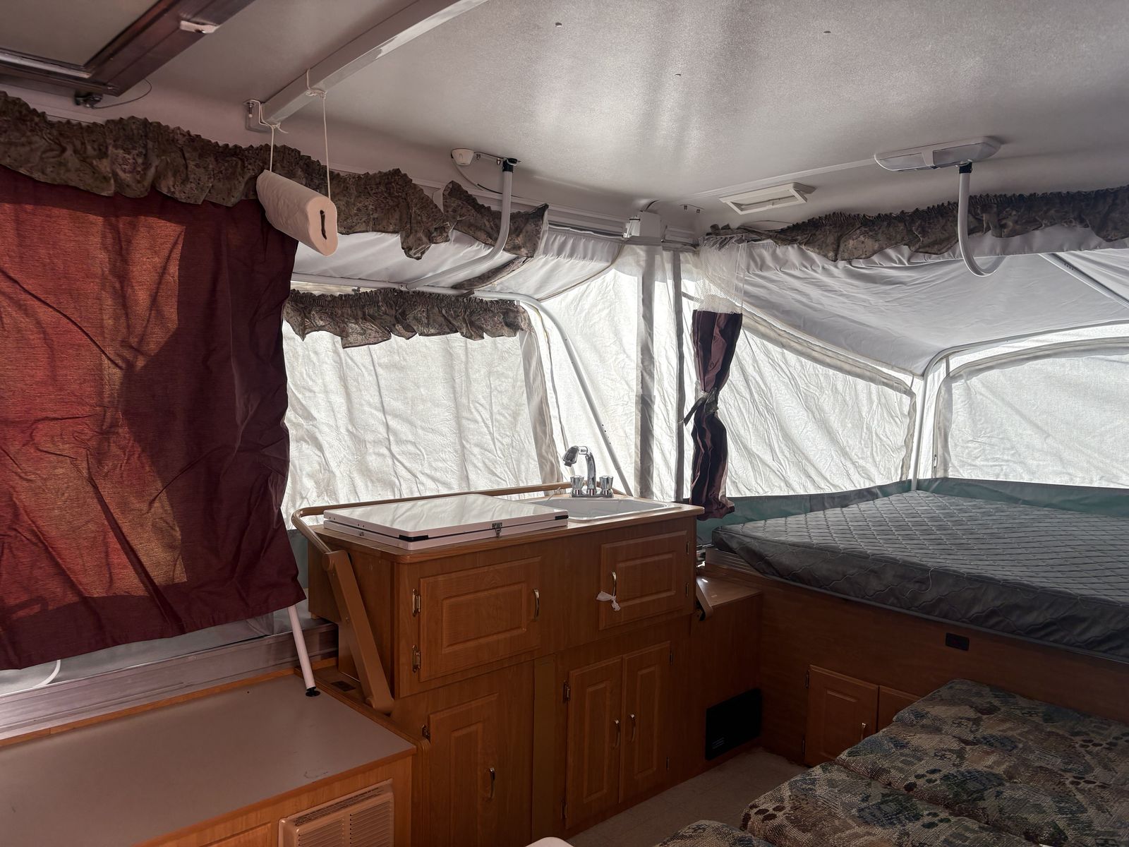 2queen size pull out beds, optional bed over the kitchen table area, kitchen sink and stove, dinning table area, refrigerator, heater, hot water heater, plenty of inside storage under cushions benches and cabinets, separate storage compartment in front, roof rack, new heavy duty leveling jacks, new tires, 2 propane hook ups, battery box, optional outside stove and side wall mount, awning, rear hitch for bike rack or for storage rack. Trailer is in great shape for its year and has not had a lot of use. I have maintained it well over the years and are the original owners, let me know if you have any questions, it is ready for camping!