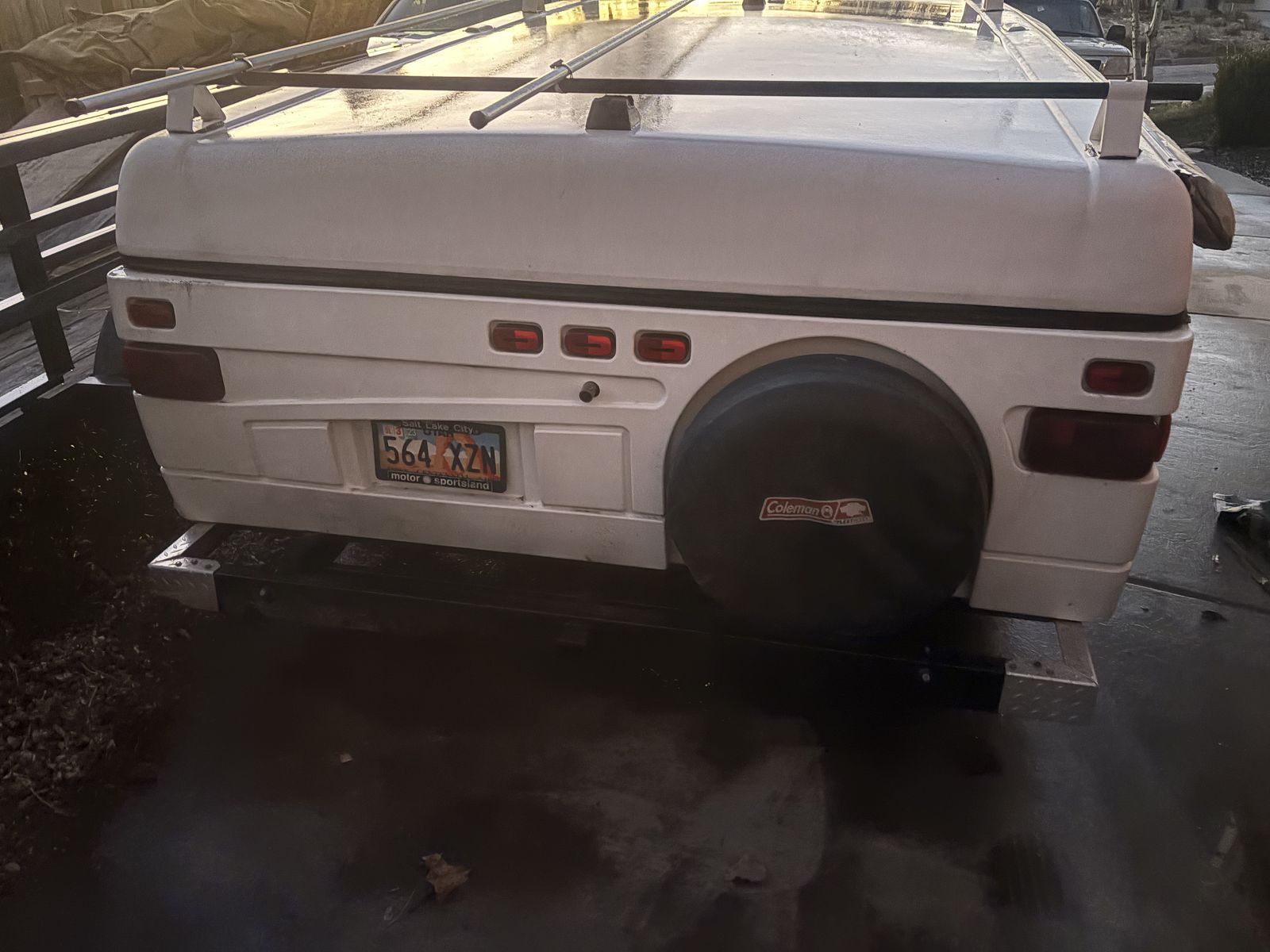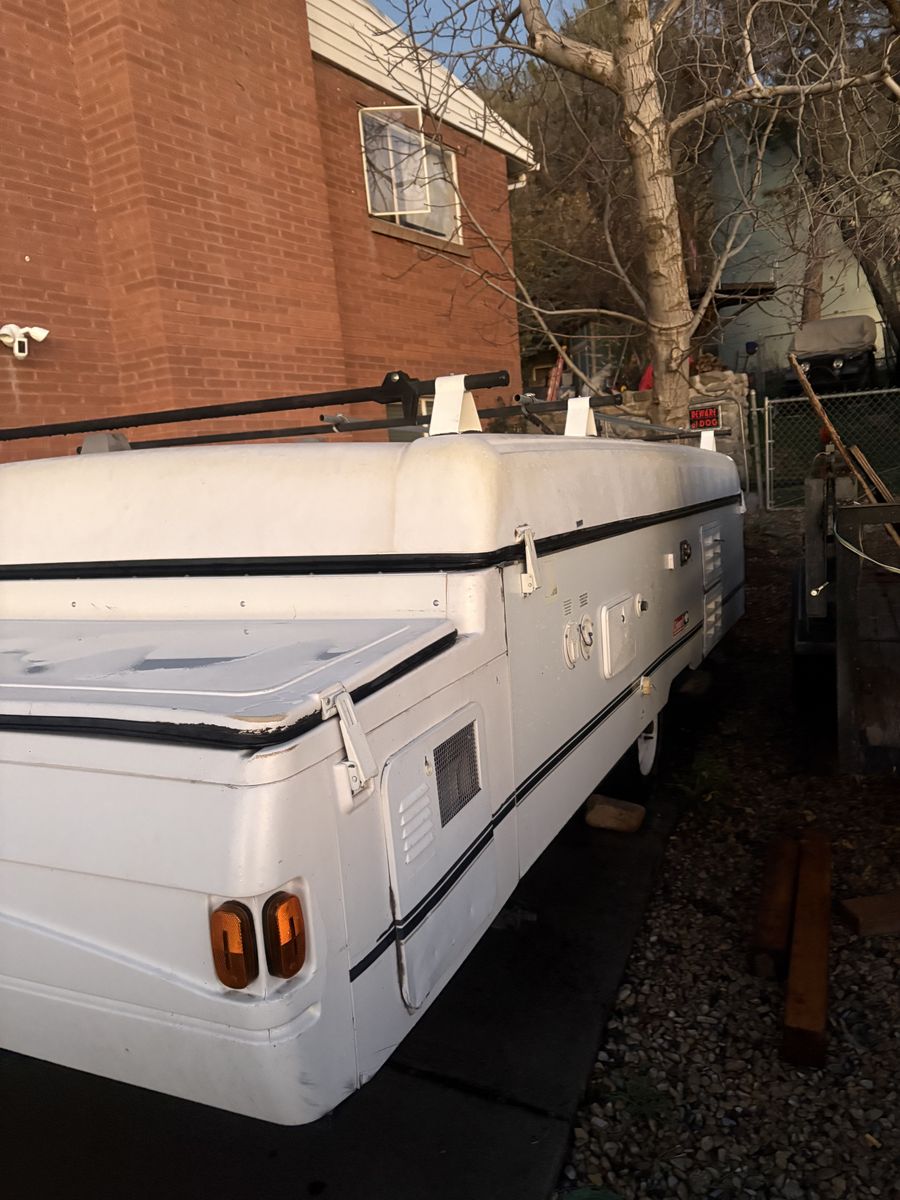 2 queen size pull out beds, optional bed over the kitchen table area, kitchen sink and stove, dinning table area, refrigerator, heater, hot water heater, plenty of inside storage under cushions benches and cabinets, separate storage compartment in front, roof rack, new heavy duty leveling jacks, new tires, 2 propane hook ups, battery box, optional outside stove and side wall mount, awning, rear hitch for bike rack or for storage rack. Trailer is in great shape for its year and has not had a lot of use. I have maintained it well over the years and are the original owners, let me know if you have any questions, it is ready for camping!