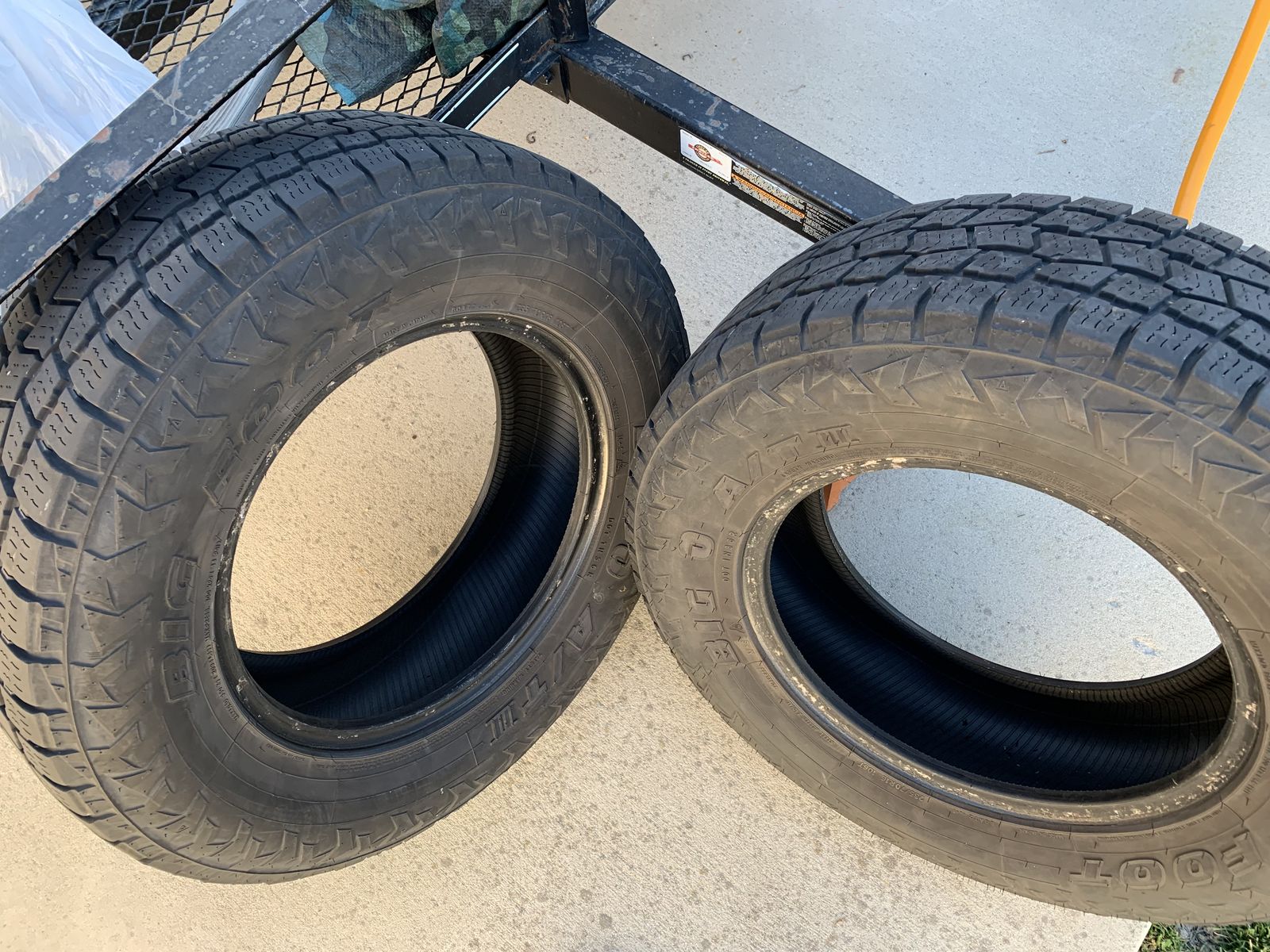 Tires are in good condition with good tread. 16 inch. Big O, Big Foot A/T II $75 for both obo Call or txt and I will get back to you.