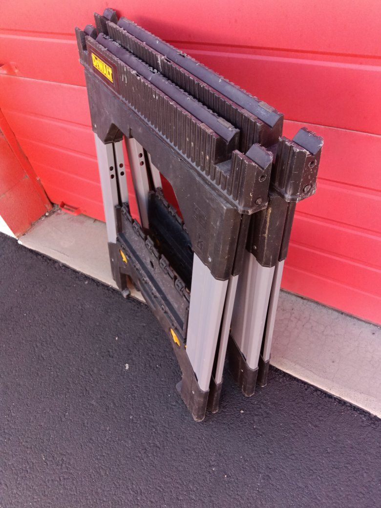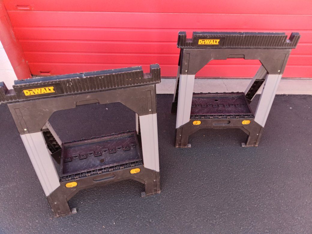 this is a set of two DeWalt heavy duty foldable sawhorses hidth adjustable in great condition one has a little crack in the tray but they both still work perfect just as they should see pictures for details! These run $75 each sale price at Amazon Home Depot another hardware stores save a Bundle $50 obo for the set of two!