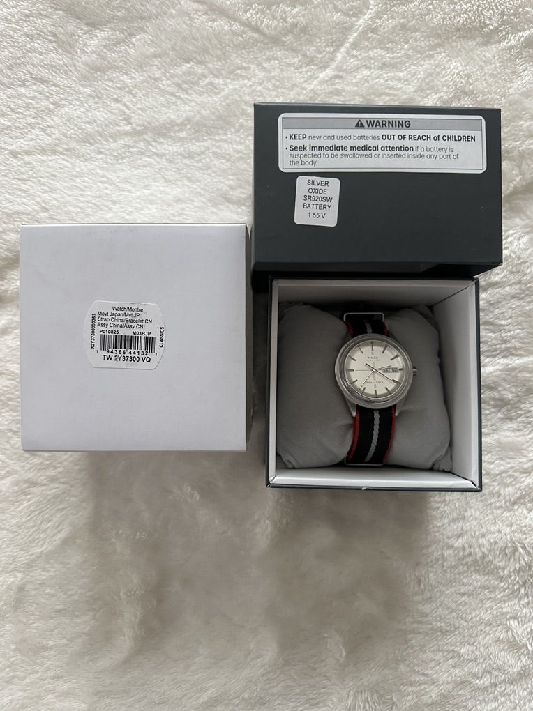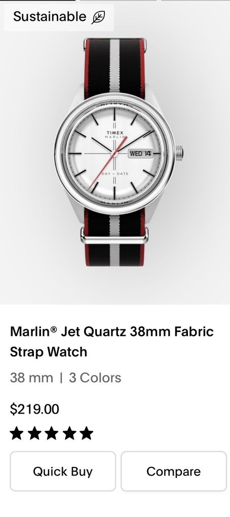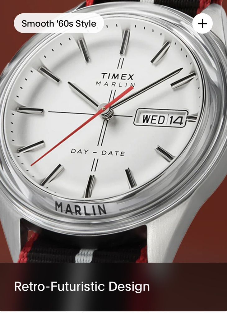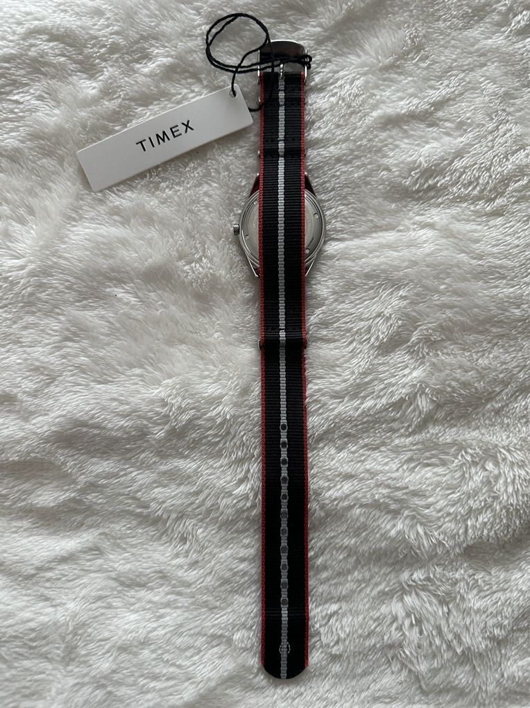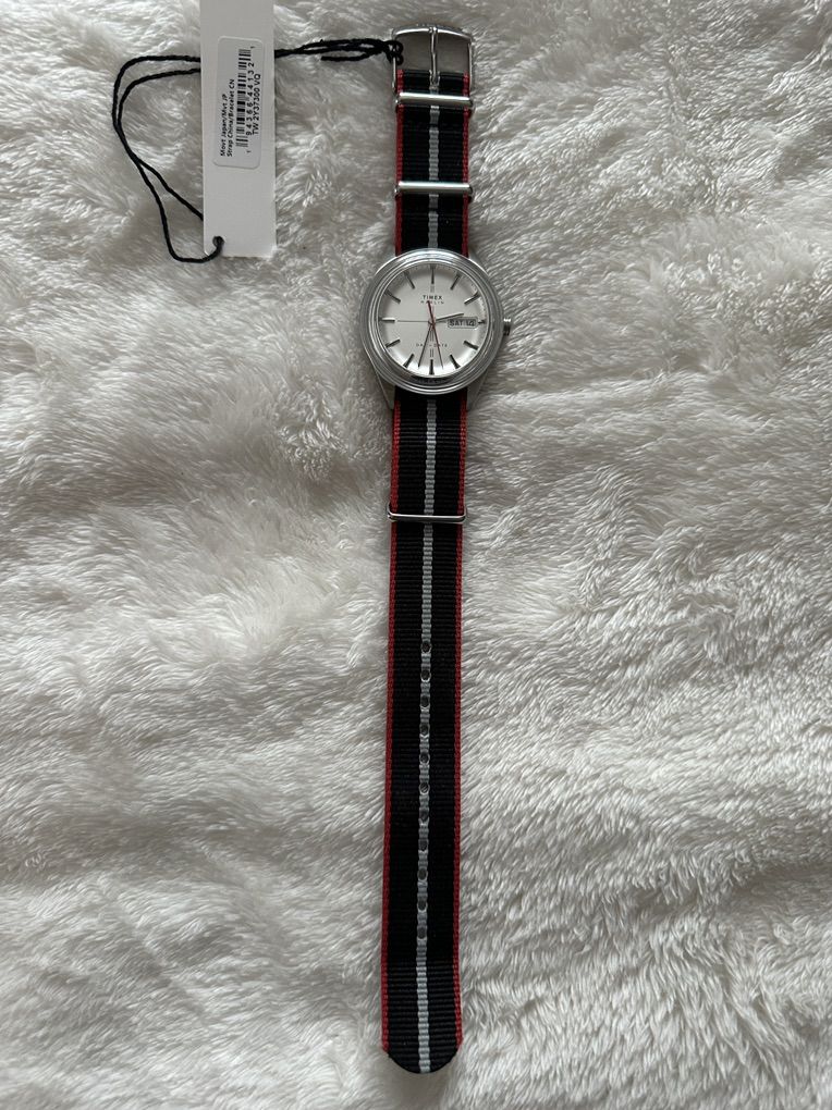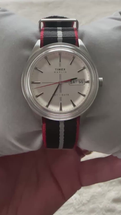 Timex Marlin with a silver sunray dial and a Day-Date complication at the 3 o'clock position. Key Features: • Upgraded Style: Comes on a high-quality color coordinated red, black, and gray NATO strap. • Dial: Polished stick markers and a silver finish that catches the light beautifully. • Functional: Quick-set Day and Date windows for easy daily use. • Original Box Included: Comes with the original Timex presentation box and tags.