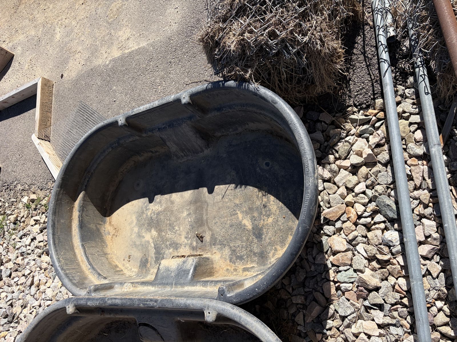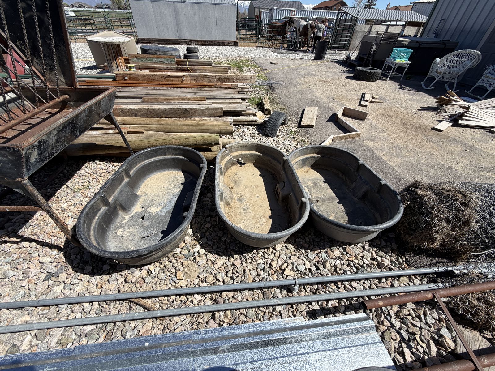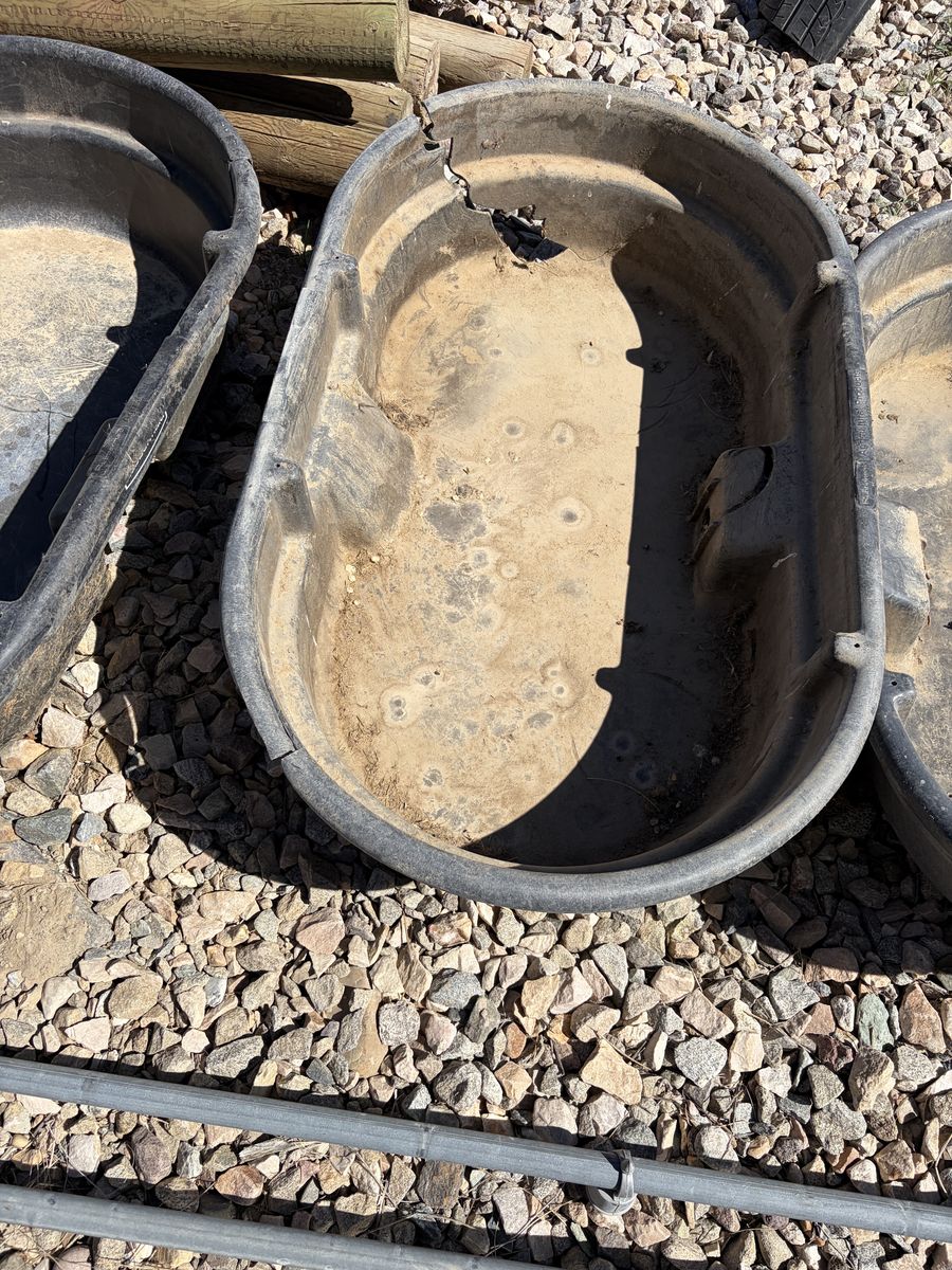 3 - 50 gallon plastic feed tanks. All have a few holes from being screwed to the floor. 2 have some cracks.