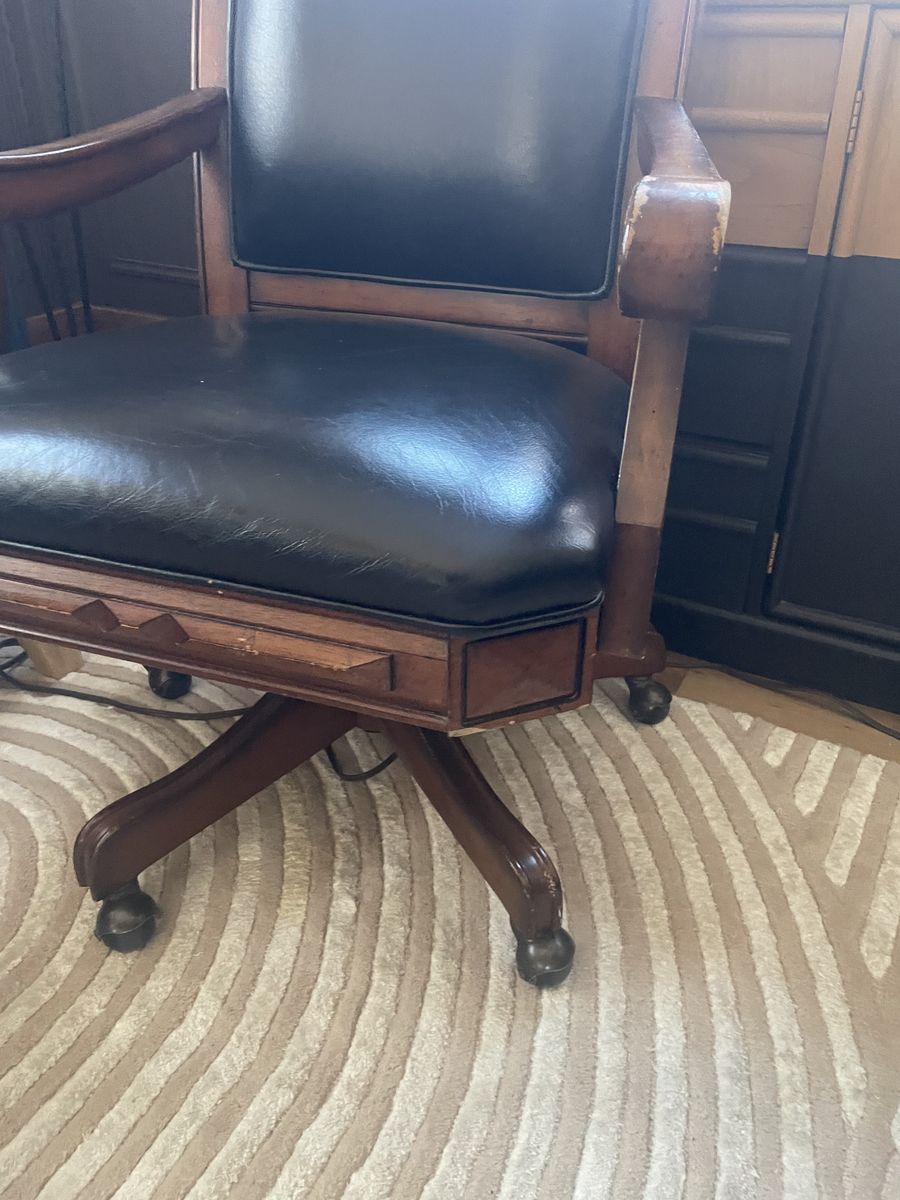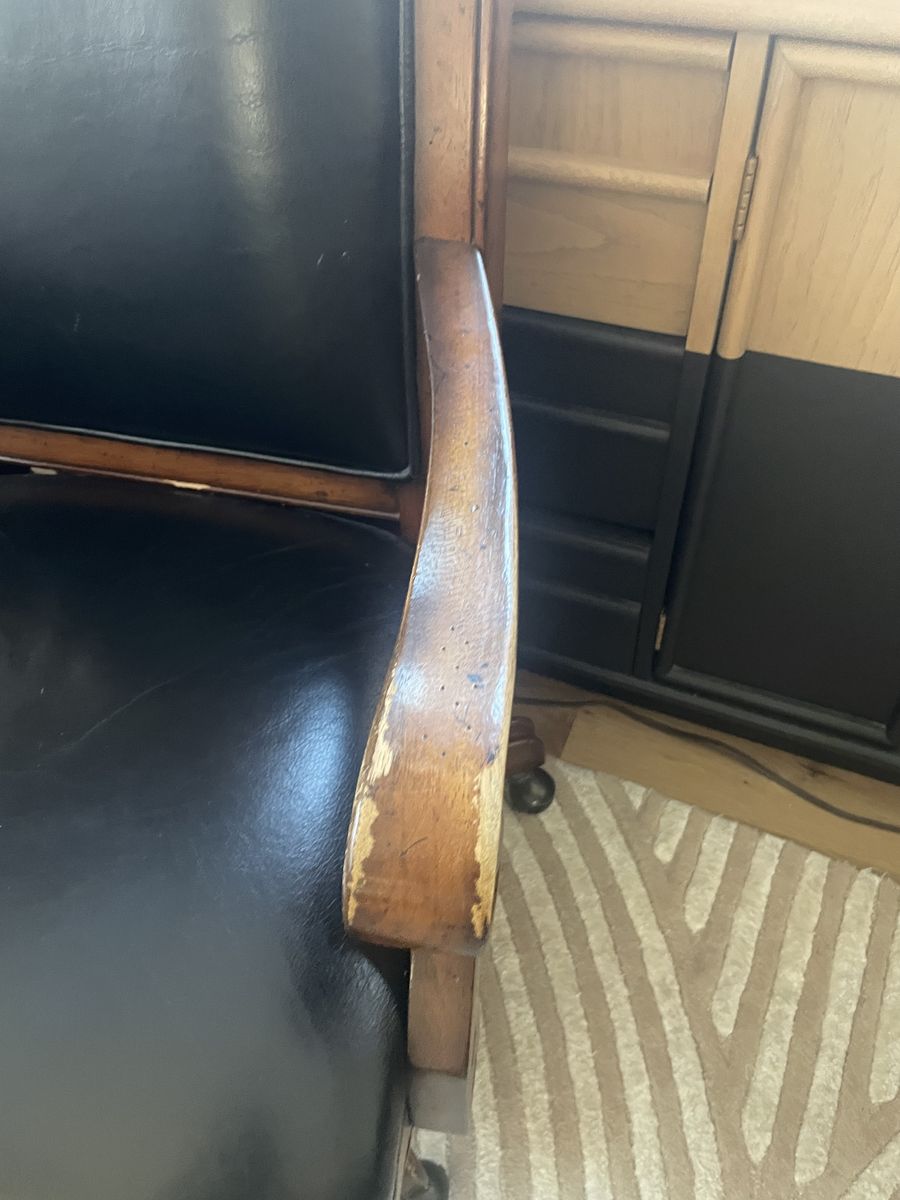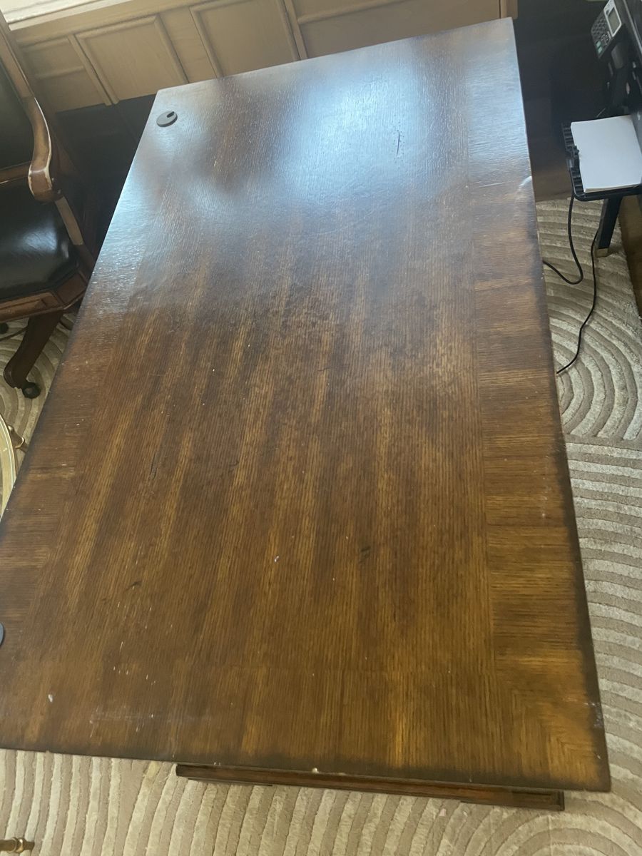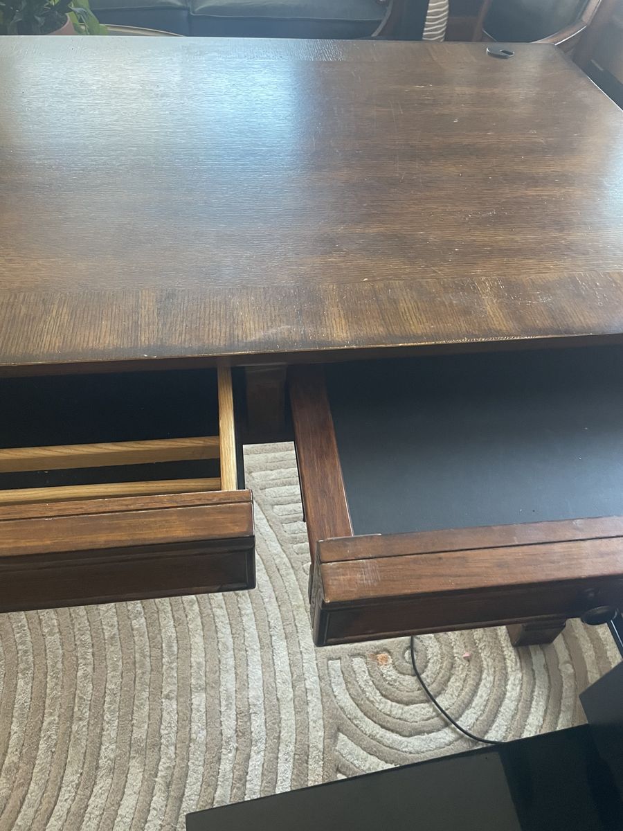 Condition: Structurally excellent. Cosmetic wear consistent with normal use, including surface marks on the desktop and visible wear on chair arms (see photos). Does not affect function.