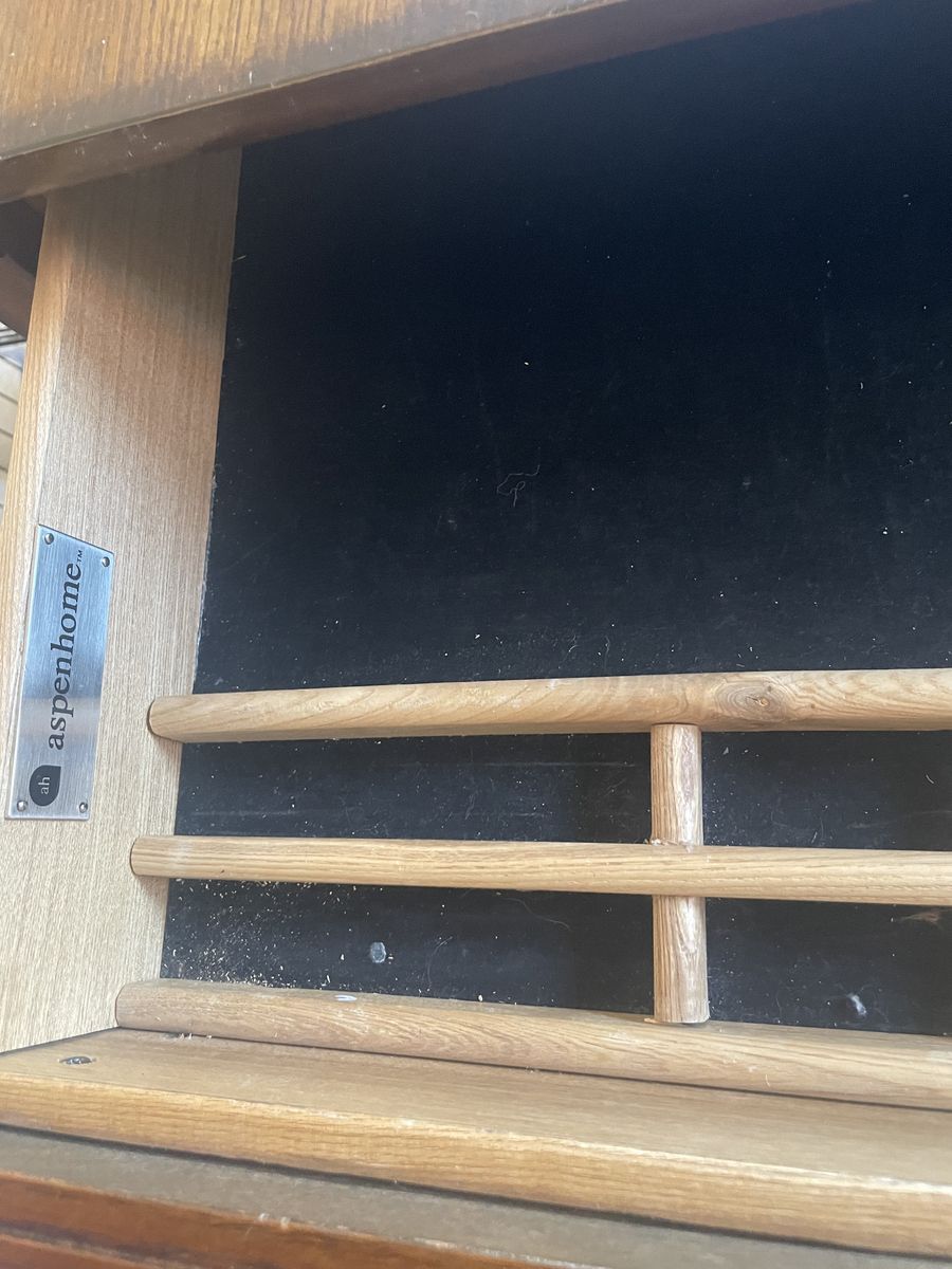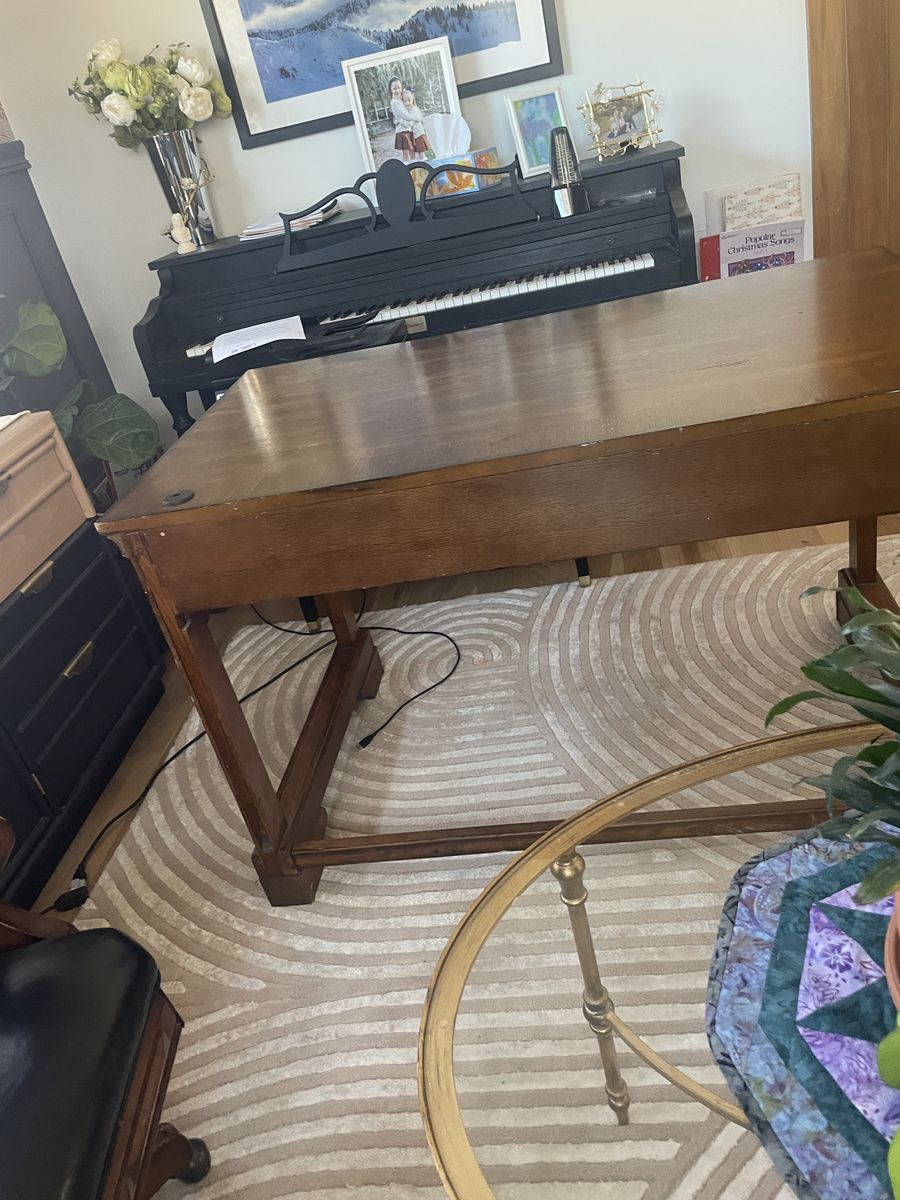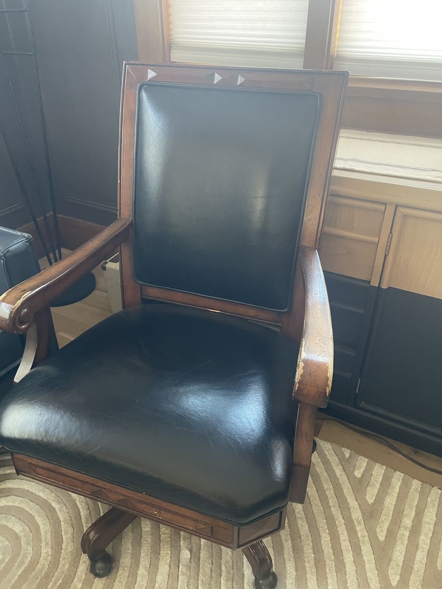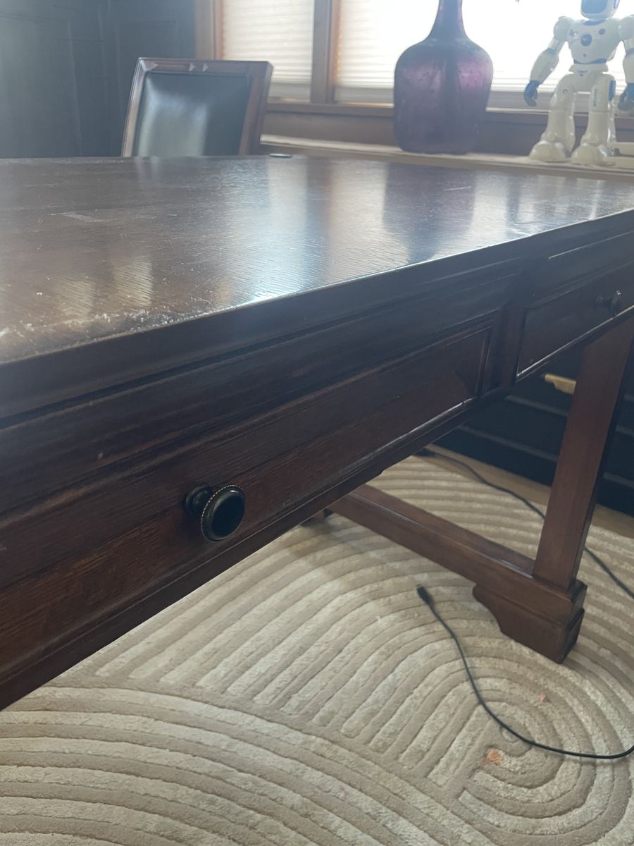 Beautiful, substantial executive desk and matching rolling armchair from Aspenhome, originally owned by a single family. Classic traditional design with warm wood tones and clean lines—great for a home office that doesn’t feel like a startup folding table situation.