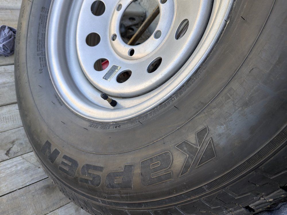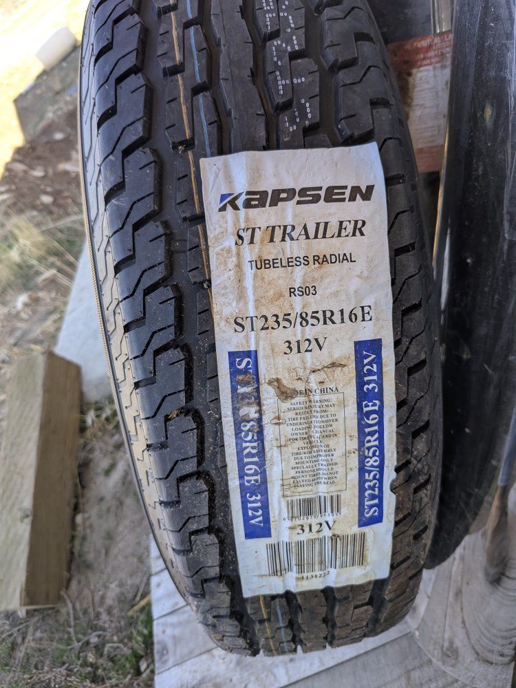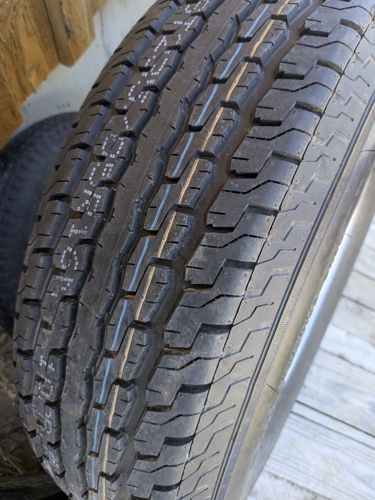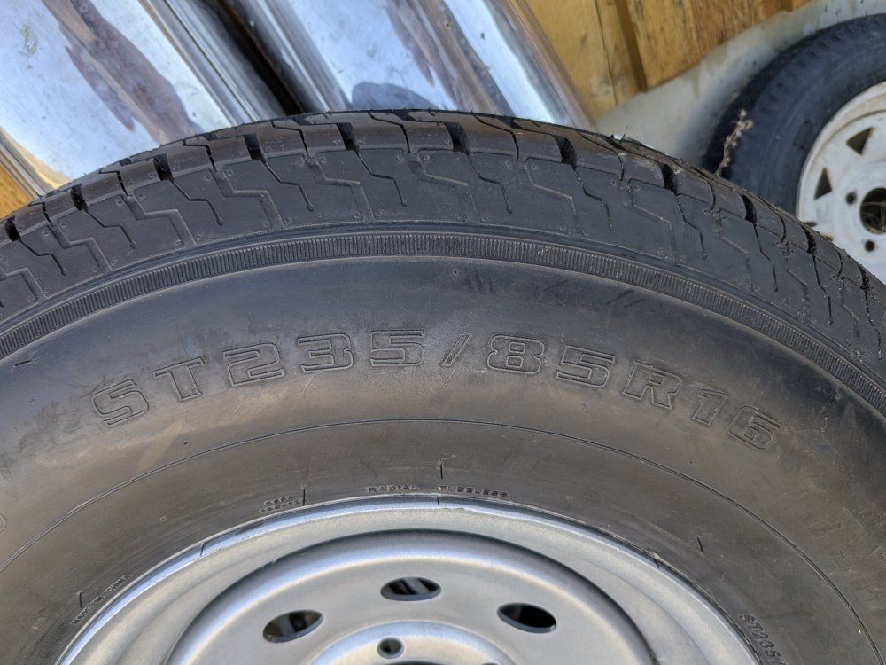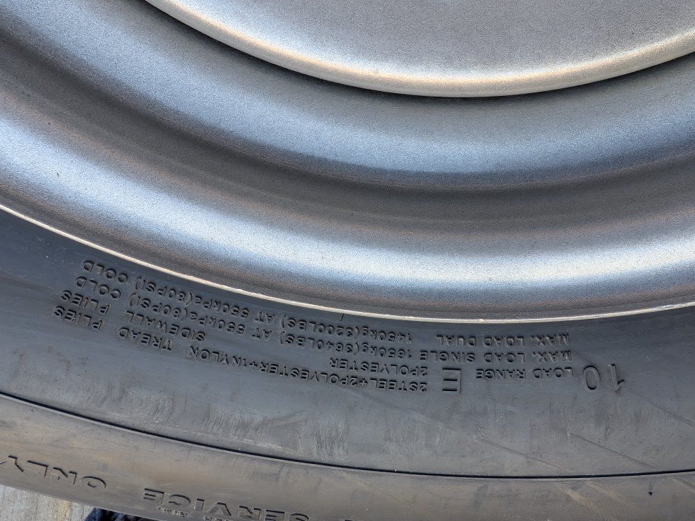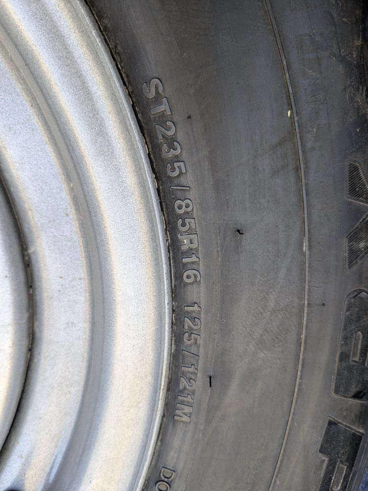 ZelleNew. 10 ply rated. 5 1/2" center to center bolt pattern. 5 years stored in a controlled environment. I'm in Fairview but come into the big city as needed and can meet you.