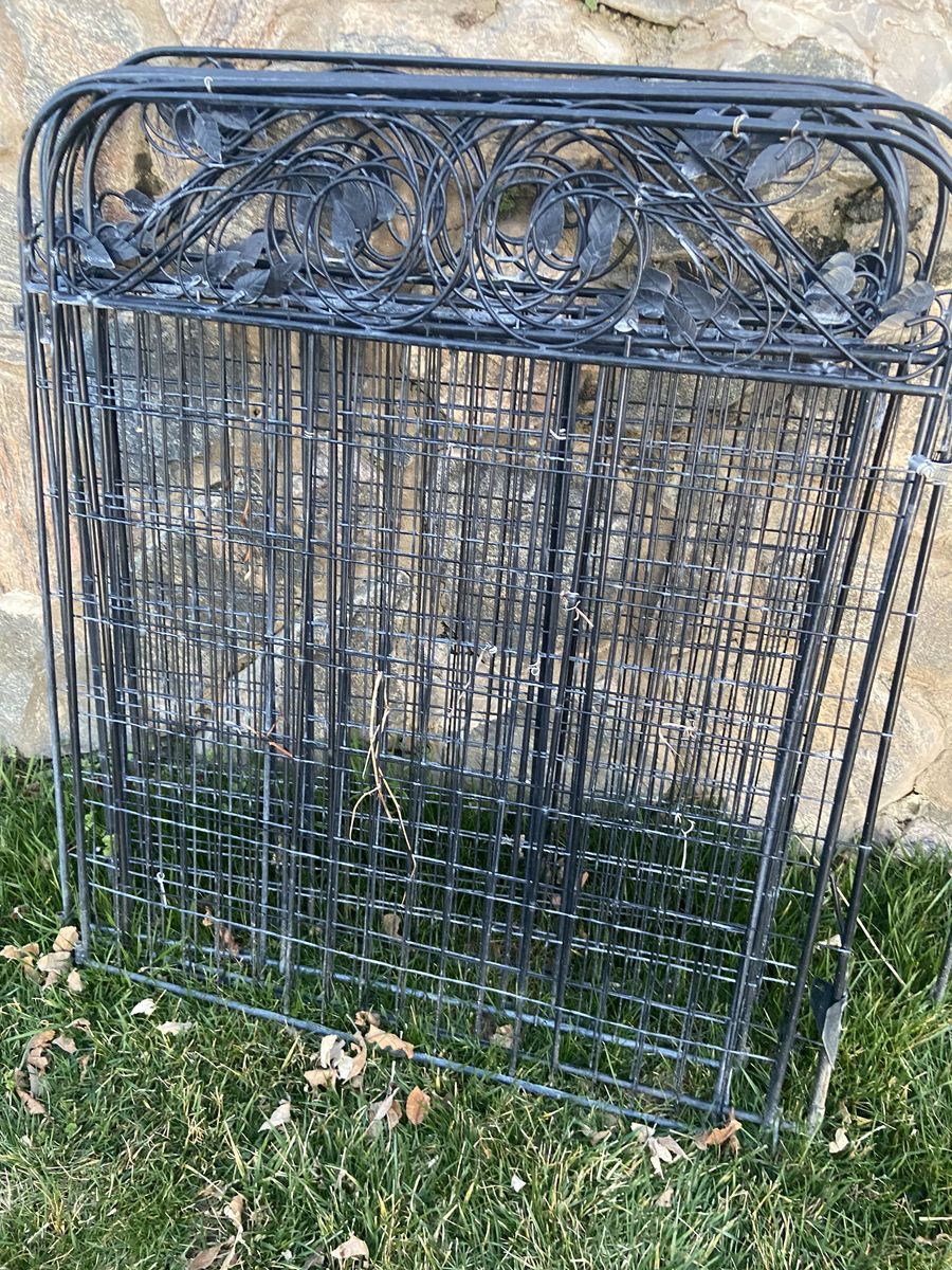 24 used decorative folding portable fence panels. Paid $25 each in 2021 on Amazon. Normal wear & surface rust. About 72 linear feet total length. Includes spikes to secure in ground. $150 OBO. Text is best.
