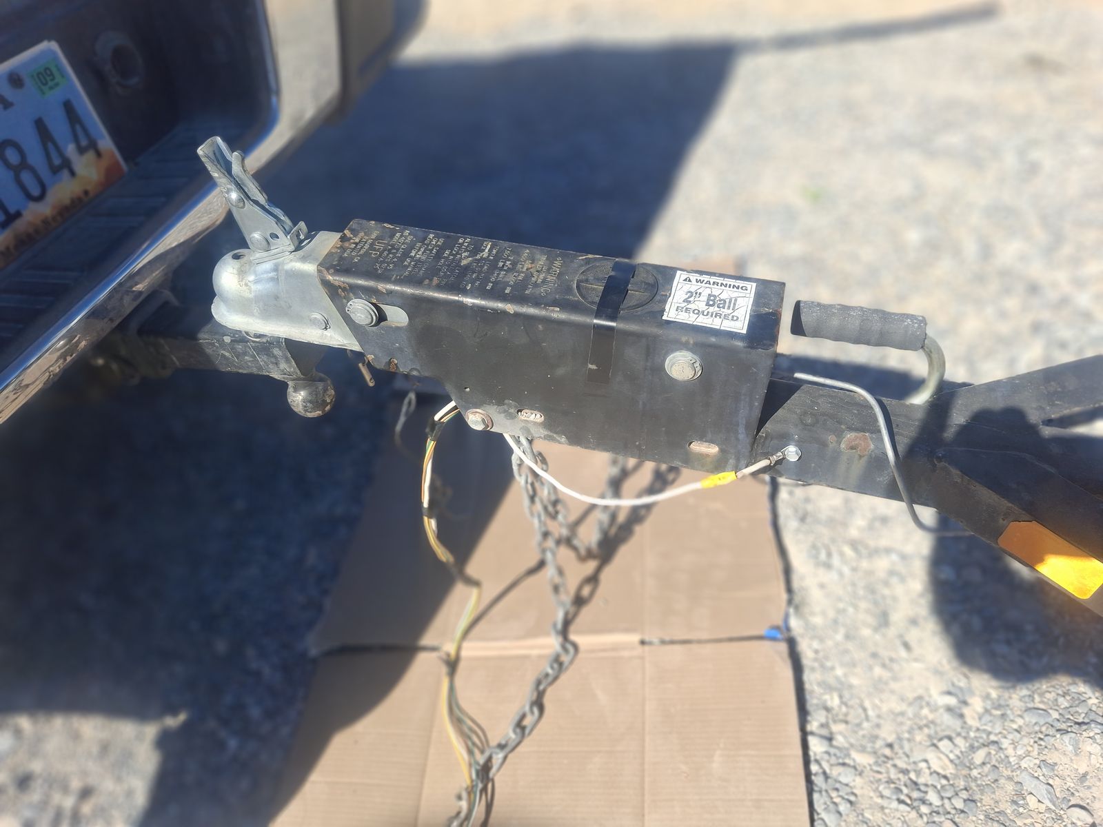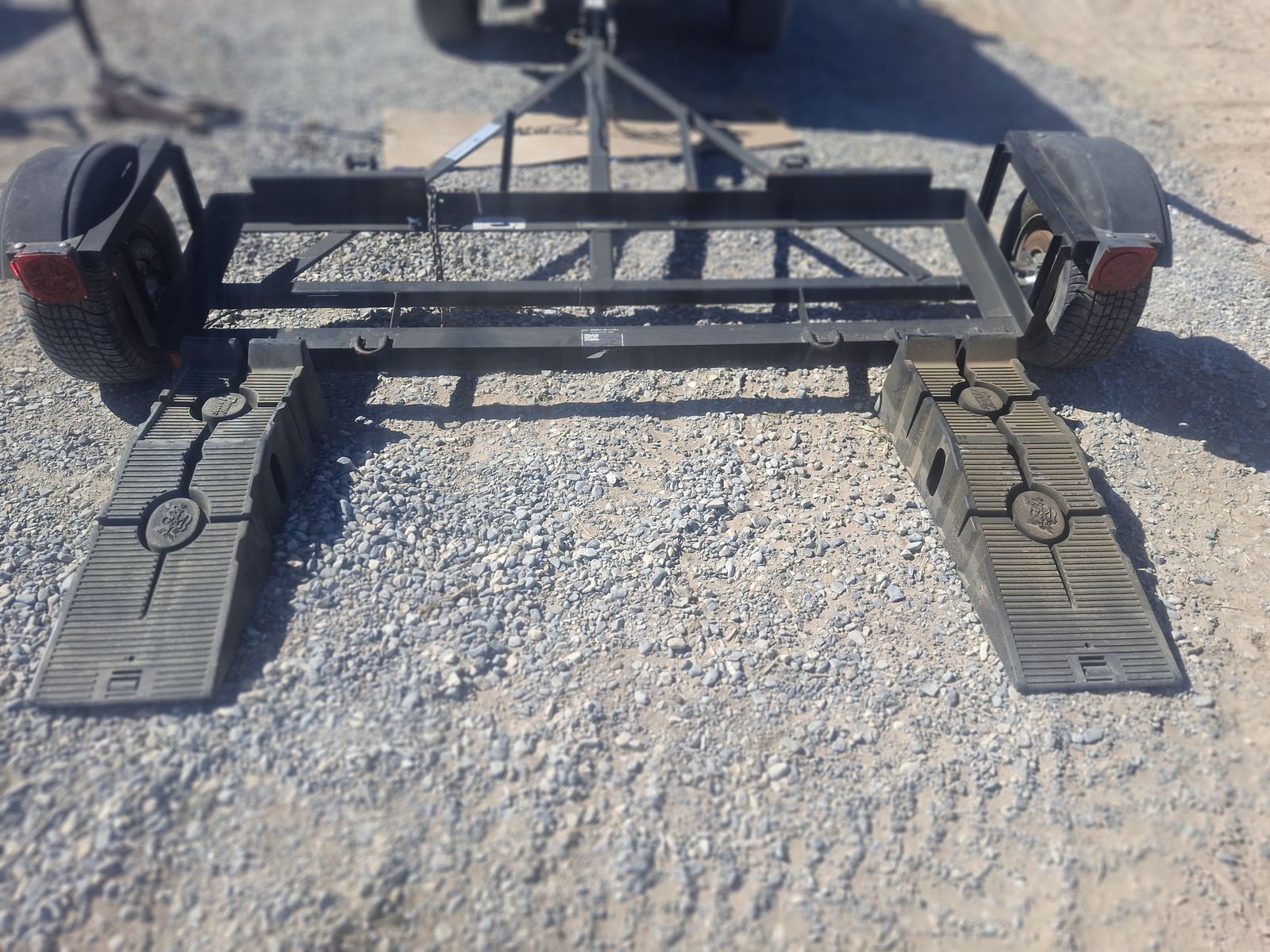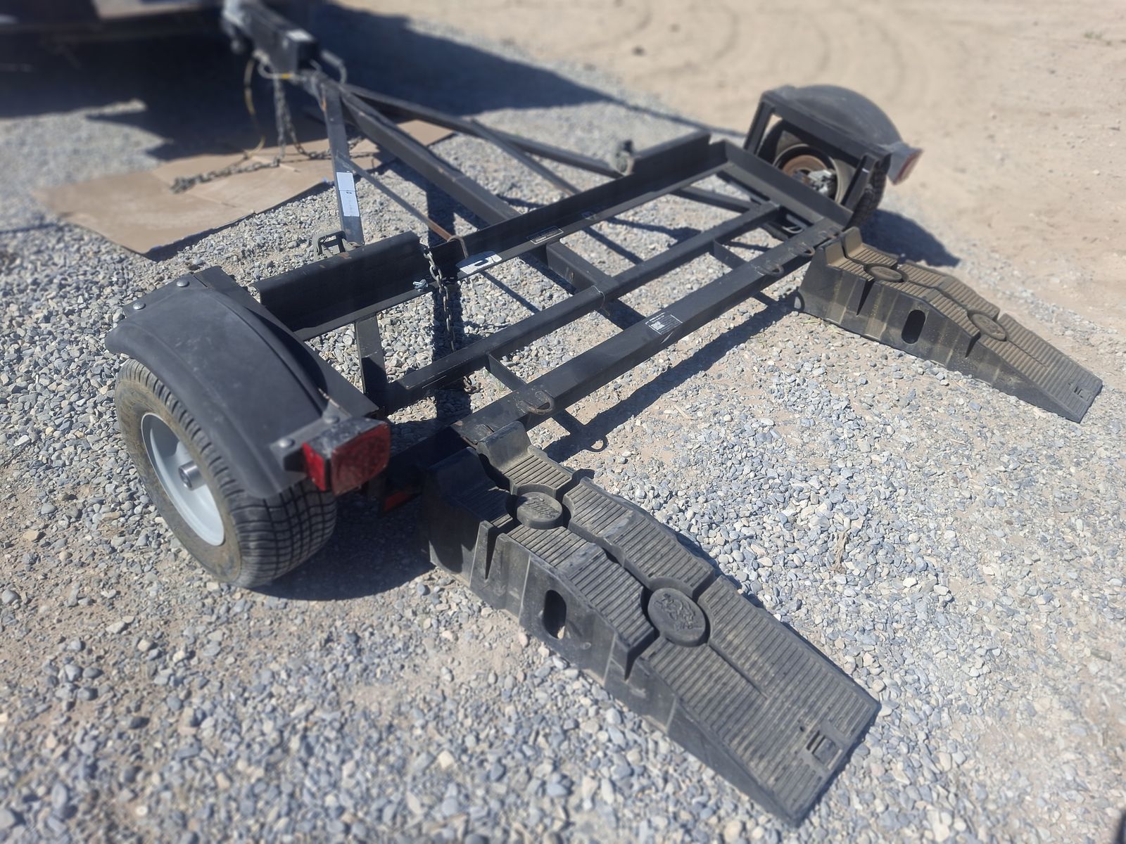 TOW DOLLY, READY TO USE, 80" EXTRA WIDE, TO HAUL PICK UP TRUCKS, WITH WORKING BRAKES, that work, NEW STRAPS, new spare tire, ramps, extra safety chain to hold car on the dolly, if the straps break, it has extra-long safety chains, and a long light wire, if a longer receiver hitch is used, and it can be stored standing up on it's back end (to save room). IN PAHRUMP, NV. 920 279 6504