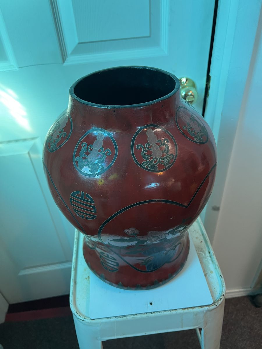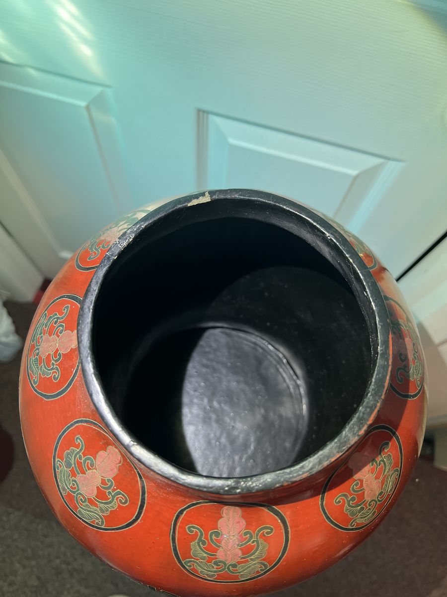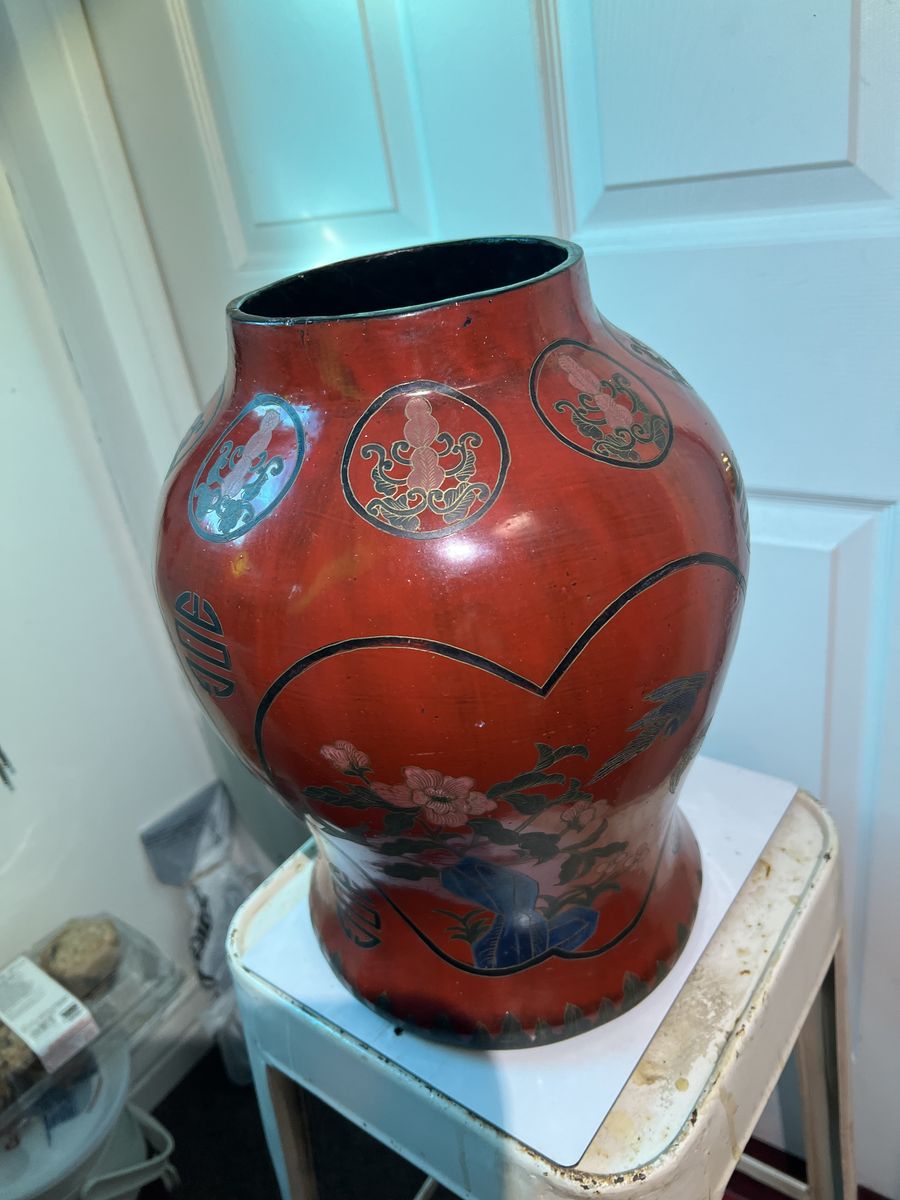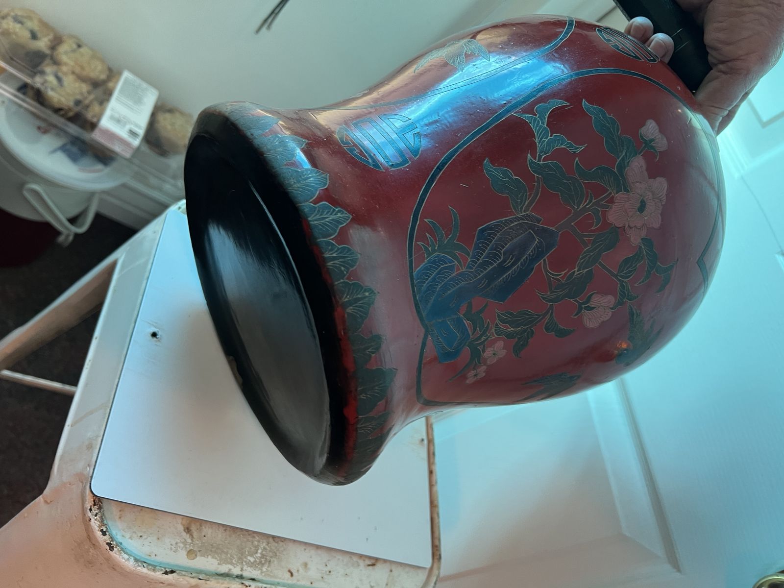 With Lid. 17" decorative Chinoiserie vase. 17" high x 10" wide at its widest point. Base is 8.25" in diameter. Weight is 4.25 lbs. Excellent overall condition. I will put up a video later when I get better light.