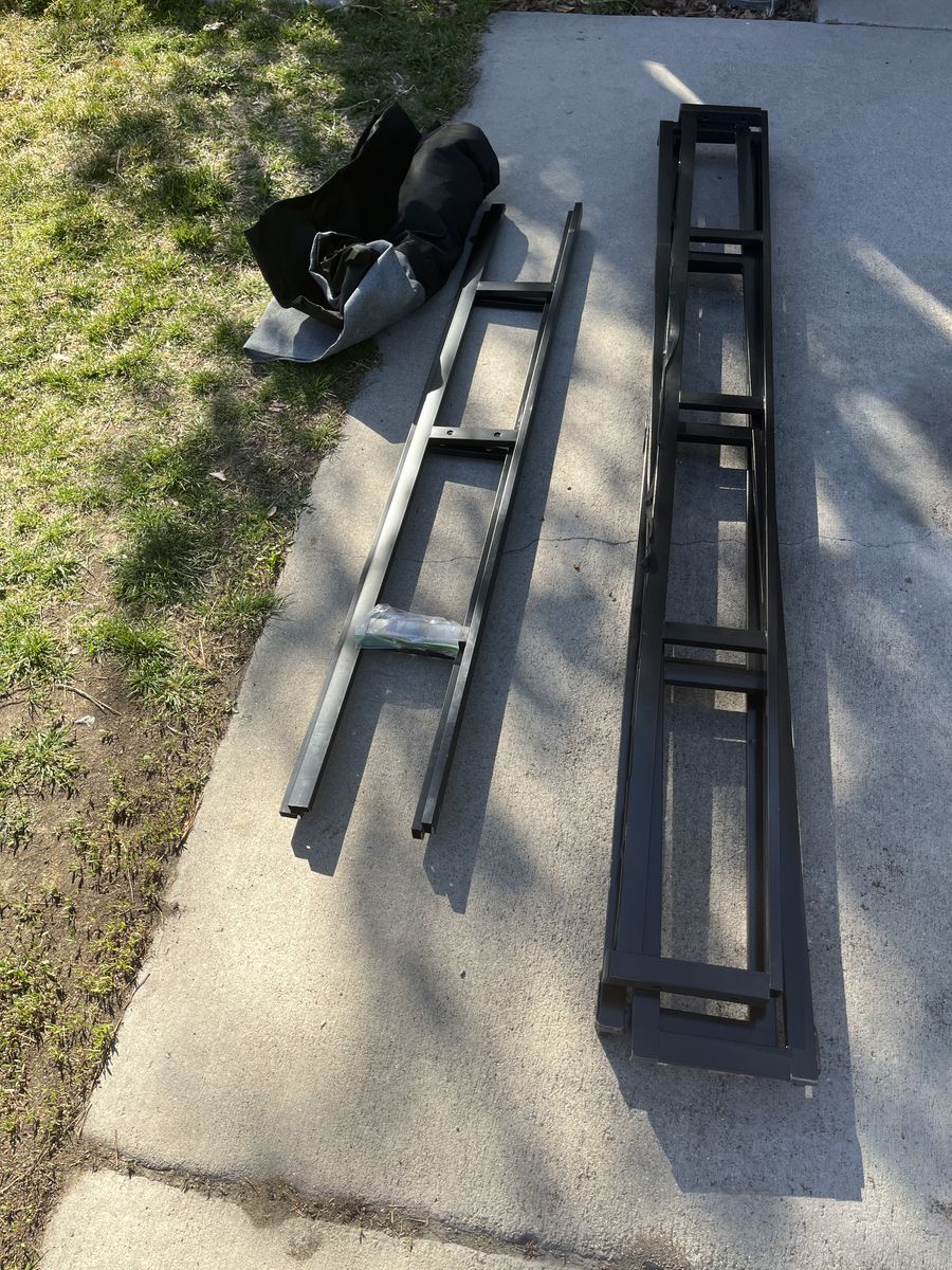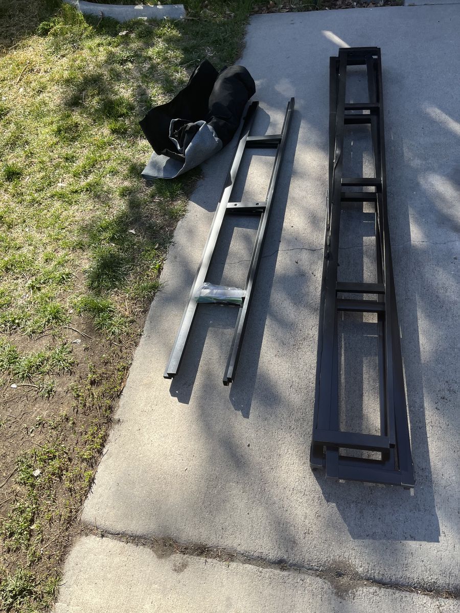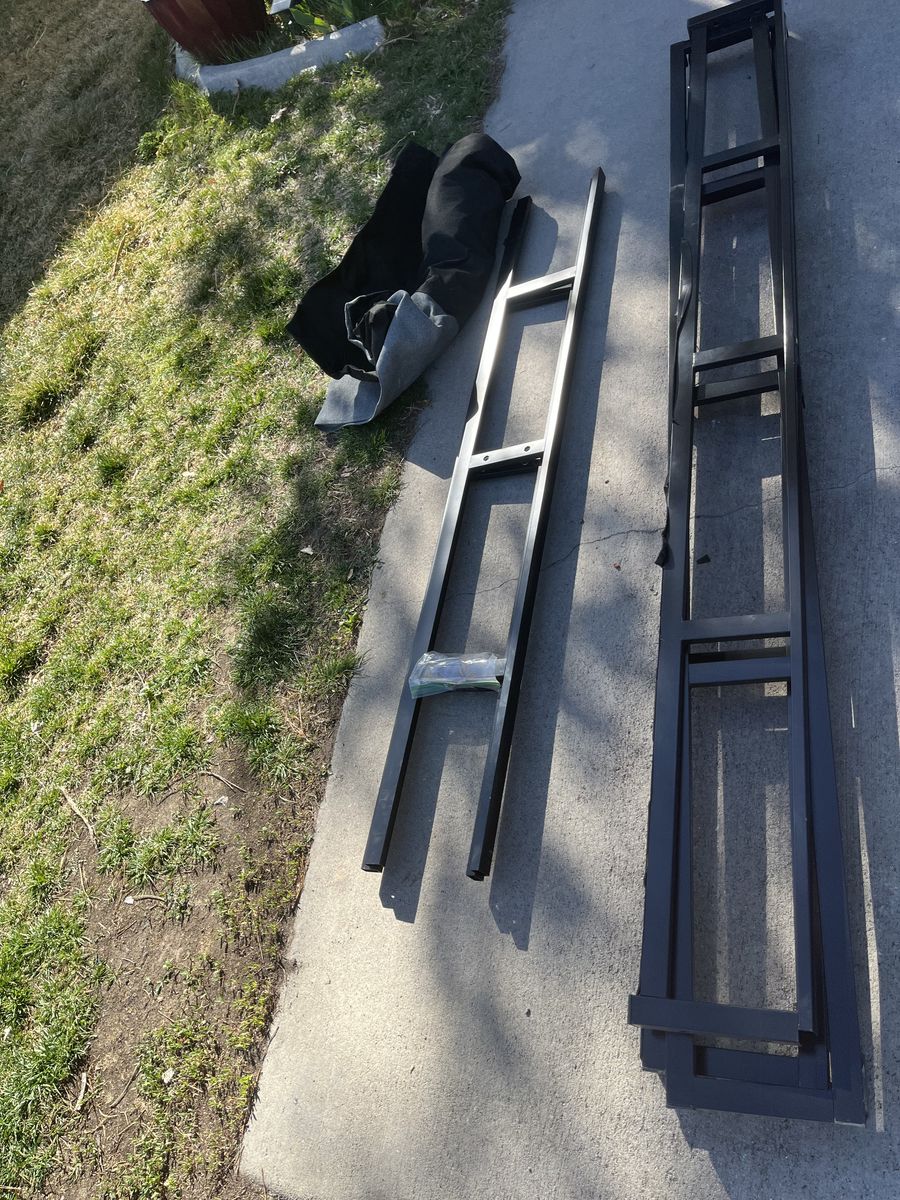VenmoQueen bed frame sits on the floor. In the past a couple of the wood slats broke but we just replaced them with wood from Home Depot works fine. Has the cover which I believe is a little ripped in one corner but all in all works fine. I don’t have a picture before we took it down because we didn’t think about that but all the pieces and hardware are here. Text 801-503-1926