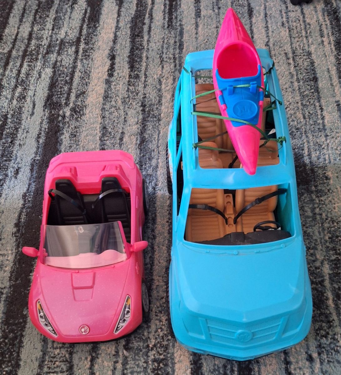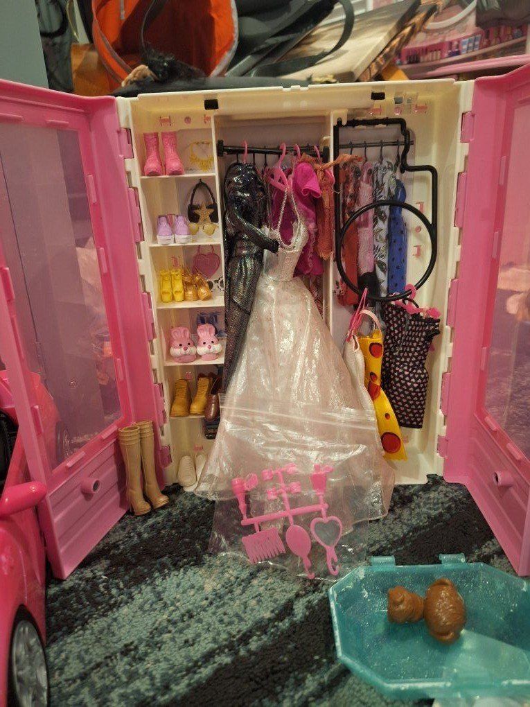 Included: 5 adult dolls 4 Chelsie/Kelly dolls Table w/chairs and kitchen accessories 24 womens outfits (many new) (not including what they have on) 3 additional Ken outfits Accessories, accessories, accessories Shoes from high heels to tennis shoes Stand alone closet A puppy bearing doggy w/3 puppies Small dog Dog bed A cat w/yarn🧶 Family pool Hanging swing Massive slide Portable slide Toddler pool with umbrella ️ Puppy pool Barbie Adirondack double lawn chair. TWO cars one pink sports car and ,one off road jeep type that seats four Pink and blue Canoe