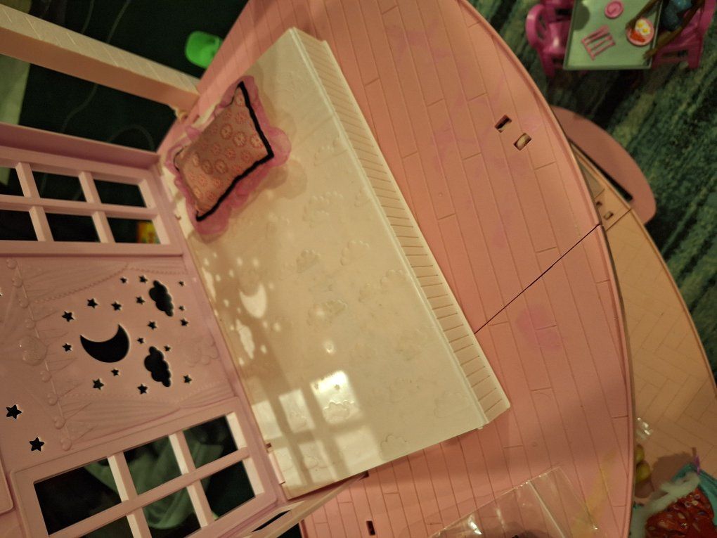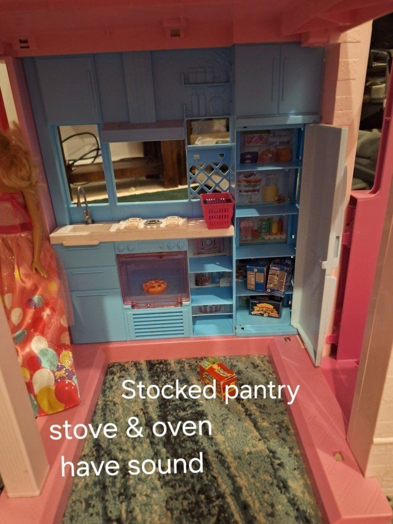 This is the mother load of Doll Houses! On the main level you will find a fully stocked kitchen, with a stove top and oven that have sound when in use. The foyer offers an operational door and pet door for the smallest of pets. In the living room you will find a nice comfy couch that seats at least two where watching a lovely fire while reading a book, or watching their favorite princess movie can happen. The second level offers a bathroom with an operational shower door, a potty that the lid can be lifted, and a spacious portable tub, that can appear and disappear as needed. The bedroom offers a sleeping area with a comfy chair a walk in closet and shelves that can hold tons of accessories and a make believe full length mirror. The upper level has an entertainment room with a full/queen size Murphy bed, with some awesome sky lights, so star gazing is a breeze inside or out. Who never had a dream of having a glass ceiling to star gaze before heading ogg to sleep. There is also access to the doggy park, and to the massive pool slide!. Outside will bring you a wonderful environment too. With the family pool that offers the massive slide as well as a portable toddler slide for all those littles. There is also a kiddy pool and a puppy pool. Last but not least there is a manual, but operational elevator to help get from one level to another.