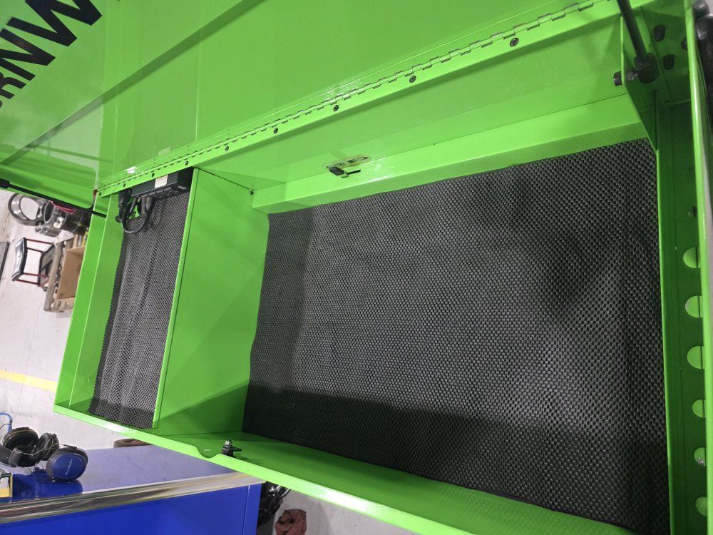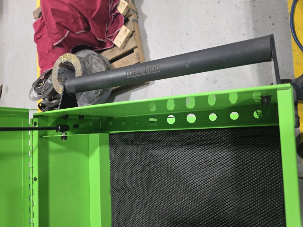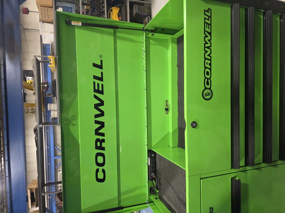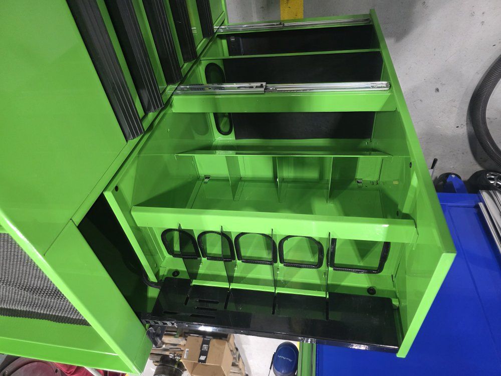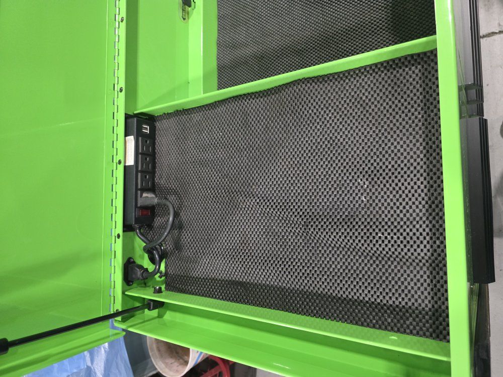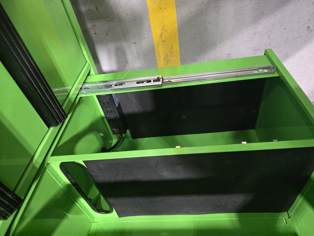 has power strip in top and in the power tool drawer. in good shape has a few scratches, minimal wear.