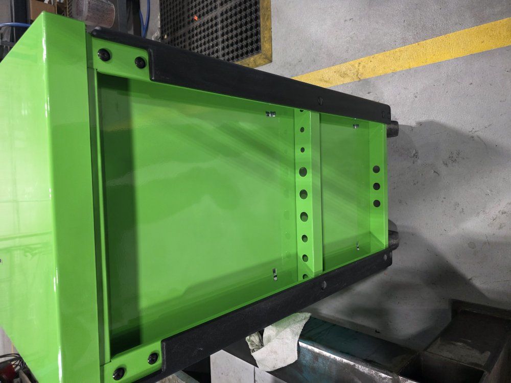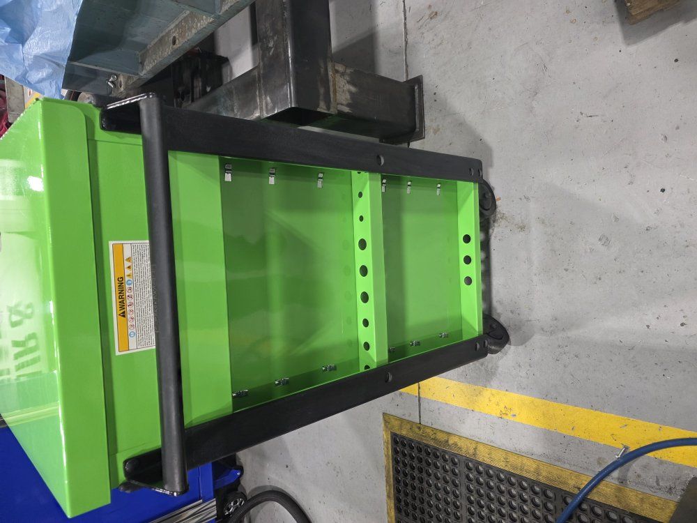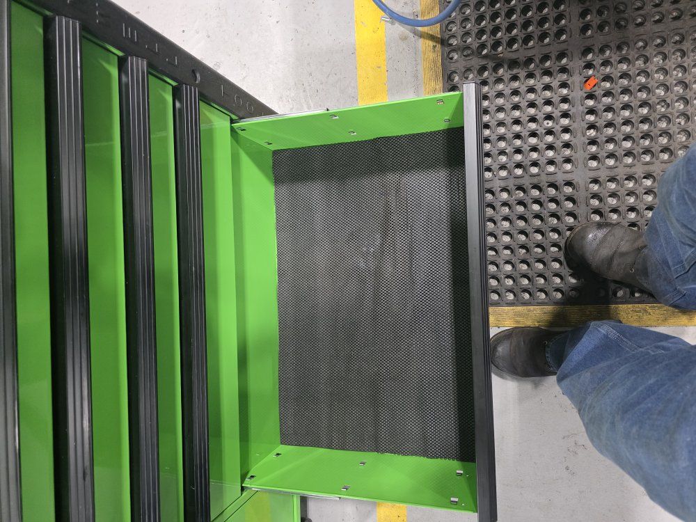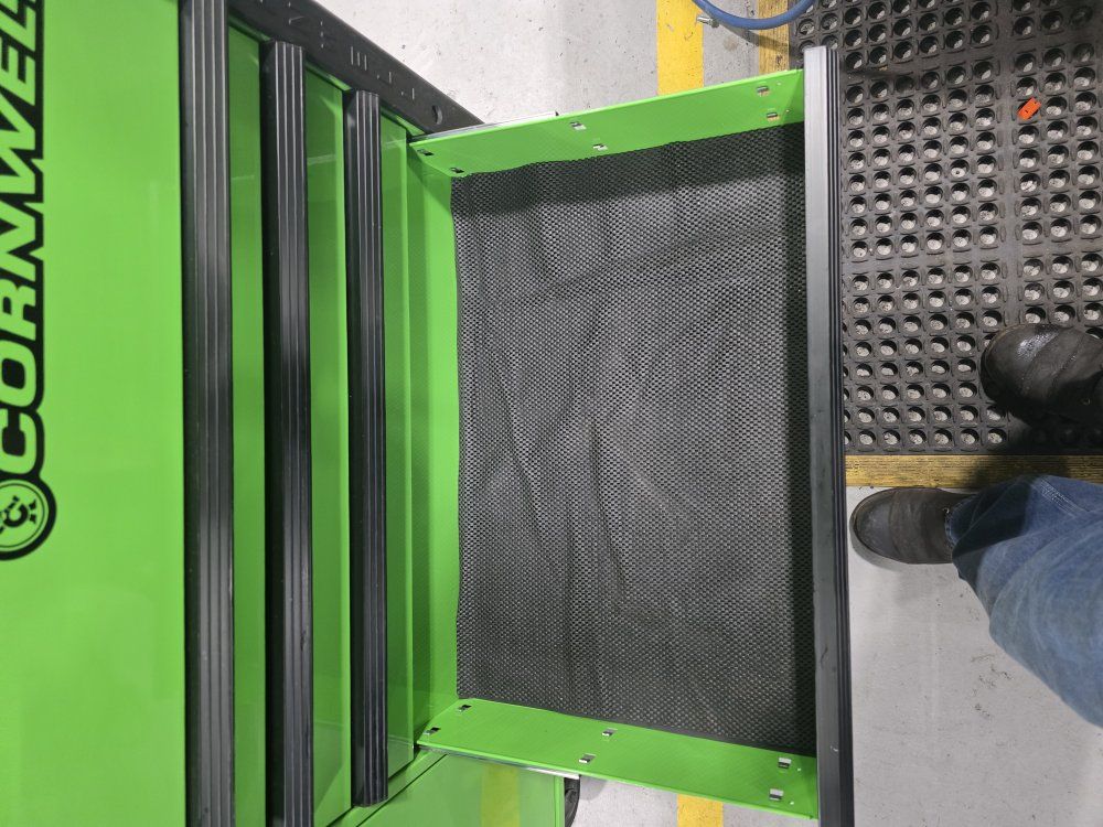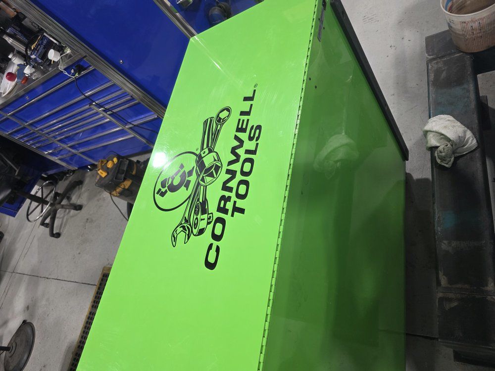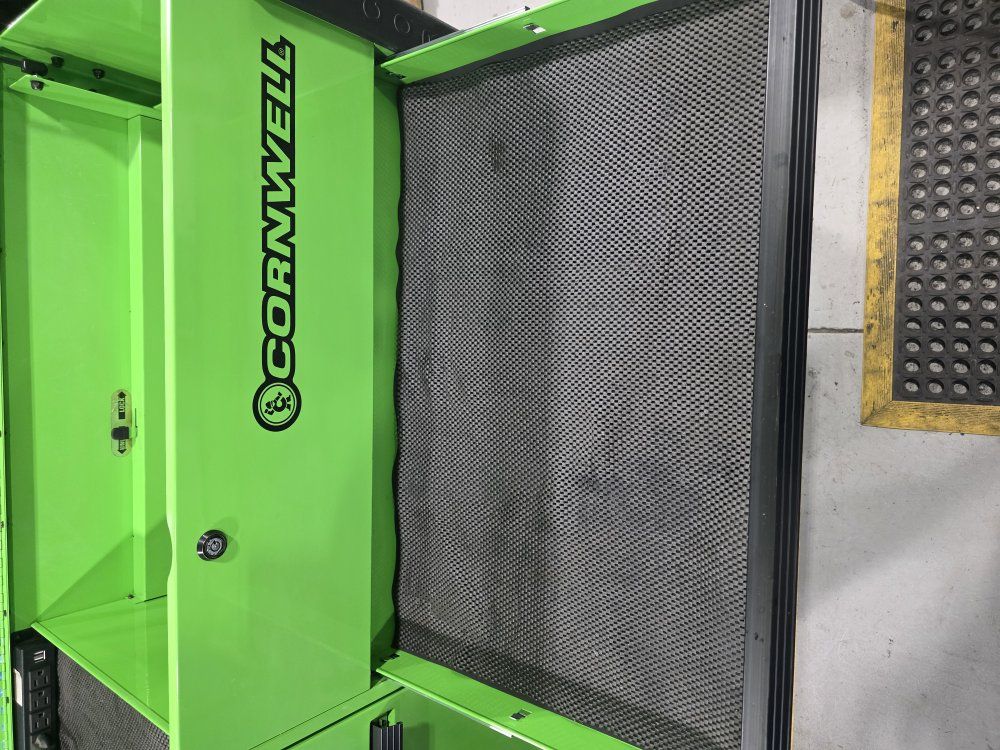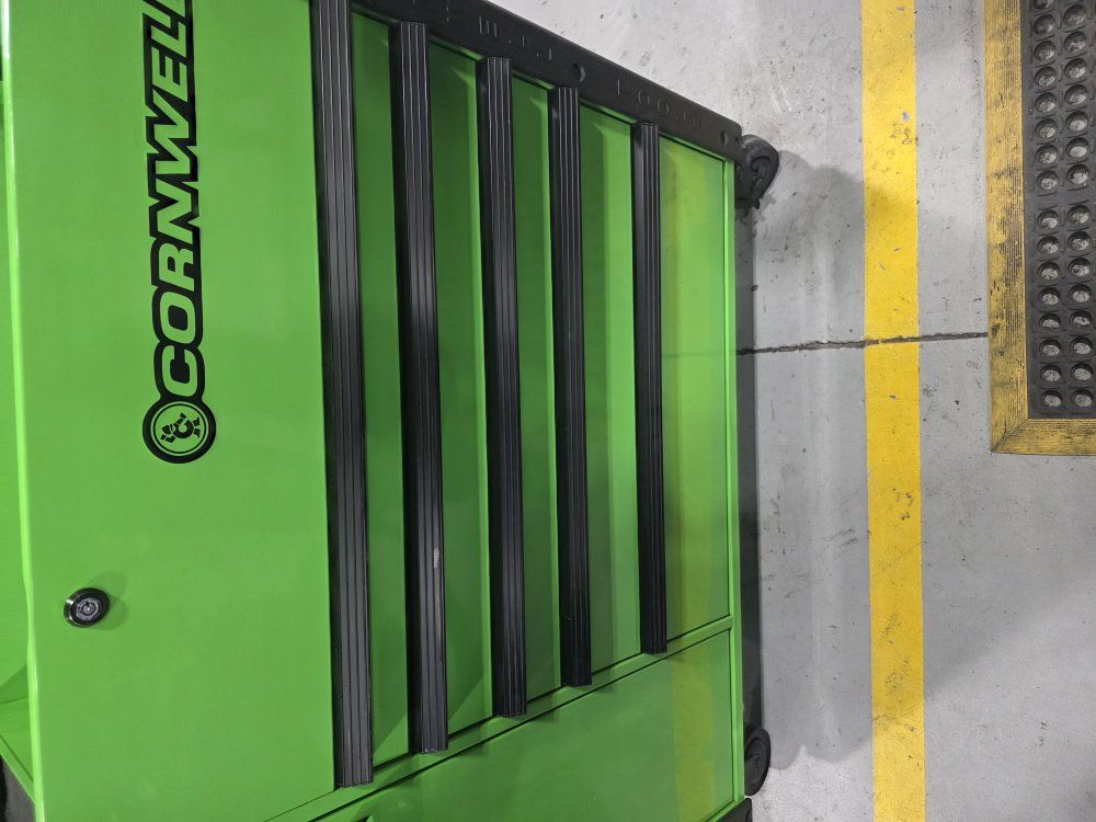 has power strip in top and in the power tool drawer. in good shape has a few scratches, minimal wear.