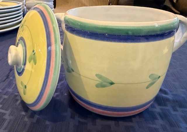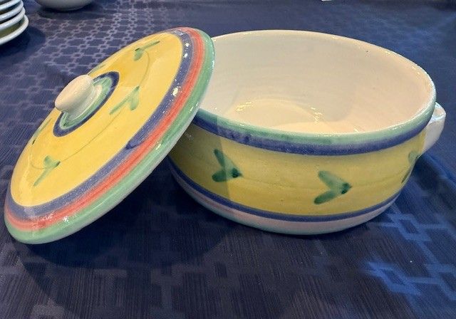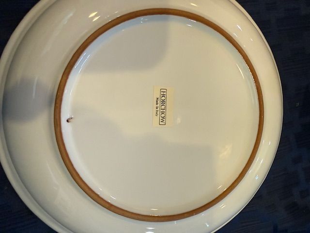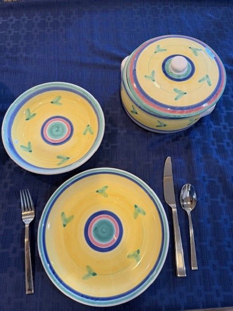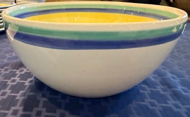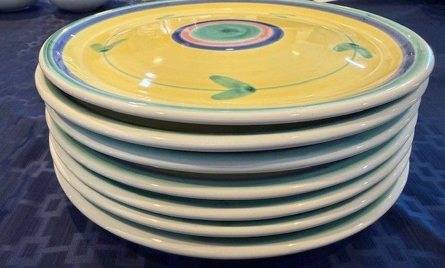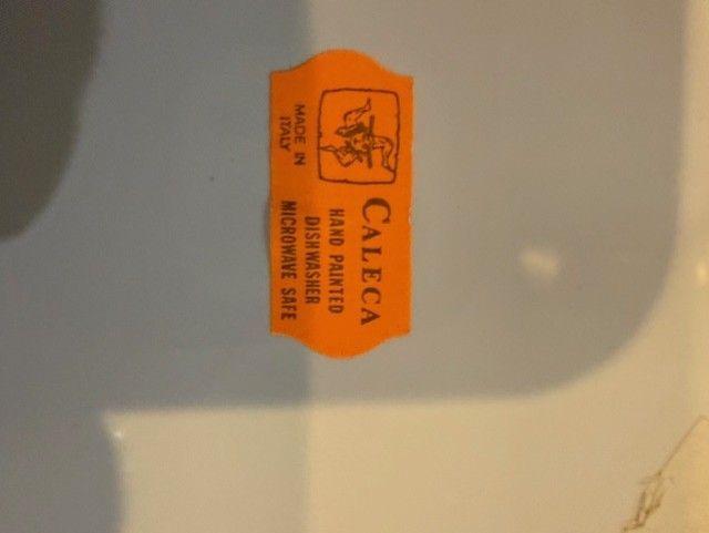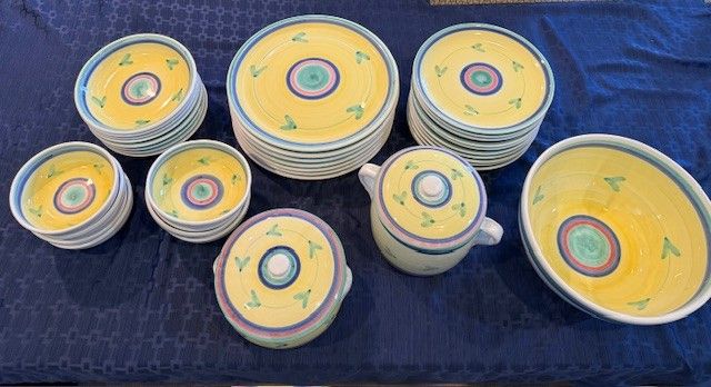 High quality, stamped from Italy. Bought as a large set and never used or put in a dishwasher. I have 7 different types/sizes of pieces and in parenthesis tells how many of each item and then the dimensions: 1. Huge Mixing Bowl (1), 11.5"x 5.5" 2. Cookie jar w/lid (1 set), 6.5" x 6") 3. Casserole Dish w/lid (1 set) 4. Serving Plates or Huge Dinner Plates (7), 12.5" and flat 5. Regular-sized Dinner plates (11), 9.5" 6. Large Salad Bowls (8), 8.5"x1.5) 7) Small Bowls (8) 6"x2" There is a total of 39 pieces of pottery. I prefer to sell it as a set, but I might be able to sell piece by piece. I put $100 in the price just because they make you put something there. Perhaps $100 for a small and large plate, small and large salad bowl. Better pricing when you buy more.