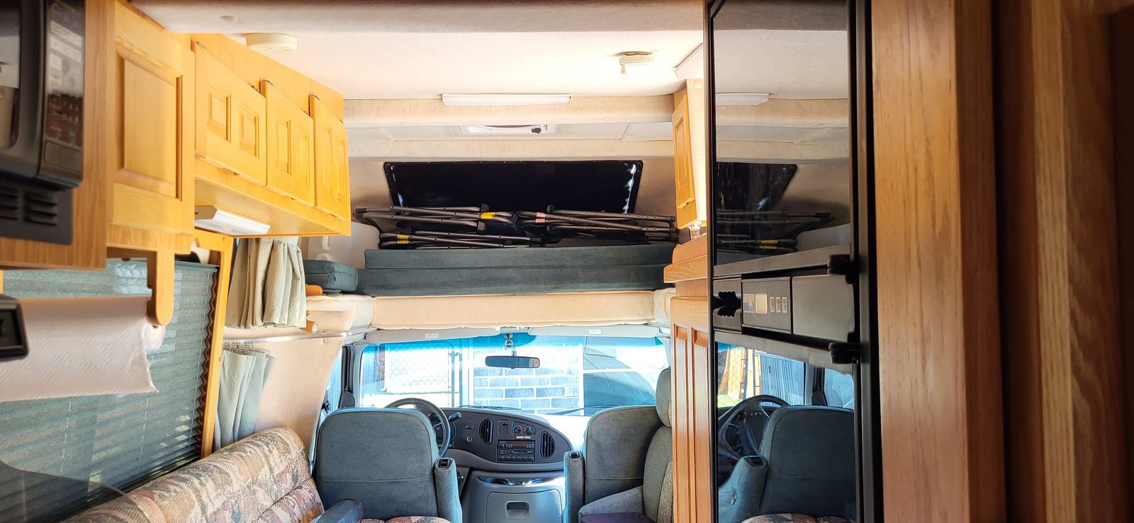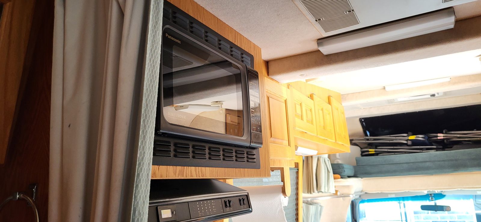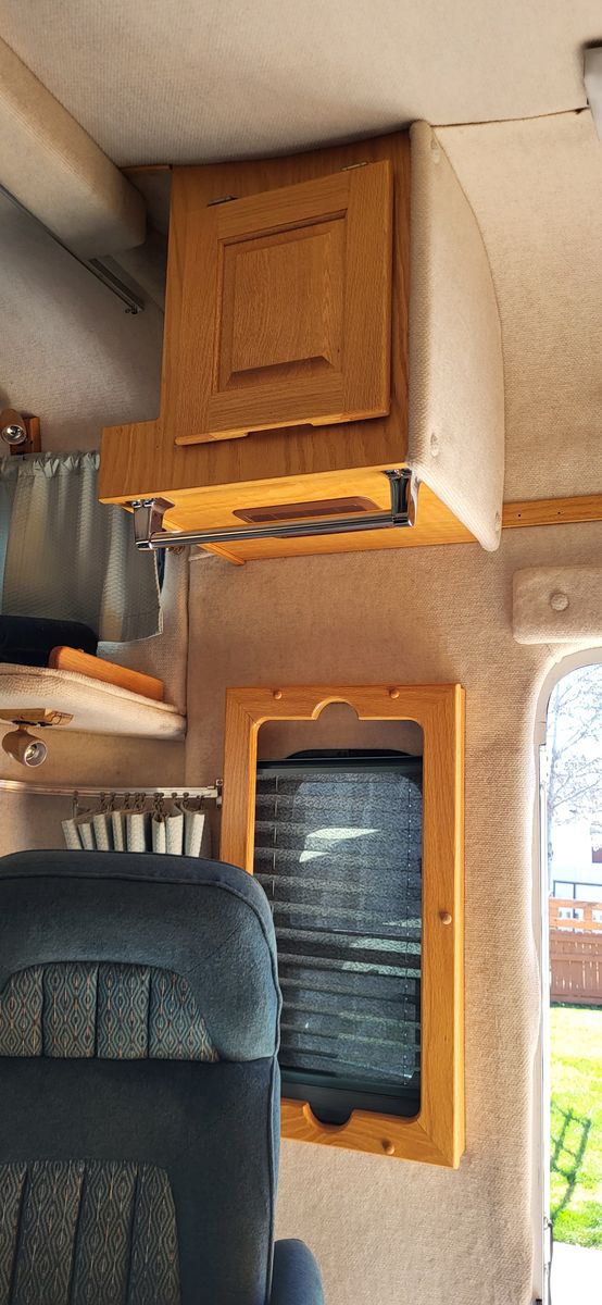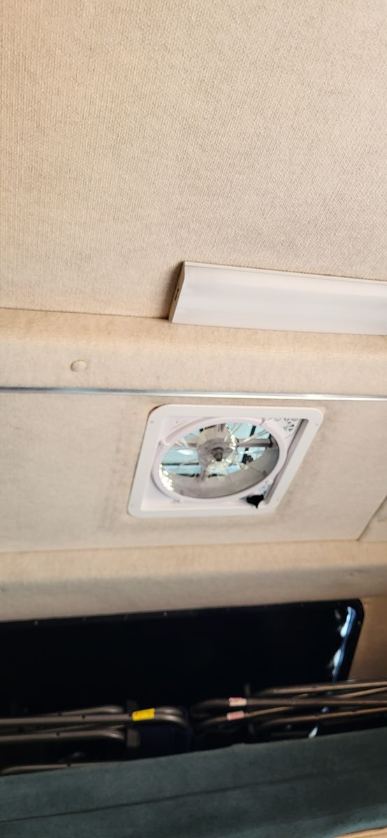 We upgraded the coach ceiling exhaust fan to a MaxxFan Deluxe 7500K smoke cover motorized remote controlled 10 speed fan, reversible for exhaust or intake air.