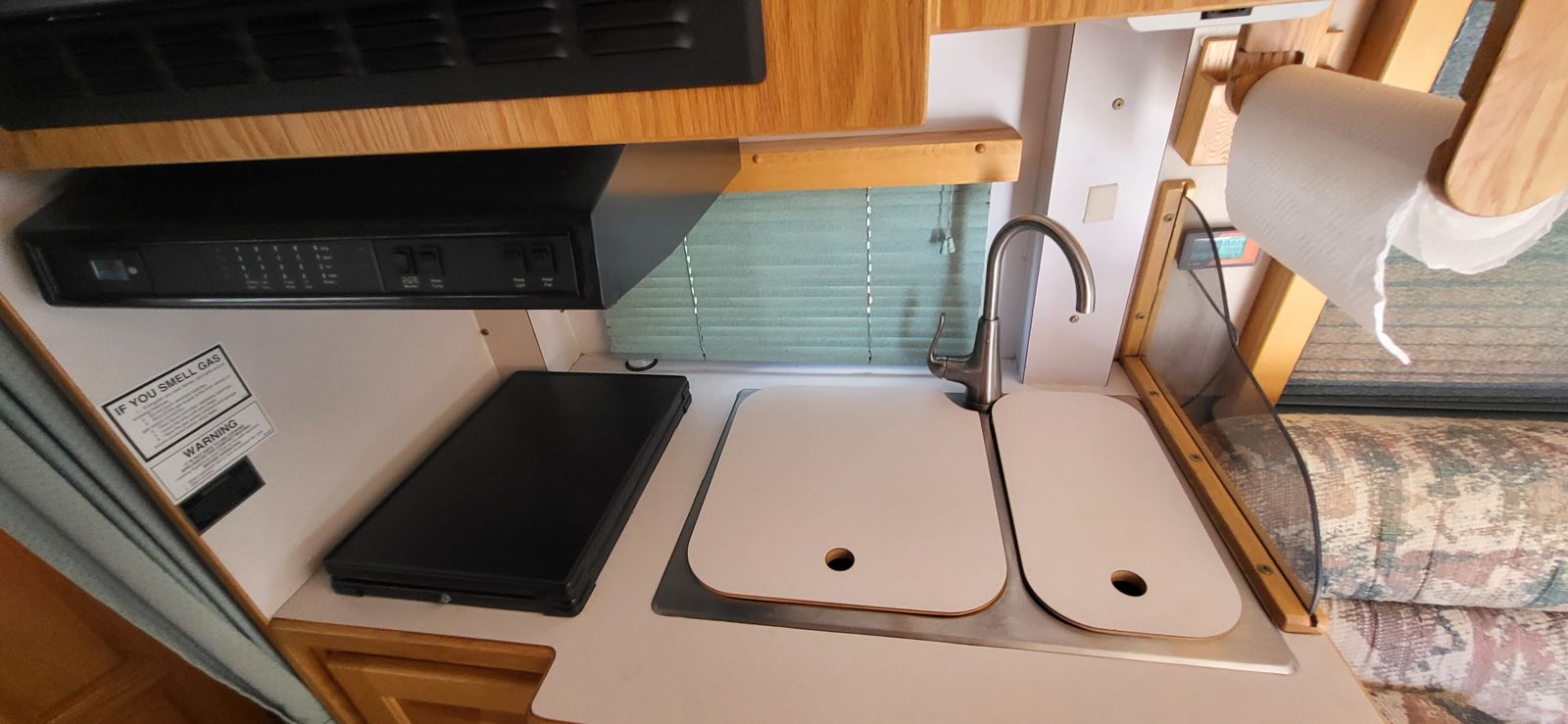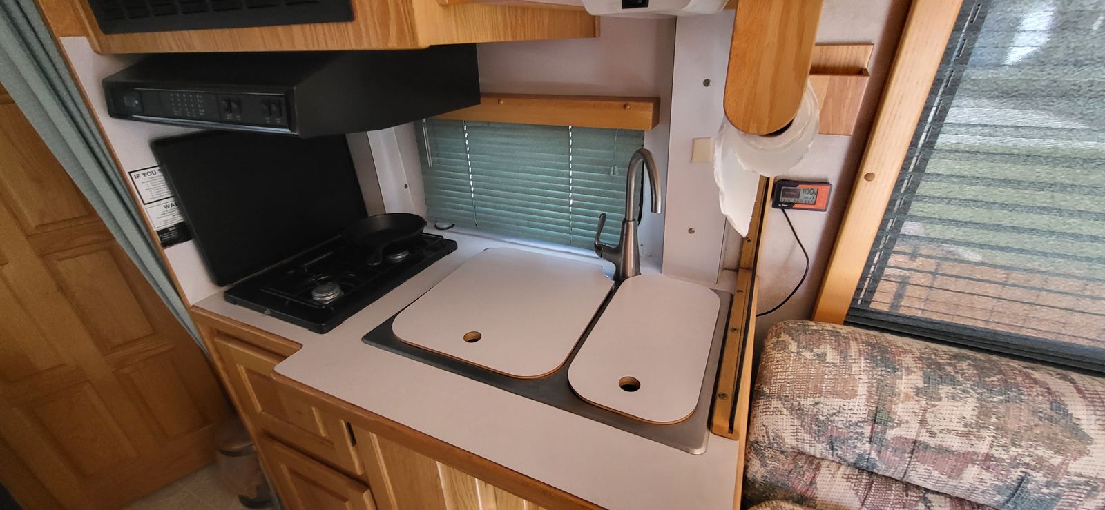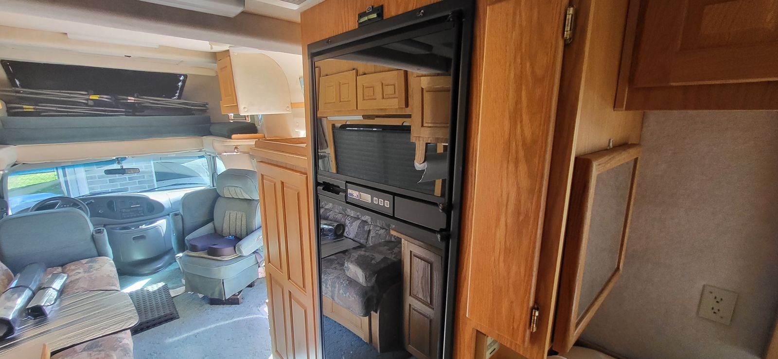 We upgraded the coach ceiling exhaust fan to a MaxxFan Deluxe 7500K smoke cover motorized remote controlled 10 speed fan, reversible for exhaust or intake air.