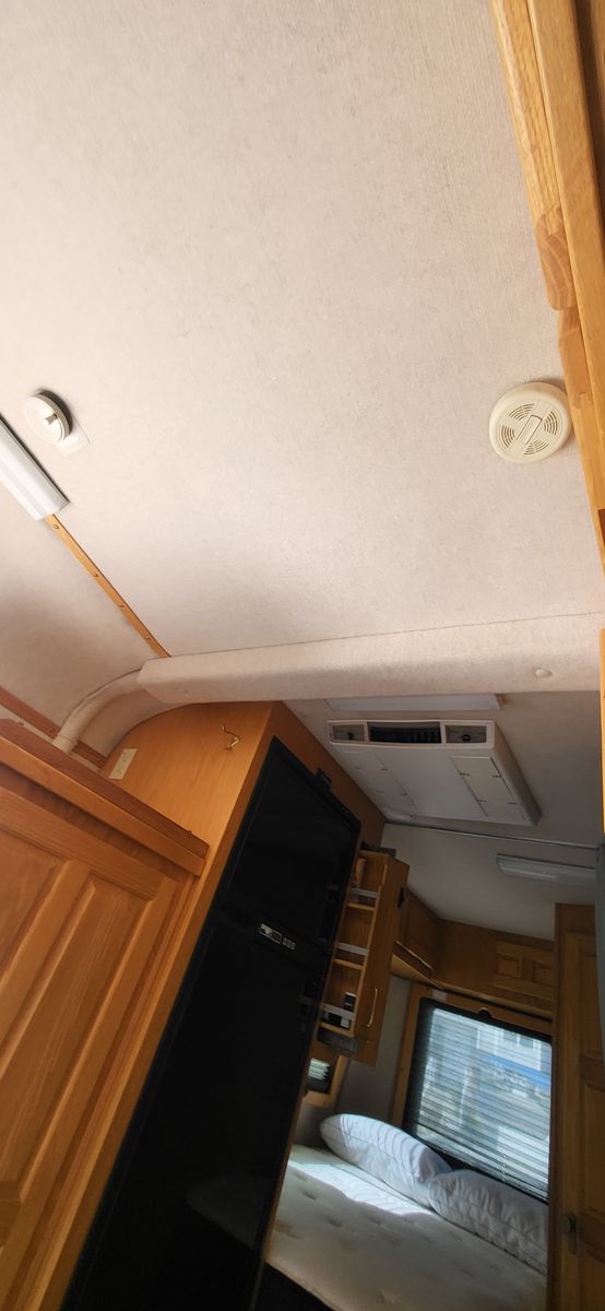 She's a solid fiberglass bodied coach. No roof caulking, roof tape or membrane concerns. She was a top-of-the-line Motorcoach for her day, constructed with two integrated real roll bars. See them when looking at the inside AC unit & MaxxFan unit.