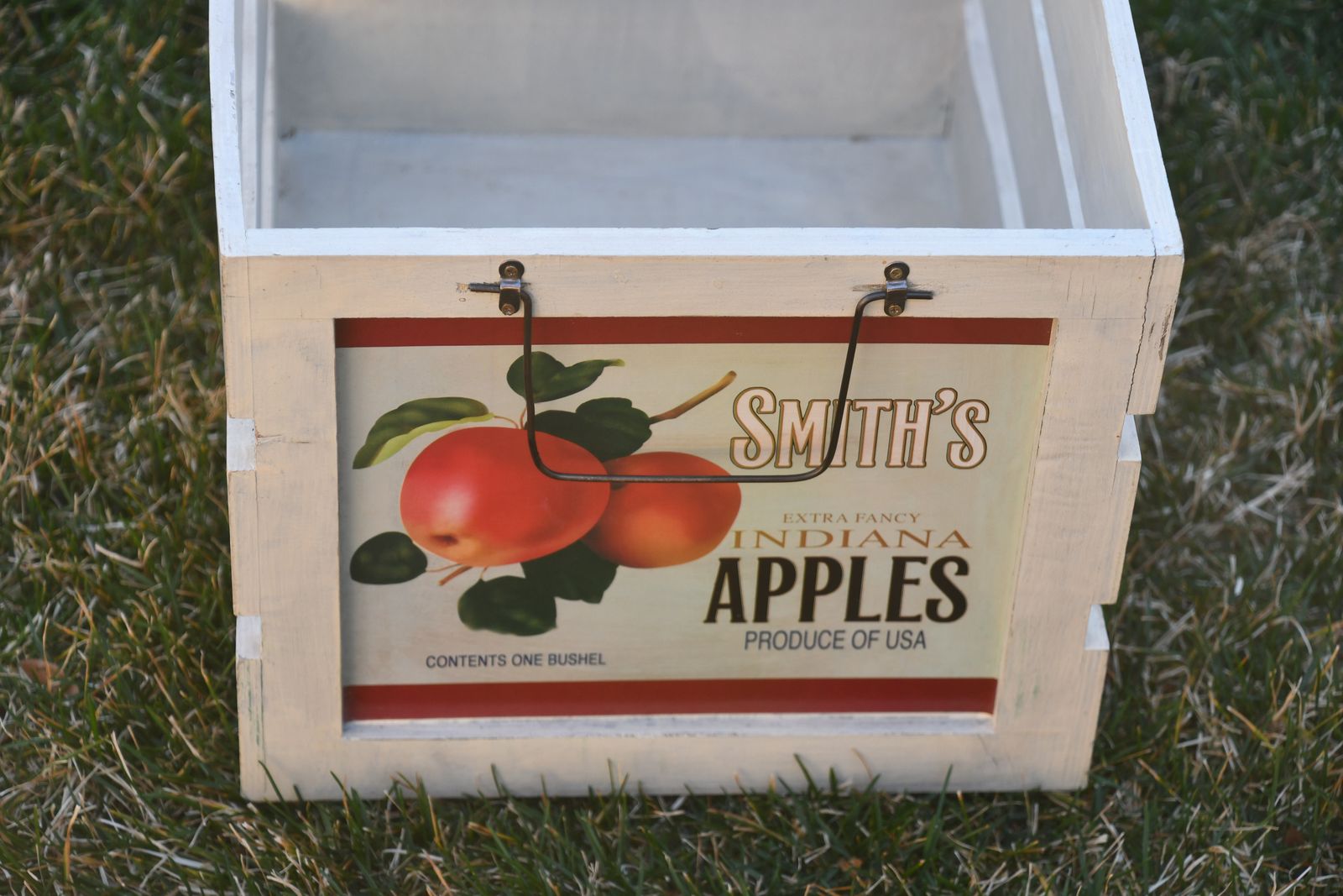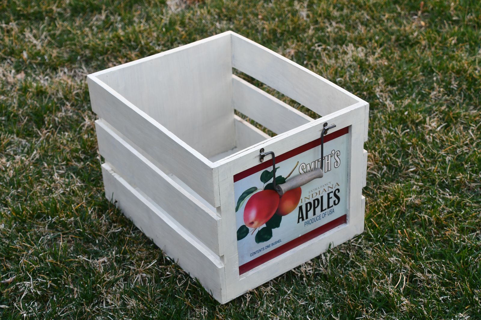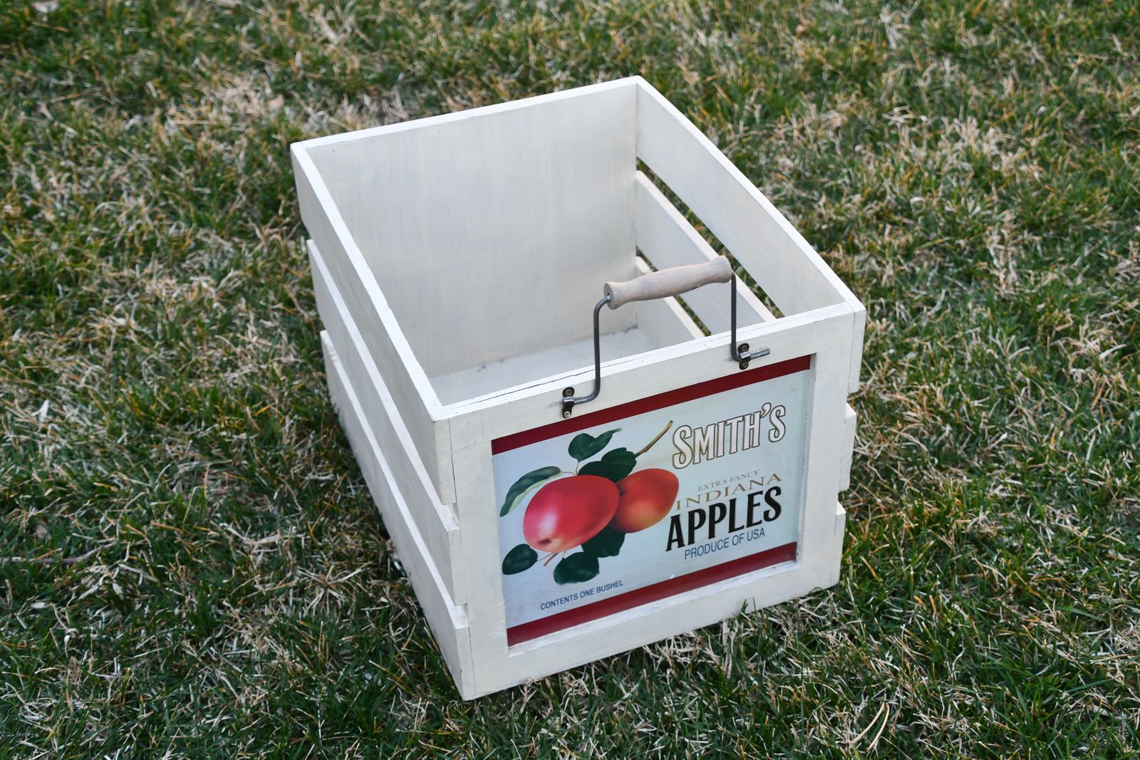 This WHITE WOODEN CRATE is about 15" x 12" x 10". One of the handles does not have the wooden part. It is CLEAN. Our home is smoke free. Questions??? Please ask. We are located in Plain City. Cash only please.