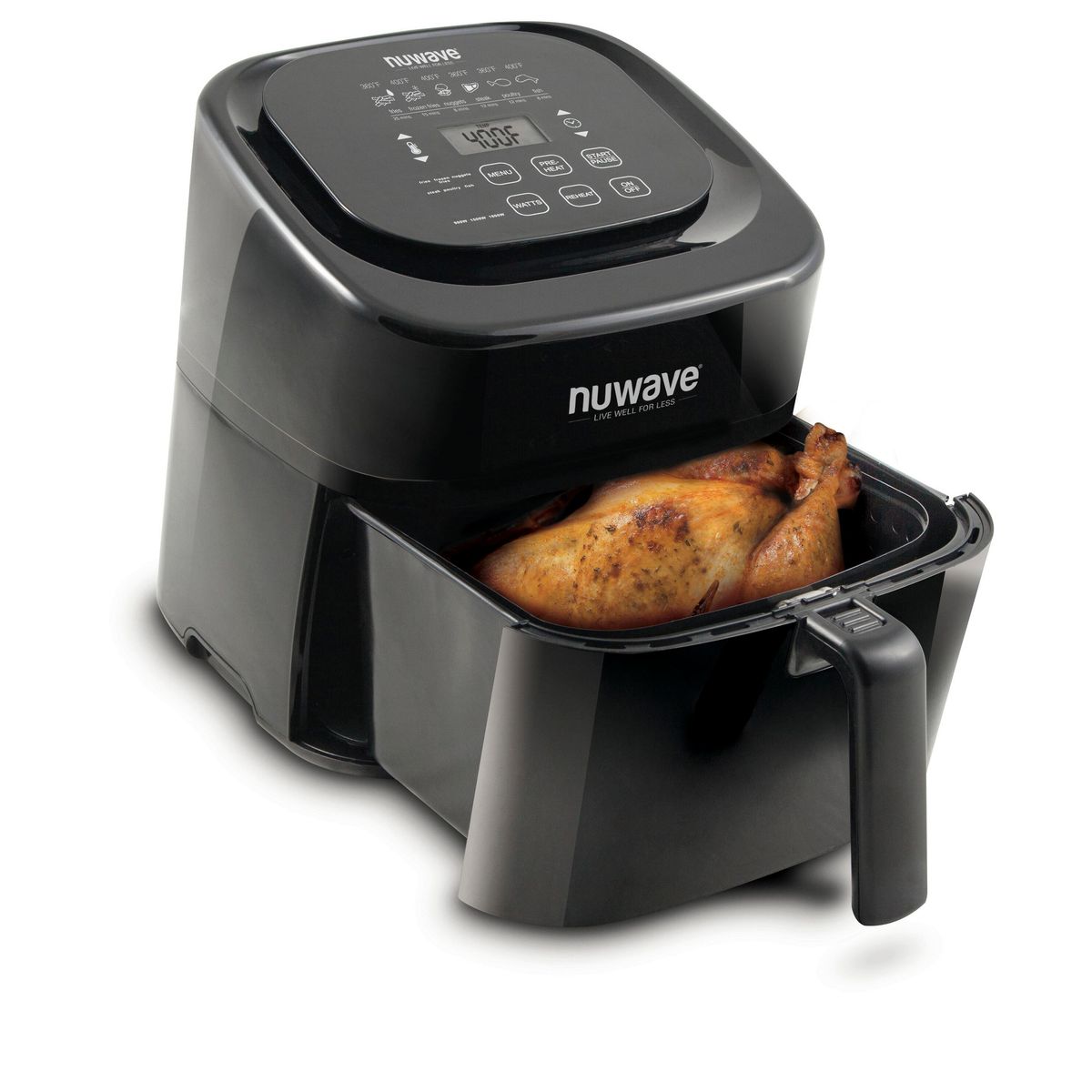The NuWave 6 Qt. Digital Air Fryer uses hot air in combination with high-speed air circulation to perfectly cook your favorite fried foods. Now you can bake, roast, and grill a wide variety of foods using little to no oil. NuWave's inventive Digital Air Fryer includes a removable drawer and food basket that have durable nonstick coating. Plus the drawer and food basket are dishwasher safe, which simplifies cleanup.