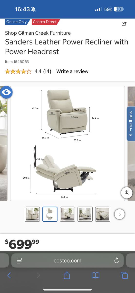 I am selling a Costco Sanders Leather Power Recliner Chair Set with Power Headrest in like new condition!