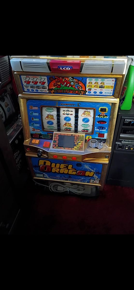 Two slot machines, one dual dragon and one Harvey Davidson slot machine one is not working