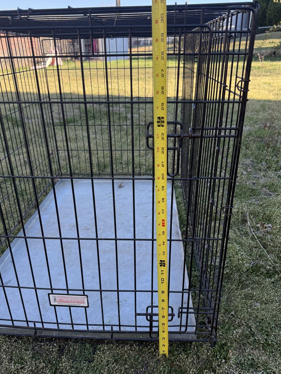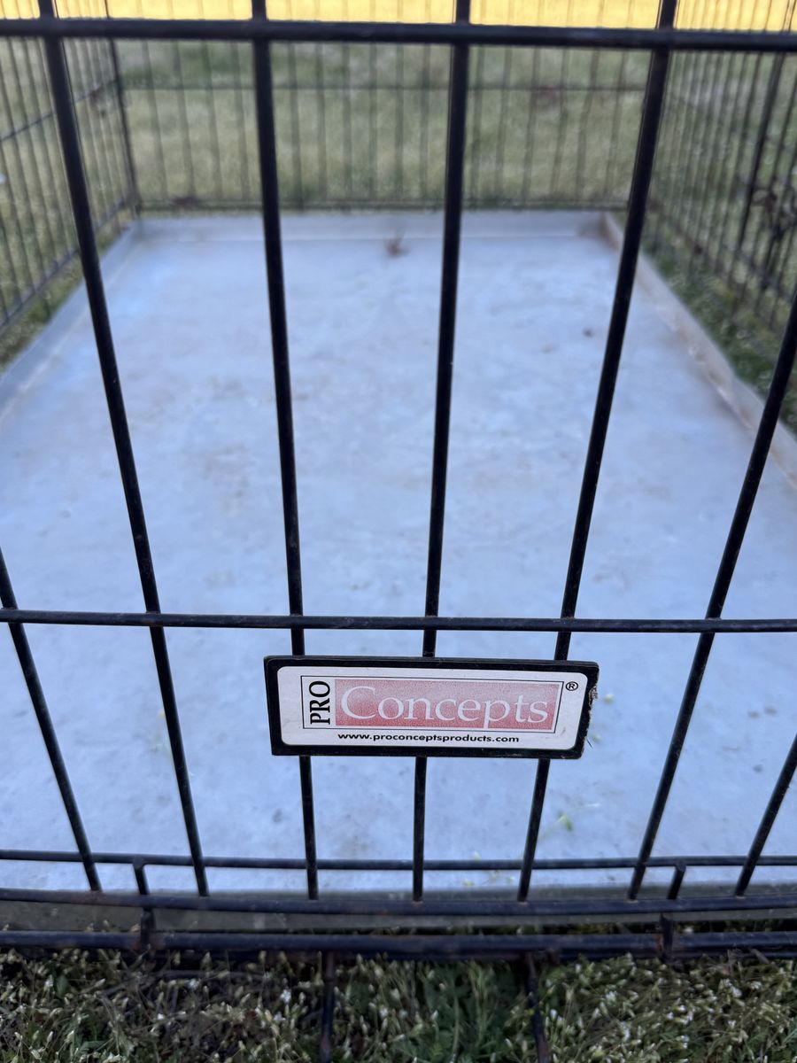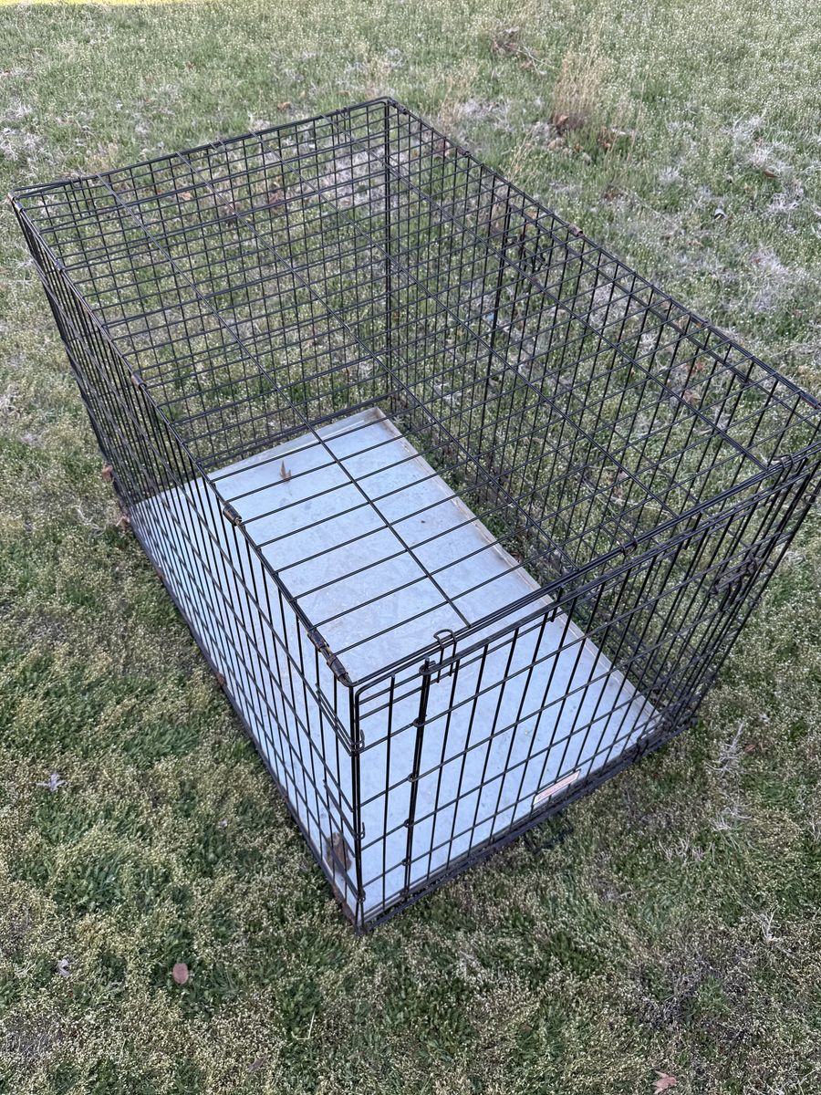 ZelleMetal dog crate with custom metal pan. Works great, no longer own a dog. Crate can be taken apart easily. 42x28x31”