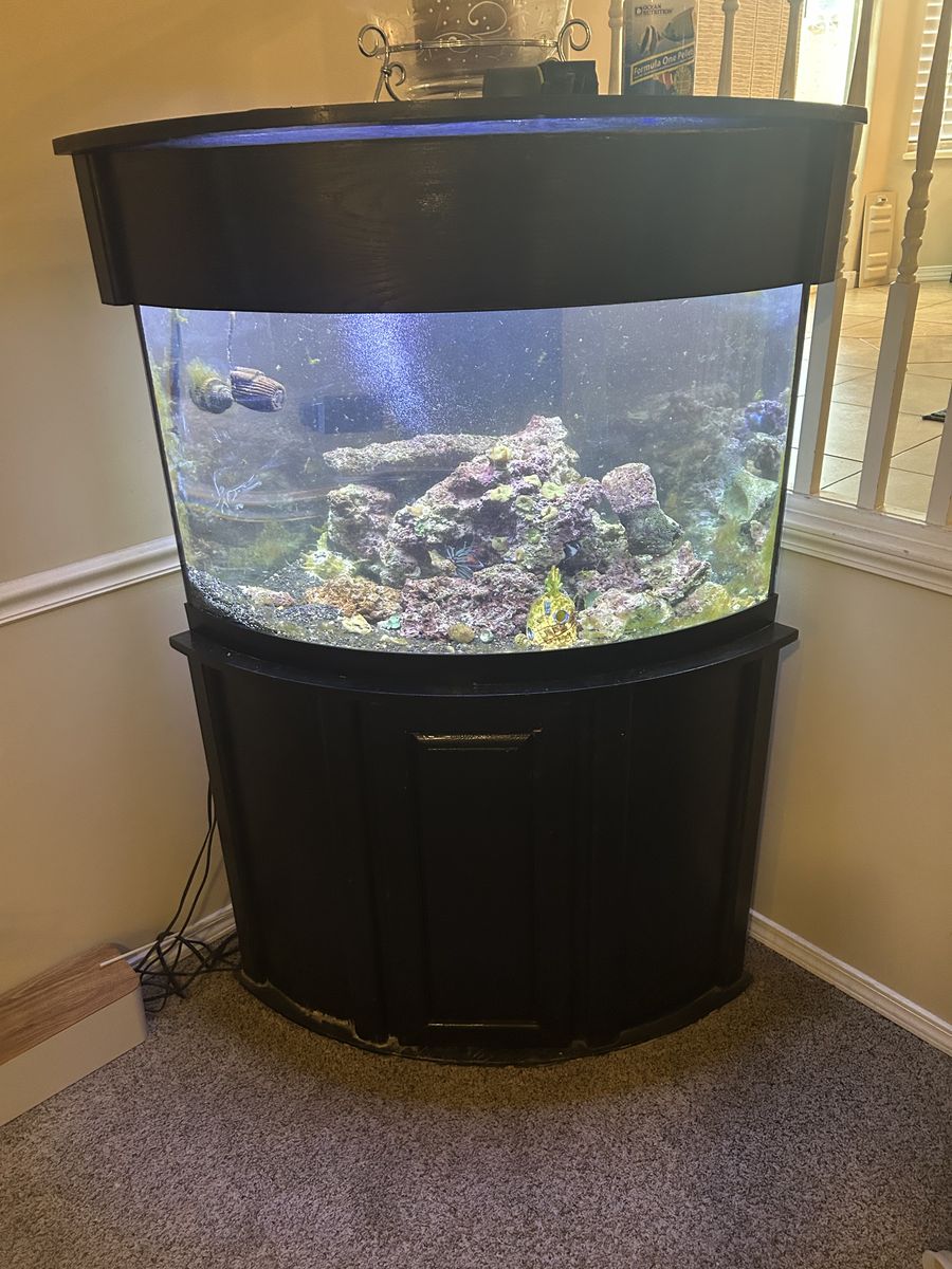 50-60 gallon curved fish tank. Had it for 5 years. It’s been a good tank. Mature tank with a couple fish and a bunch of mushrooms. Protein skimmer and filter make it pretty idiot proof.