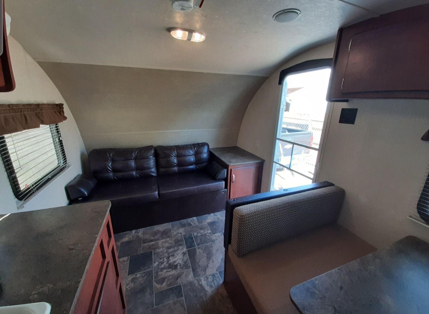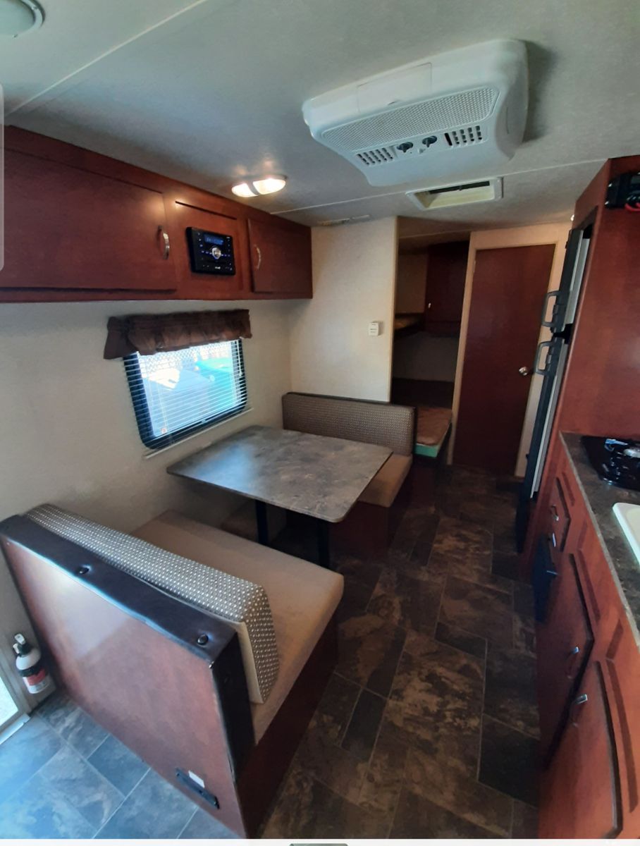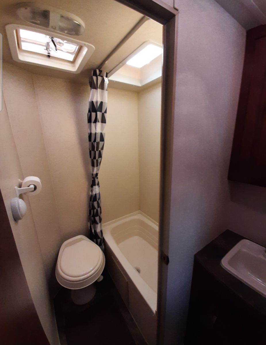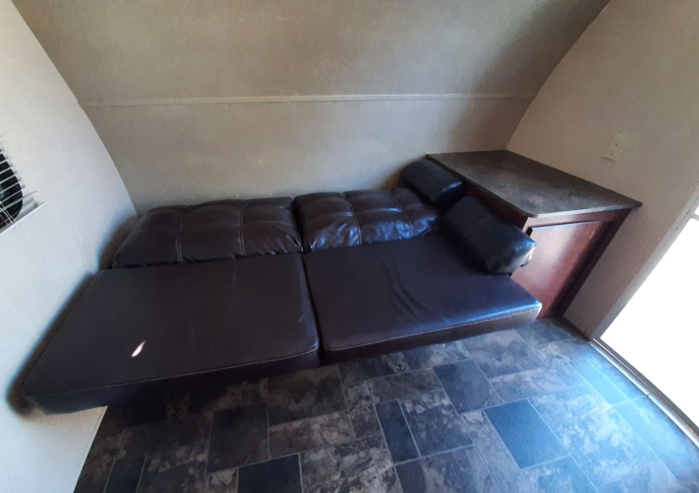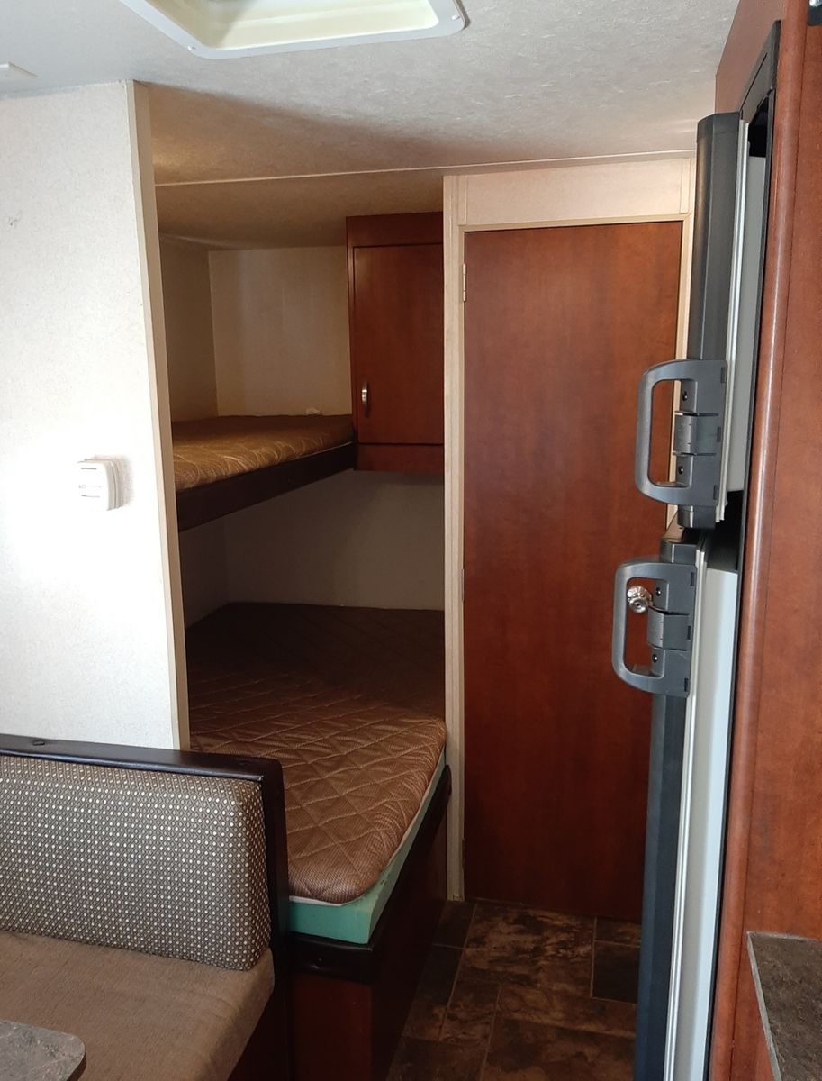 Has a double bed with single bunk above. Front couch pulls out and dinette converts to a bed.