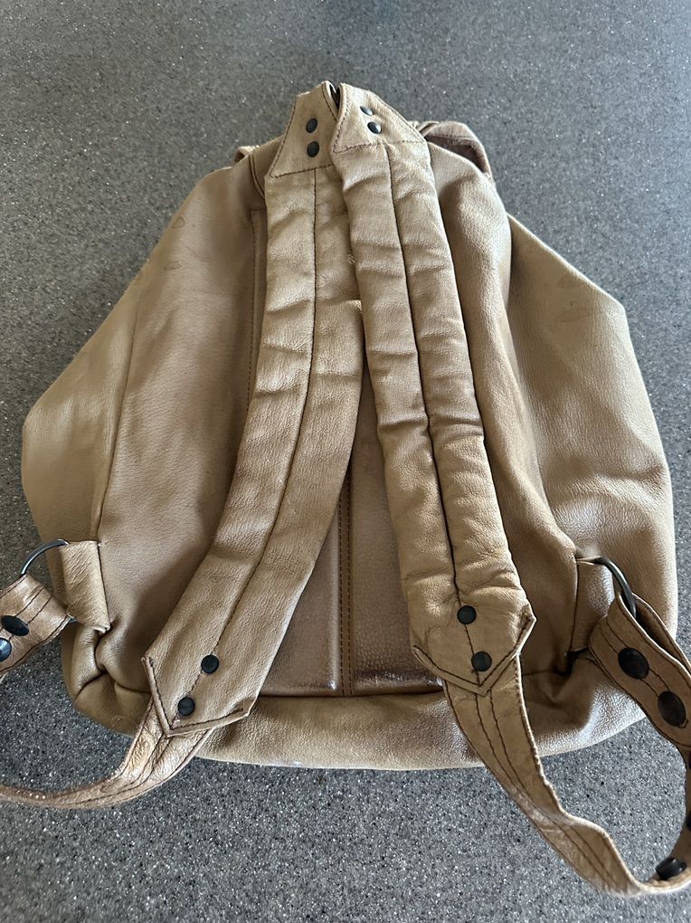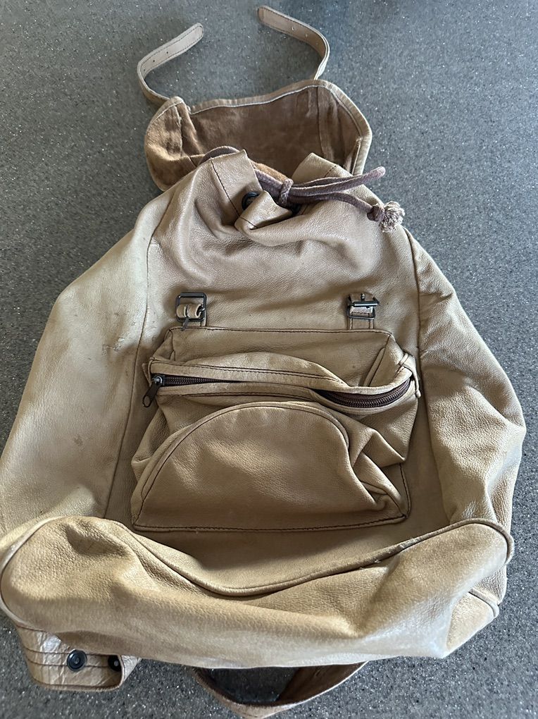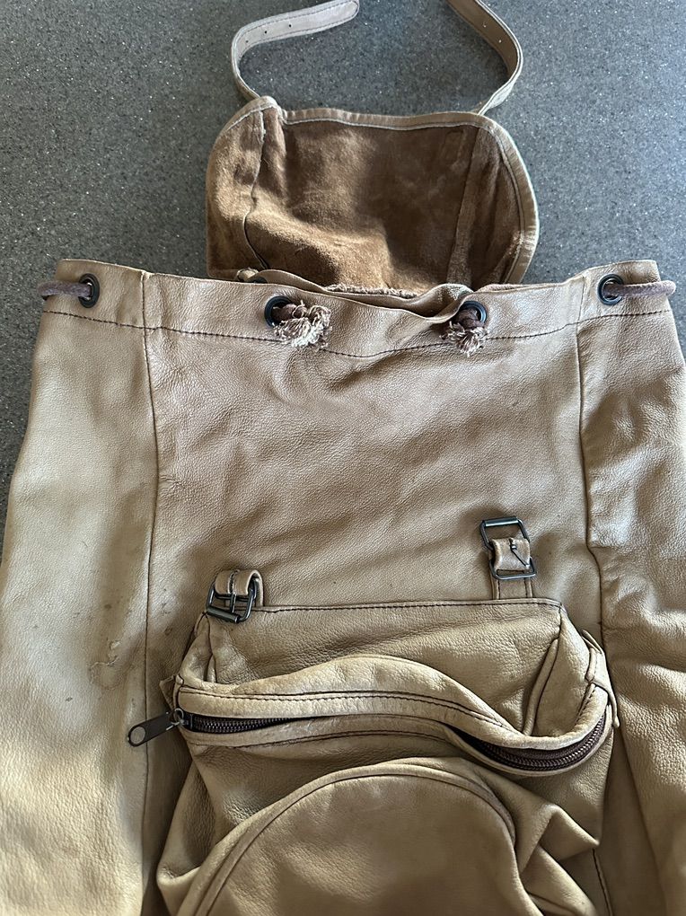 VenmoBeautiful natural patina with minor scuffs consistent with age (see photos for detail). • Material: 100% Soft, Genuine Leather not a piece patchwork • Style: Classic drawstring bucket closure with a magnetic/buckle flap top. • Storage: Large main compartment with a secure interior zip pocket; convenient exterior front zippered pocket • Fit: Adjustable leather shoulder straps and a sturdy top carry handle.