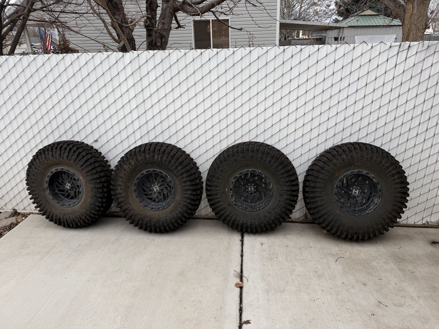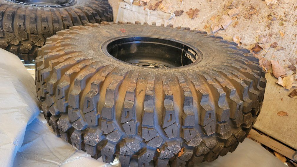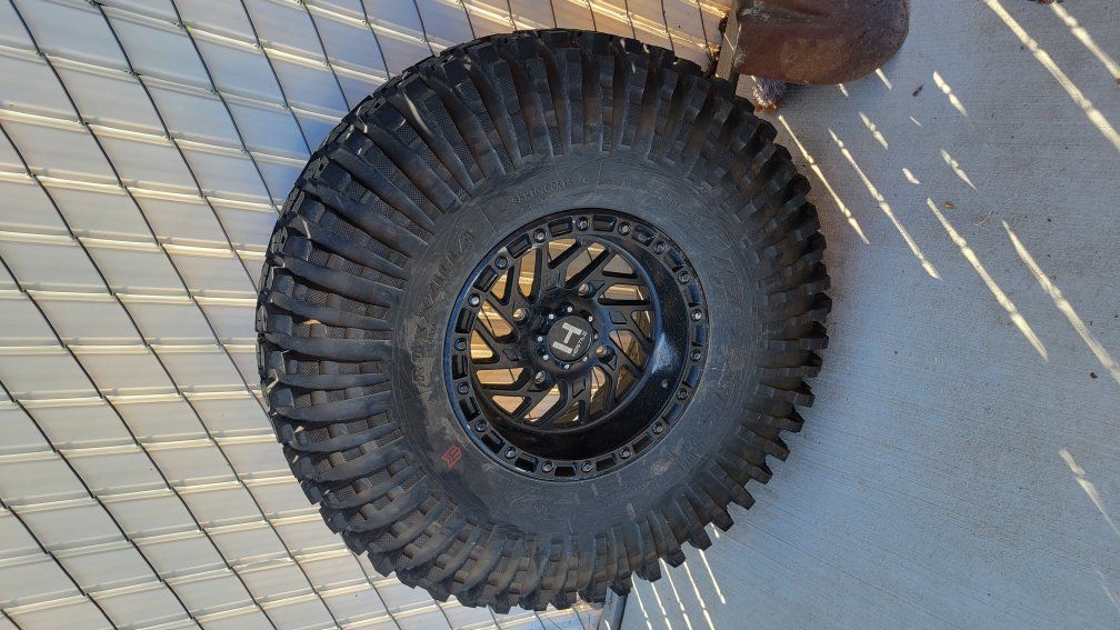 Set of 4 Roxxzilla tires 35x10R15 with Hostile rim. The rims are beat up but not terrible and work great. The tires are virtually brand new with less than 75 miles on them. Used them once to rock climb in Southern Utah. Great tires for rock climbing.