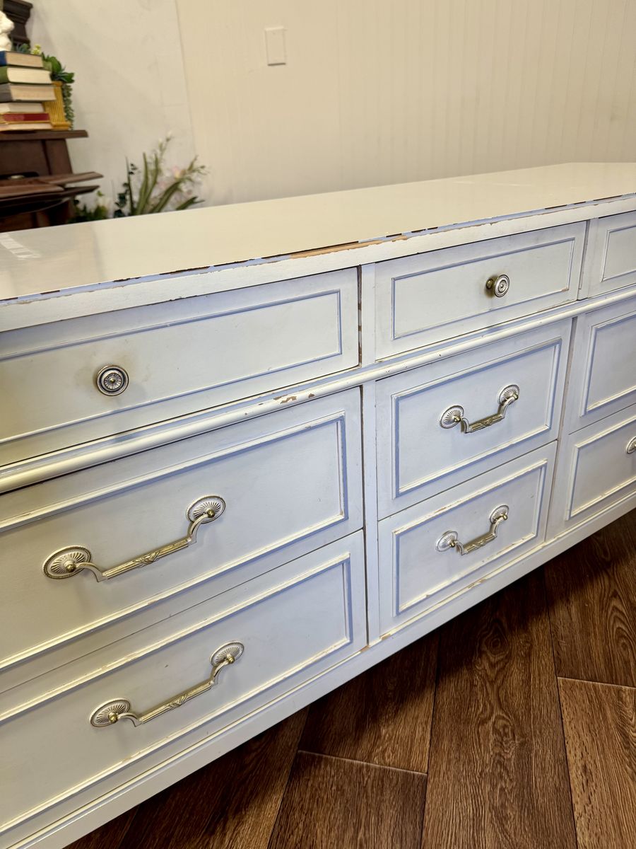 This is a high-quality, solid wood piece with timeless French Provincial styling and its complete set of original, ornate brass hardware. While the original finish shows age-appropriate paint chipping, the structure is in excellent condition. All nine drawers are crafted with sturdy dovetail joinery and slide perfectly—no sticking or wood damage. This dresser offers massive storage and is a perfect statement piece for a bedroom, nursery, or entryway. Brand: Thomasville Furniture Industries