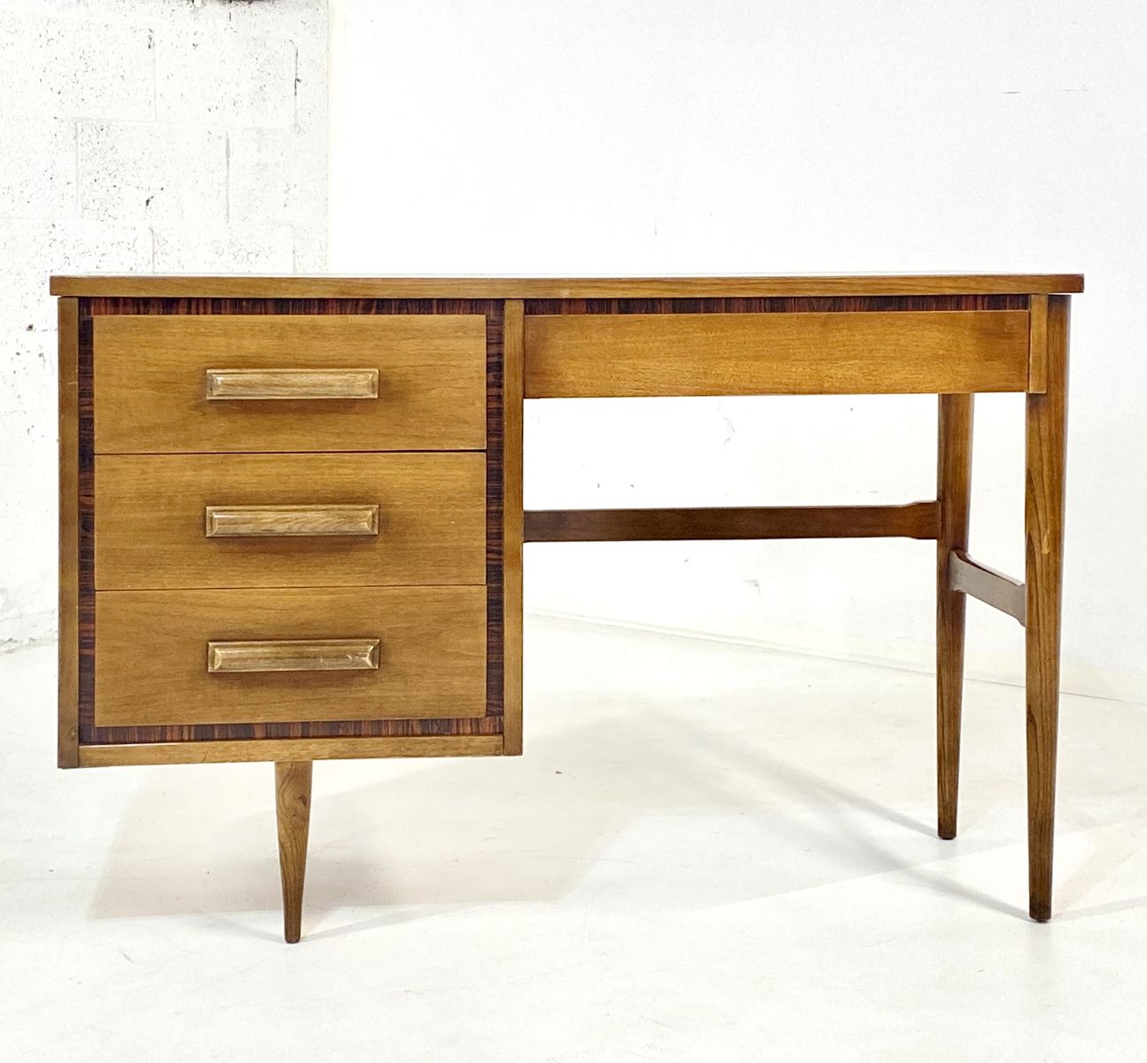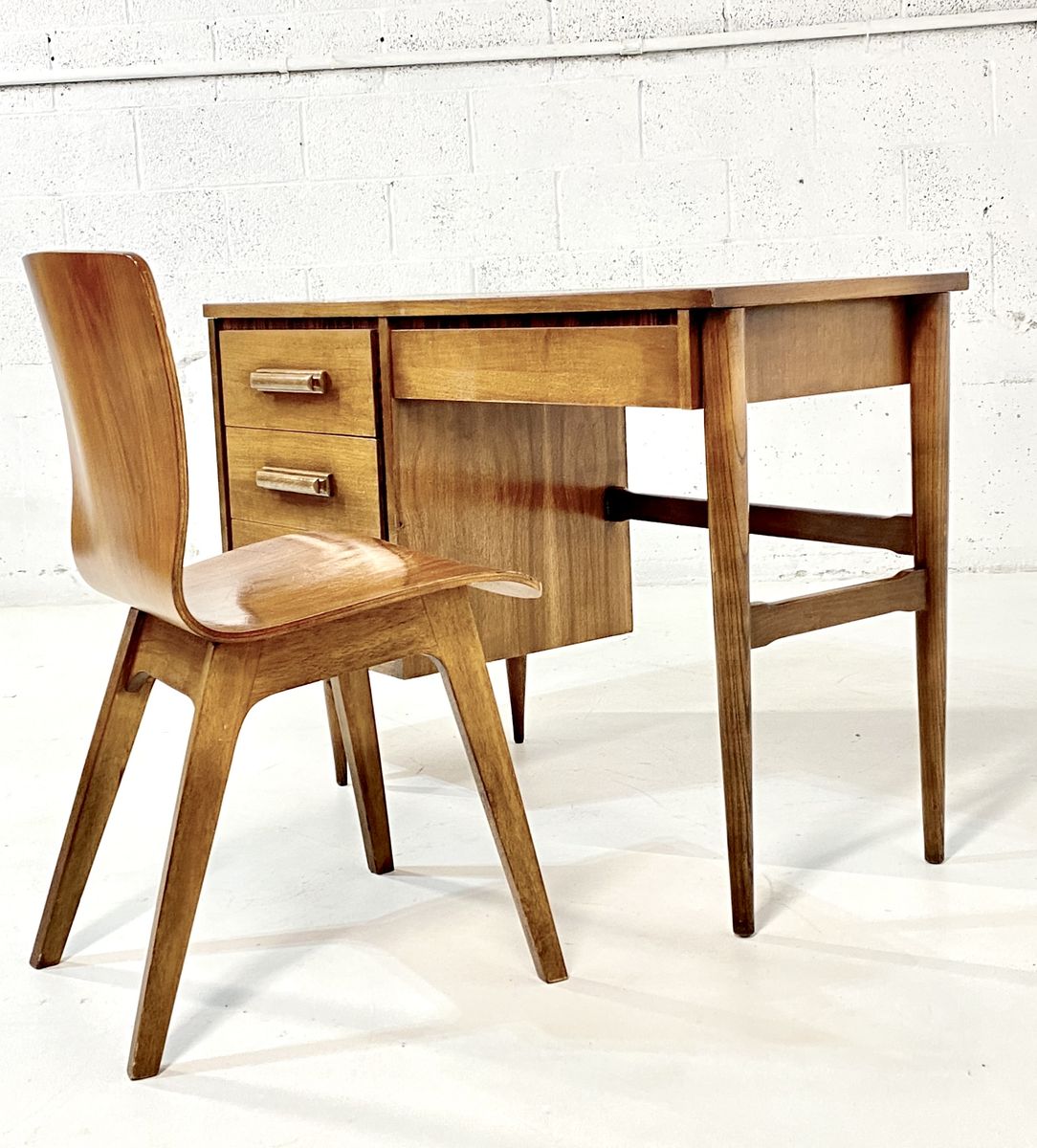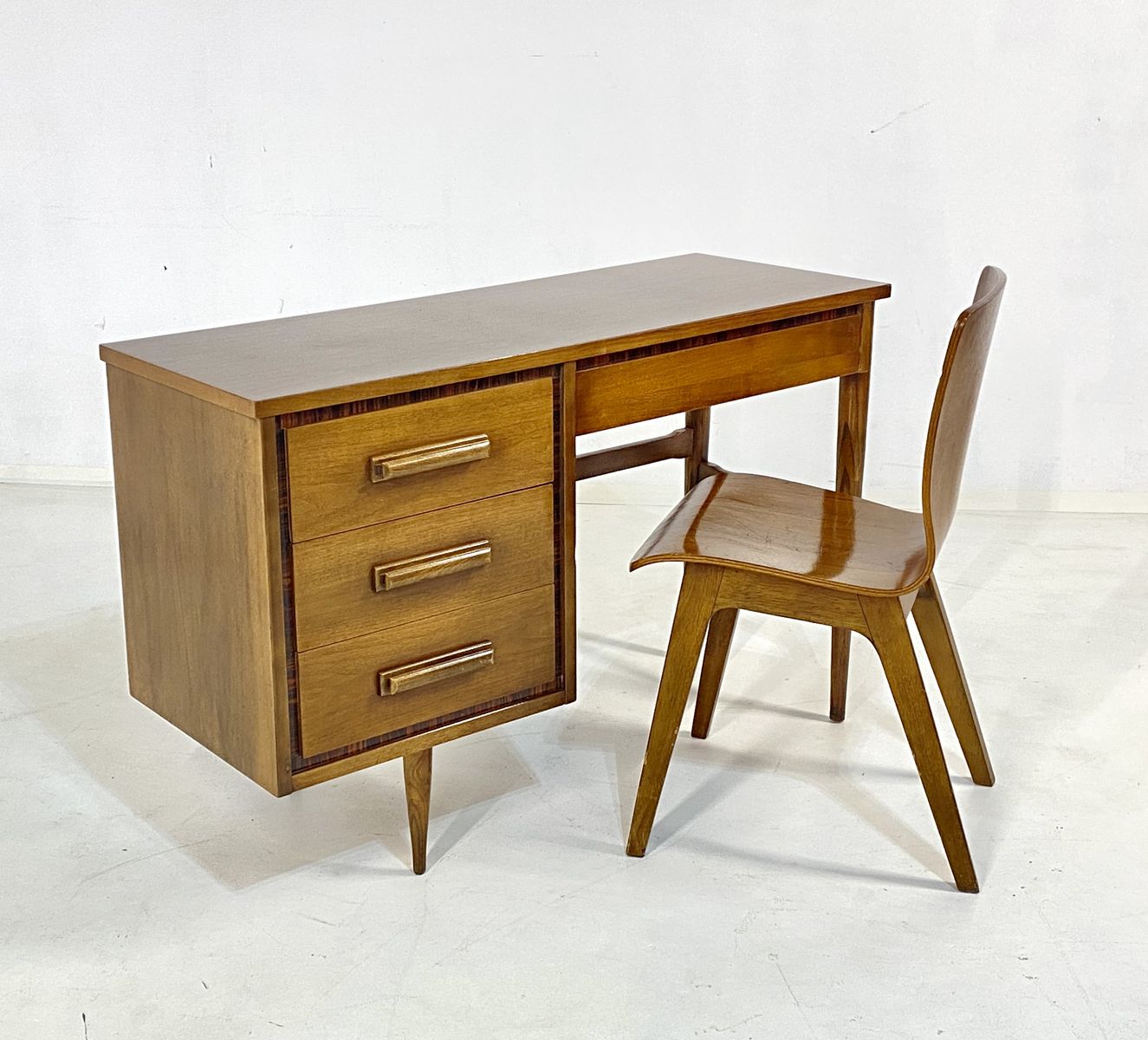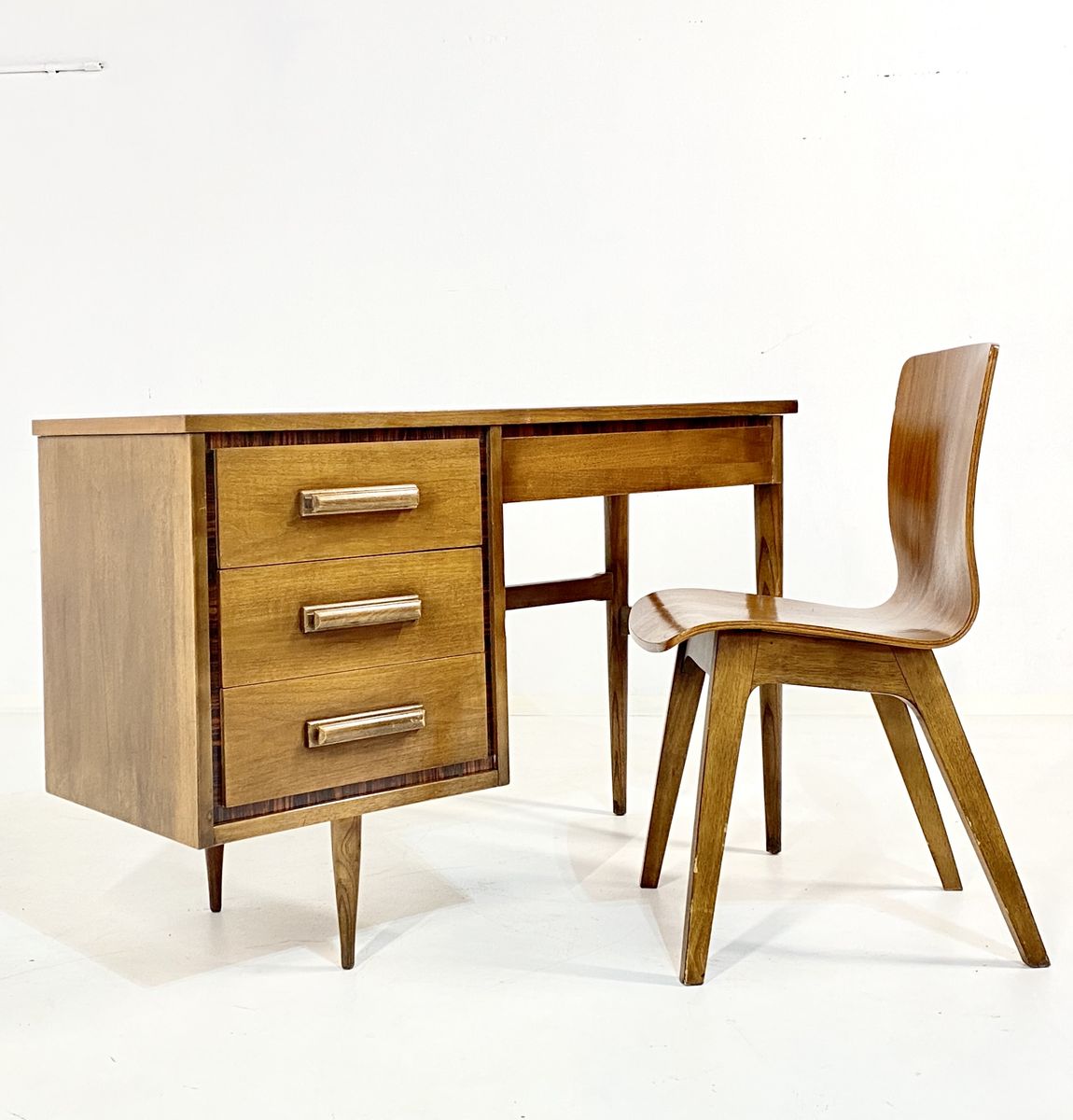 Beautiful Danish inspired MidCentury Modern Writing desk. Built by Basset Furniture. Circa 1950s/60s. Perfect size for a bedroom, studio, apartment, small office. This desk looks very similar to Leo Jiranek's Design for Bassett's Artisan collection, circa 1950/60's. Jiranek is one of the top MCM designers of his time. I suspect this may have been the first generation. If you look closely, you'll see the it's got a touch of art deco styling beautifully worked in. Given the age, it's in amazing shape. It has not been refinished. It also did not need repairs. However, it's such a beautiful piece, I have done a few things to assure it's around for another generation or two. As a designer and builder of furniture, I could see where the points of failure would eventually be for this piece. Spots Jiranek later addressed. In a non-destructive, reversible manner I reinforced these areas. Now, eventually will never arrive. It's important they were non-destructive to not affect its long term value. I can honestly say this desk is now sturdier than the day it left the maker's wood shop and will shrug off the coming 70 years. The MidCentury style steam bent walnut ply chair is by West Elm. Pairs up with this desk so nicely I'm listing together. While trying to price I only found only one Basset desk of this period and style that has not sold. It has been destroyed by someone who did not know what they were doing. Instead of the $1,500 the last listed one sold for they're asking $695.00 for a desk that's lost all its collectable value. I'm struggling with the price on this one. I'd like to keep it affordable so it sells locally. Since is acclimated to the arid environment, It's also better for the piece to stay here. What do you think...with the chair you can take this home for 595.00. That's truly an amazing price for these pieces. If this is your style, I suggest you come take a look. It's even prettier in person.