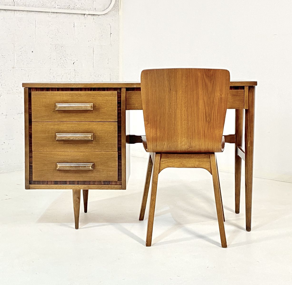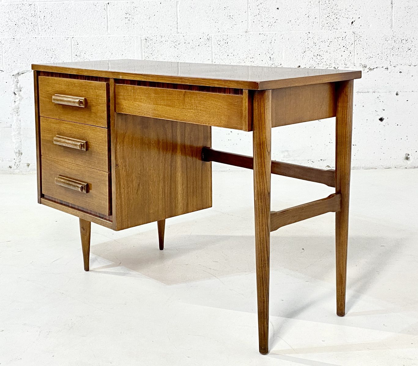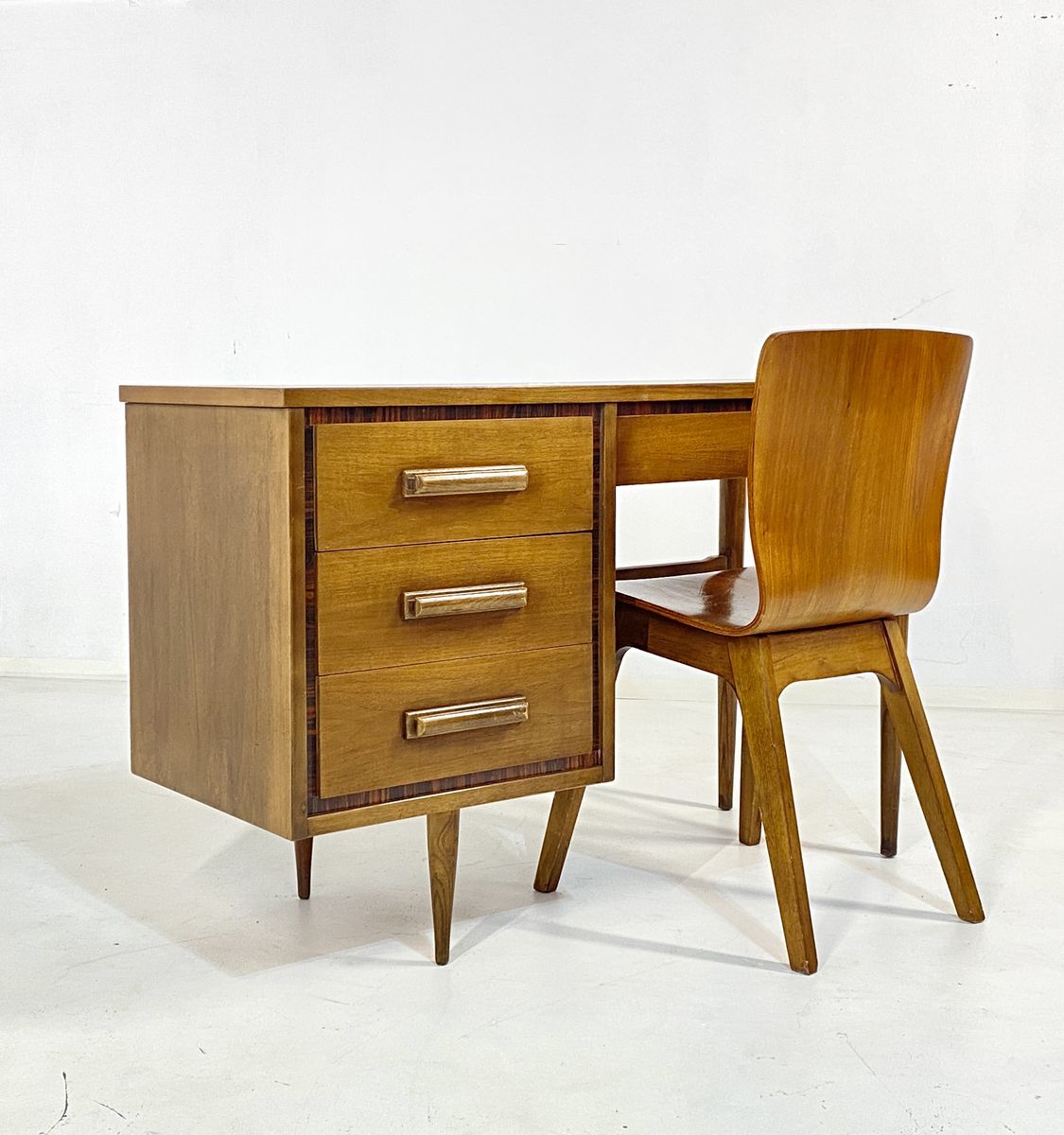 Beautiful Danish inspired MidCentury Modern Writing desk. Built by Basset Furniture. Circa 1950s/60s. Perfect size for a bedroom, studio, apartment, small office. This desk looks very similar to Leo Jiranek's Design for Bassett's Artisan collection, circa 1950/60's. Jiranek is one of the top MCM designers of his time. I suspect this may have been the first generation. If you look closely, you'll see the it's got a touch of art deco styling beautifully worked in. Given the age, it's in amazing shape. It has not been refinished. It also did not need repairs. However, it's such a beautiful piece, I have done a few things to assure it's around for another generation or two. As a designer and builder of furniture, I could see where the points of failure would eventually be for this piece. Spots Jiranek later addressed. In a non-destructive, reversible manner I reinforced these areas. Now, eventually will never arrive. It's important they were non-destructive to not affect its long term value. I can honestly say this desk is now sturdier than the day it left the maker's wood shop and will shrug off the coming 70 years. The MidCentury style steam bent walnut ply chair is by West Elm. Pairs up with this desk so nicely I'm listing together. While trying to price I only found only one Basset desk of this period and style that has not sold. It has been destroyed by someone who did not know what they were doing. Instead of the $1,500 the last listed one sold for they're asking $695.00 for a desk that's lost all its collectable value. I'm struggling with the price on this one. I'd like to keep it affordable so it sells locally. Since is acclimated to the arid environment, It's also better for the piece to stay here. What do you think...with the chair you can take this home for 595.00. That's truly an amazing price for these pieces. If this is your style, I suggest you come take a look. It's even prettier in person.
