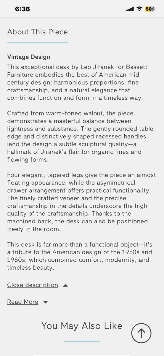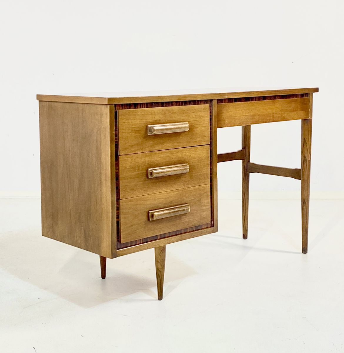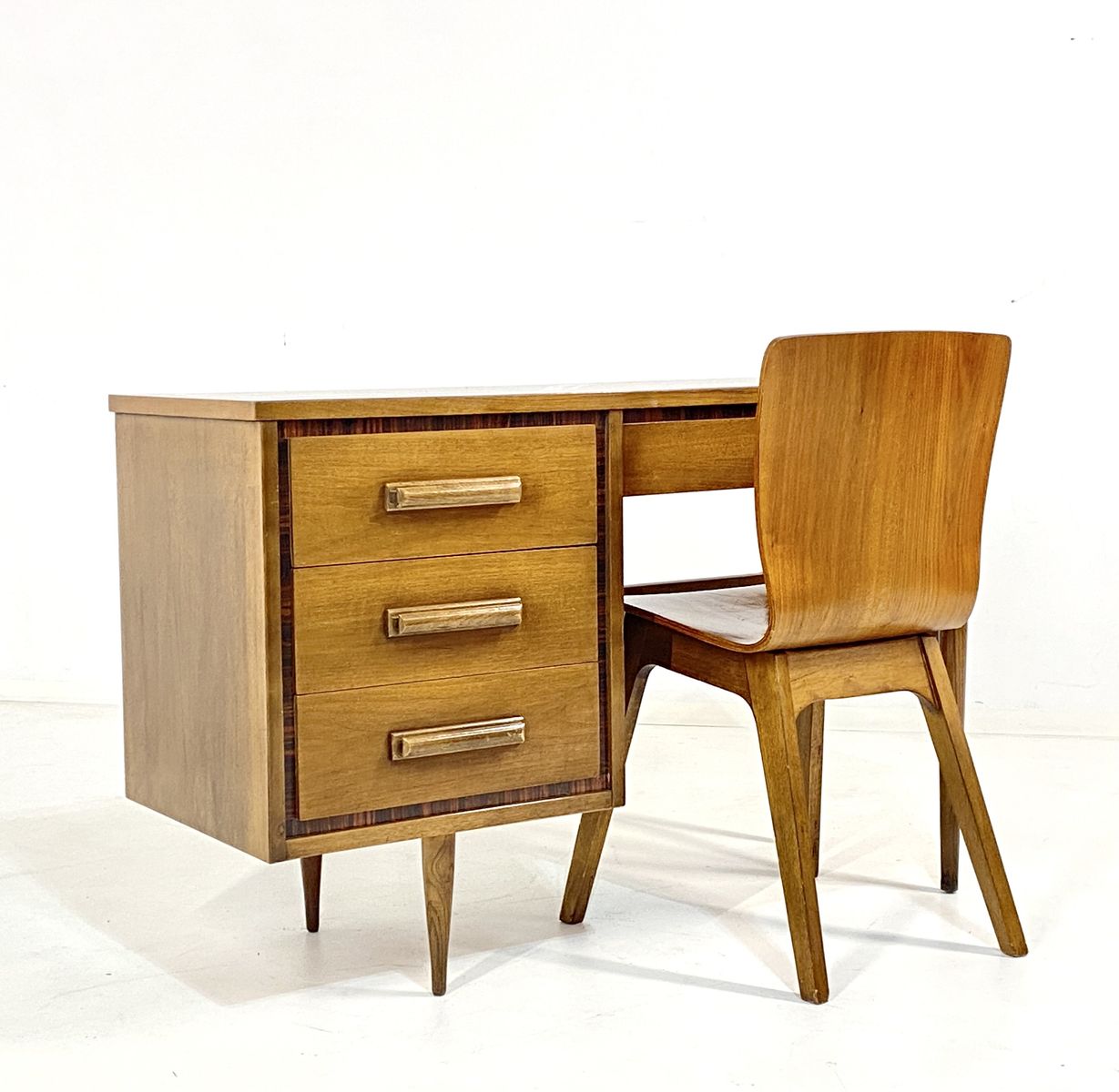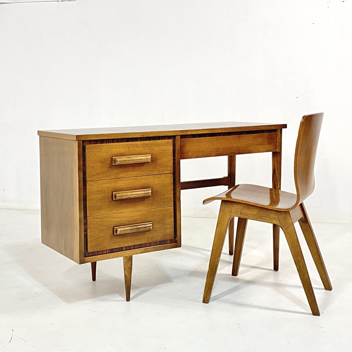 Beautiful Danish inspired MidCentury Modern Writing desk. Built by Basset Furniture. Circa 1950s/60s. Perfect size for a bedroom, studio, apartment, small office. This desk looks very similar to Leo Jiranek's Design for Bassett's Artisan collection, circa 1950/60's. Jiranek is one of the top MCM designers of his time. I suspect this may have been the first generation. If you look closely, you'll see the it's got a touch of art deco styling beautifully worked in. Given the age, it's in amazing shape. It has not been refinished. It also did not need repairs. However, it's such a beautiful piece, I have done a few things to assure it's around for another generation or two. As a designer and builder of furniture, I could see where the points of failure would eventually be for this piece. Spots Jiranek later addressed. In a non-destructive, reversible manner I reinforced these areas. Now, eventually will never arrive. It's important they were non-destructive to not affect its long term value. I can honestly say this desk is now sturdier than the day it left the maker's wood shop and will shrug off the coming 70 years. The MidCentury style steam bent walnut ply chair is by West Elm. Pairs up with this desk so nicely I'm listing together. While trying to price I only found only one Basset desk of this period and style that has not sold. It has been destroyed by someone who did not know what they were doing. Instead of the $1,500 the last listed one sold for they're asking $695.00 for a desk that's lost all its collectable value. I'm struggling with the price on this one. I'd like to keep it affordable so it sells locally. Since is acclimated to the arid environment, It's also better for the piece to stay here. What do you think...with the chair you can take this home for 595.00. That's truly an amazing price for these pieces. If this is your style, I suggest you come take a look. It's even prettier in person.
