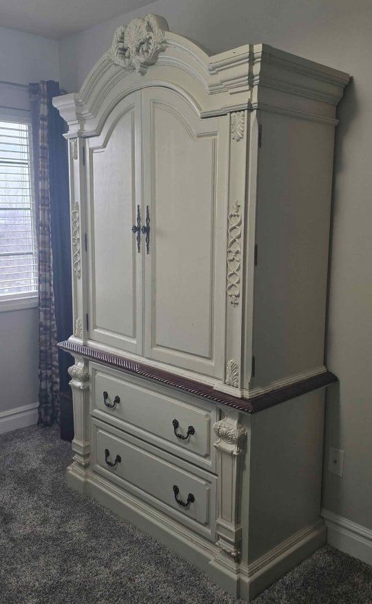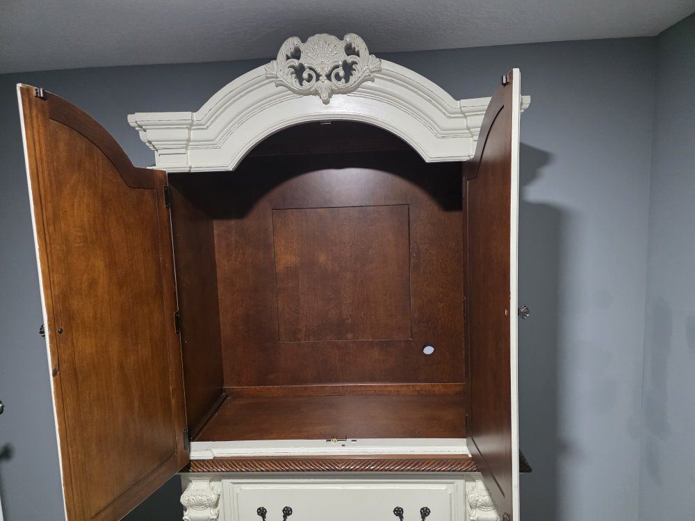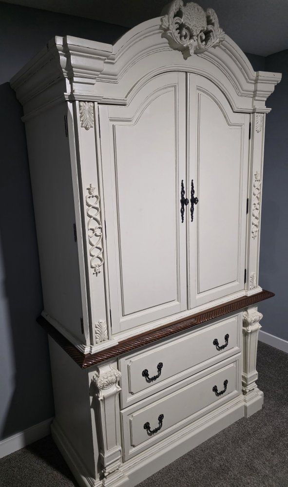 Beautiful large Farmhouse Amoire Dresser Wardrobe TV Stand. Distressed finished with walnut/cherry top or middle. Can be used as a dresser or hide TV inside. $190 50"Wide x 83"tall x 22"deep