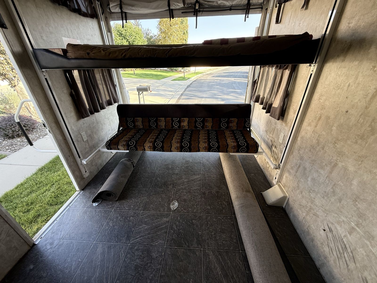 It also features a GENERAC 5000-watt generator with remote start, a 139” long garage with a 79” height clearance to the bottom of the bed when raised, and removable beds for higher clearance.
