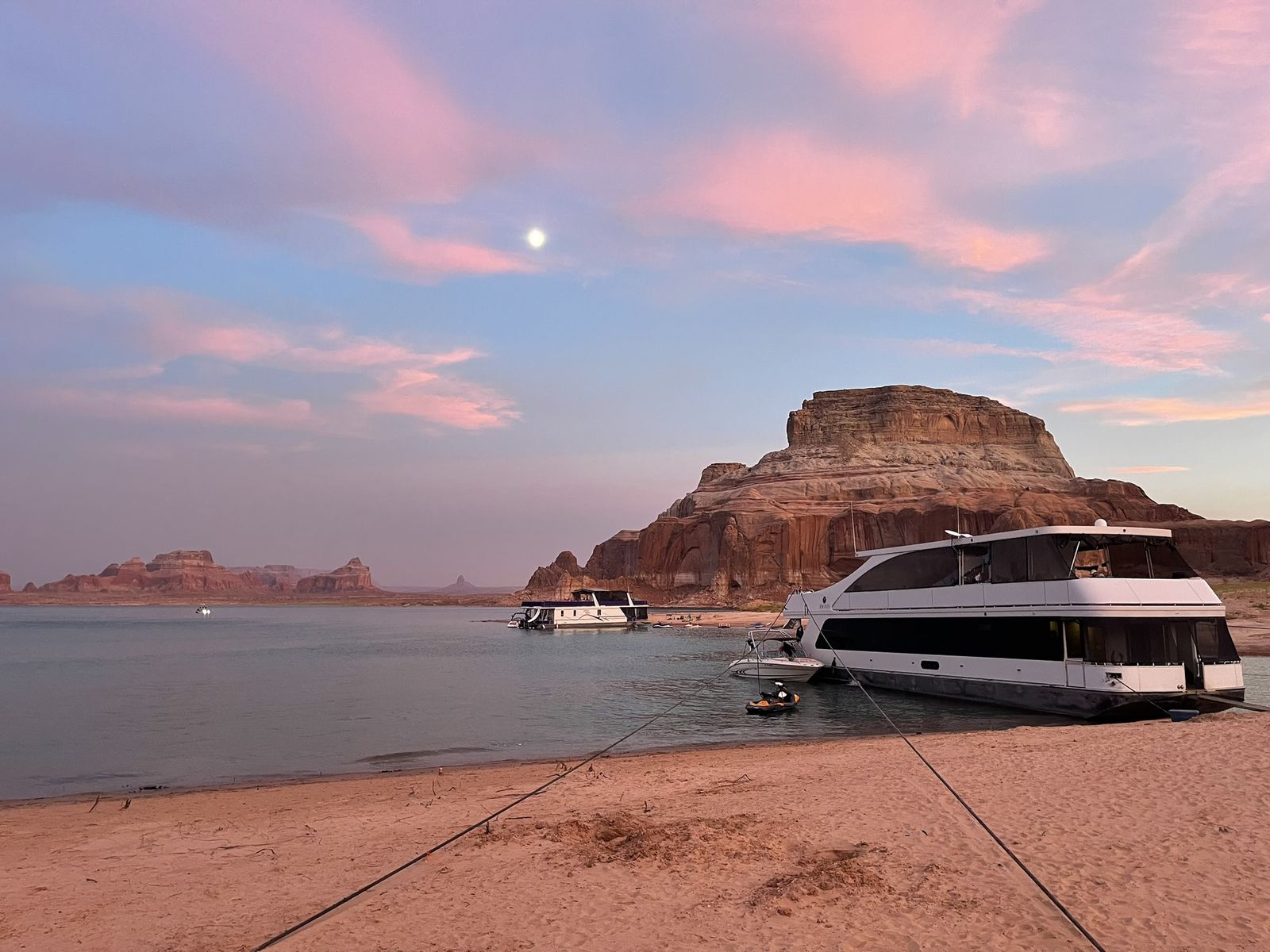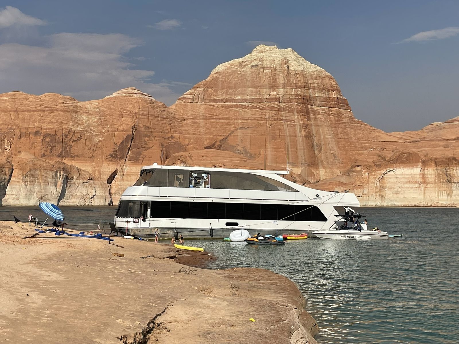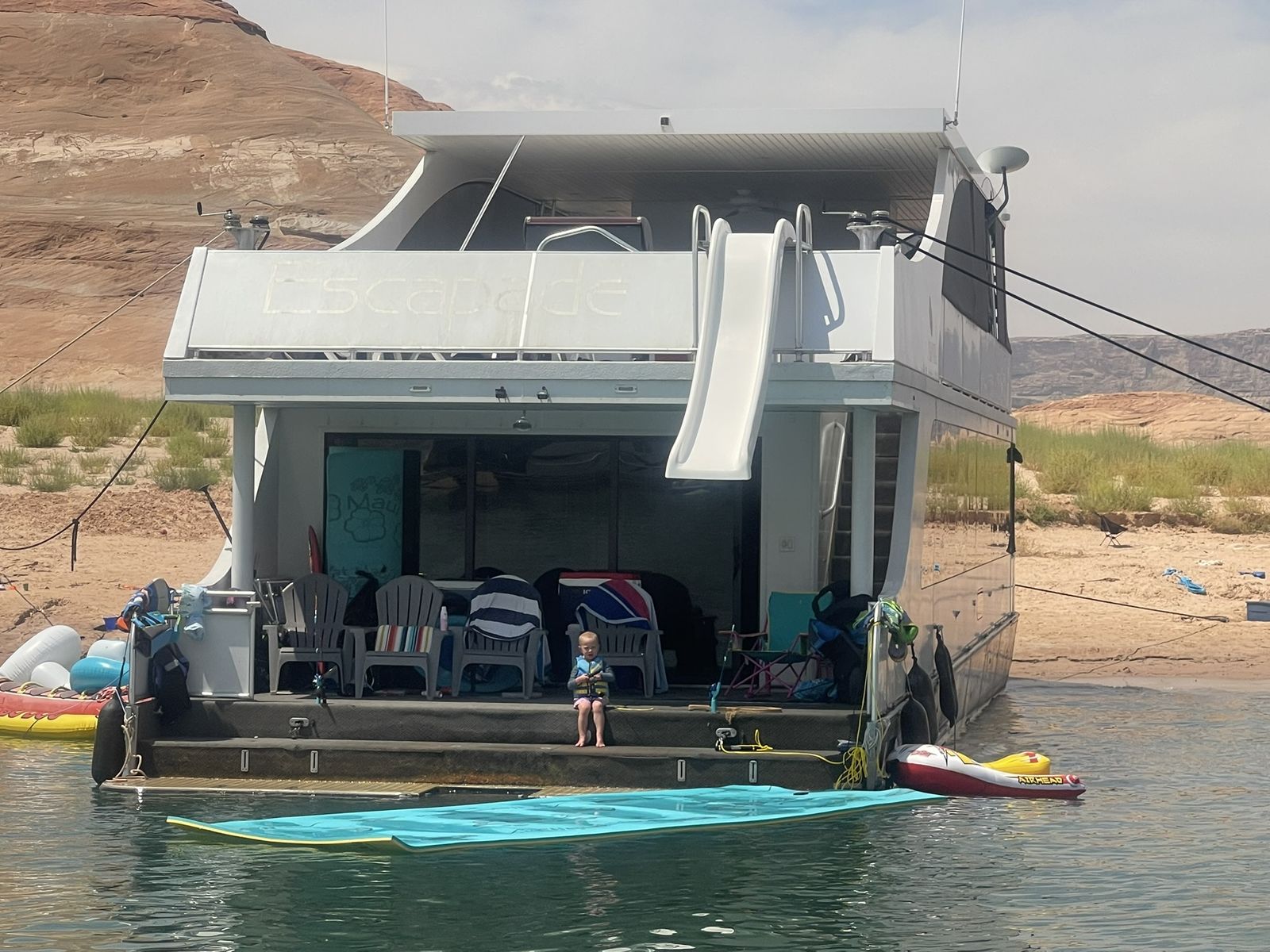2018 Adonia 75' x 18' Escapade Houseboat at Antelope Point Marina. In a slip during the summer season (not launch and retrieve). 18 owner houseboat with 2 brand new engines. 5 bedrooms, 2 kid cuddies, 3 bathrooms. Starlink wifi. 700 gallon fuel capacity with 250 gallon toy tank. 2 x 16 KW diesel generators. PWC ramps, reverse salon, UV water system. Friday to Friday week. Week 15 - Includes Labor Day weekend for 2026, 2027 and 2028. 2026 estimated annual maintenance partnership fee = $3,500. Antelope Point Marina provides turnaround services.
