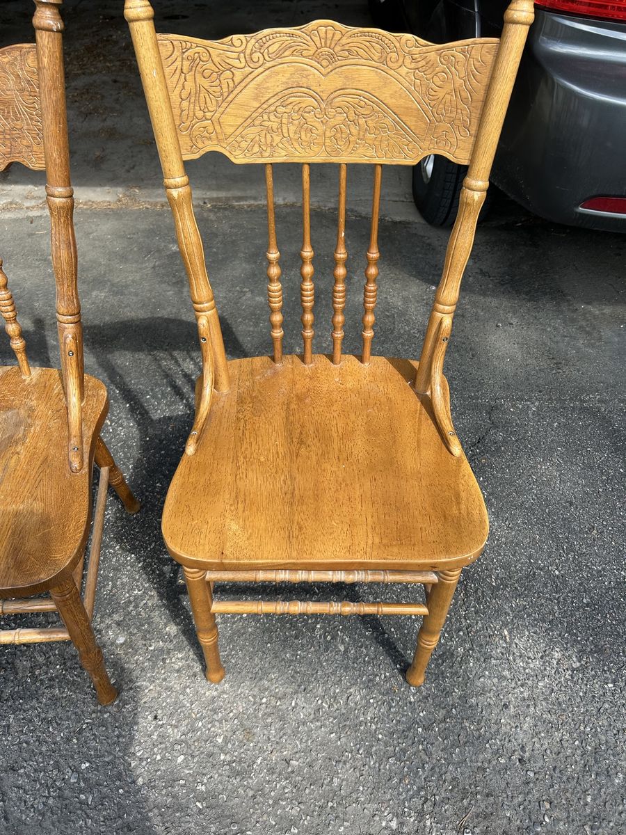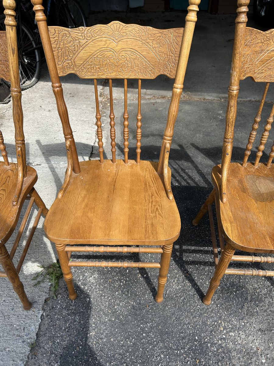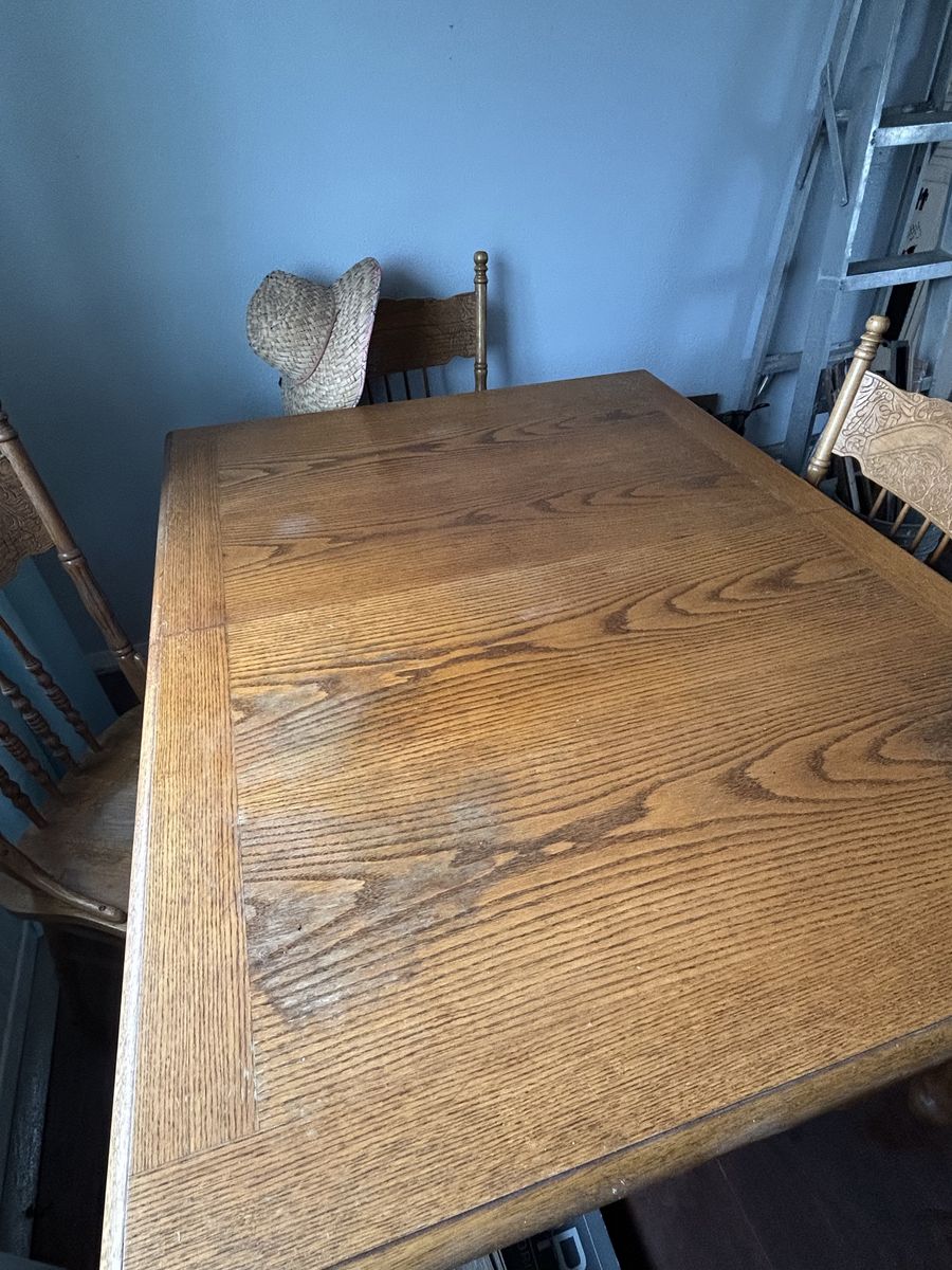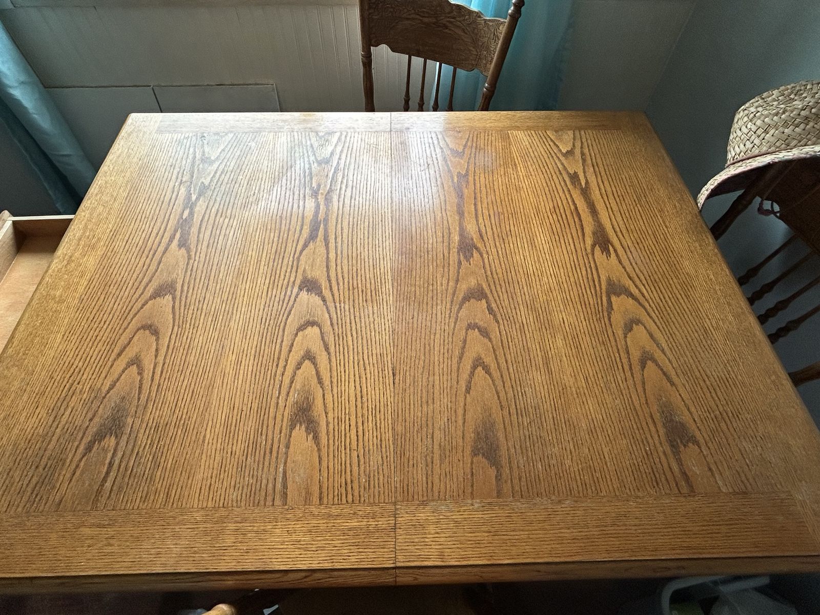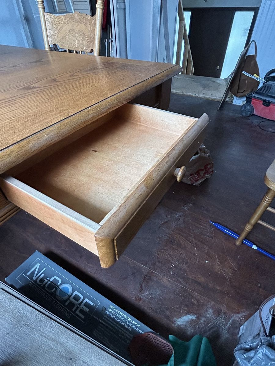Dining room table and chairs, used fair condition. L4’ 61/2” x W2’ 6” x H2’ 61/2” Leaf 1’ 6” Has 2 side drawers for placemats storage.