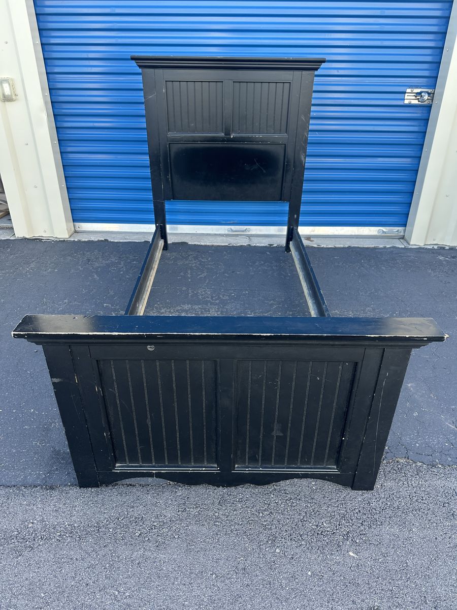 Check out this super cute twin bed. Overall, it is in good condition. There might be some imperfections from moving, a few scratches, dings in the wood, and signs of use, etc. You can easily refinish the bed to your liking.