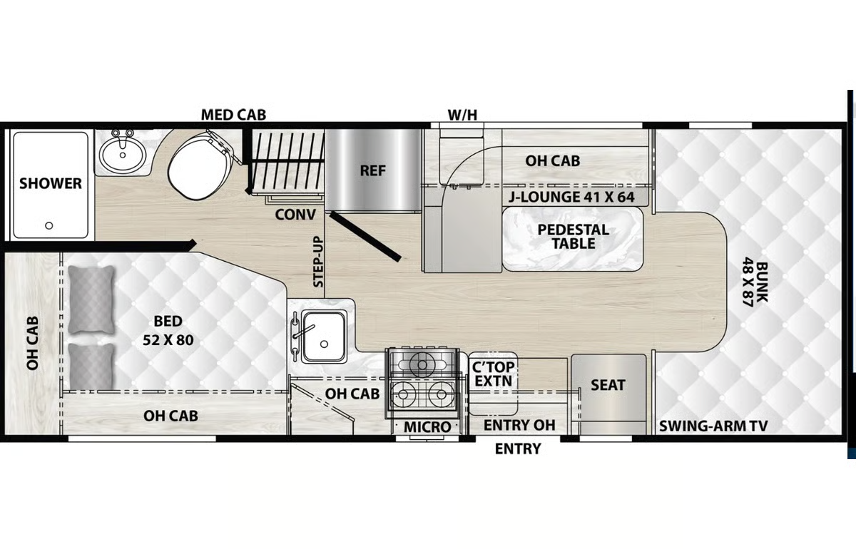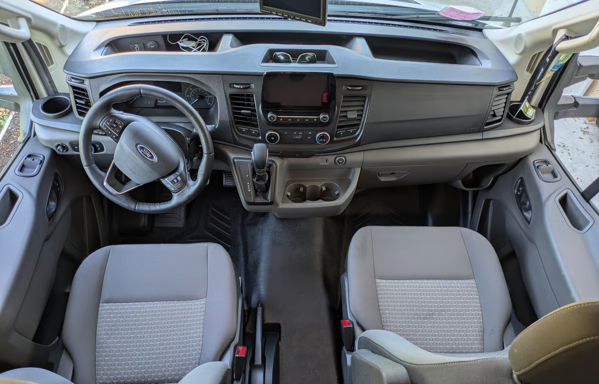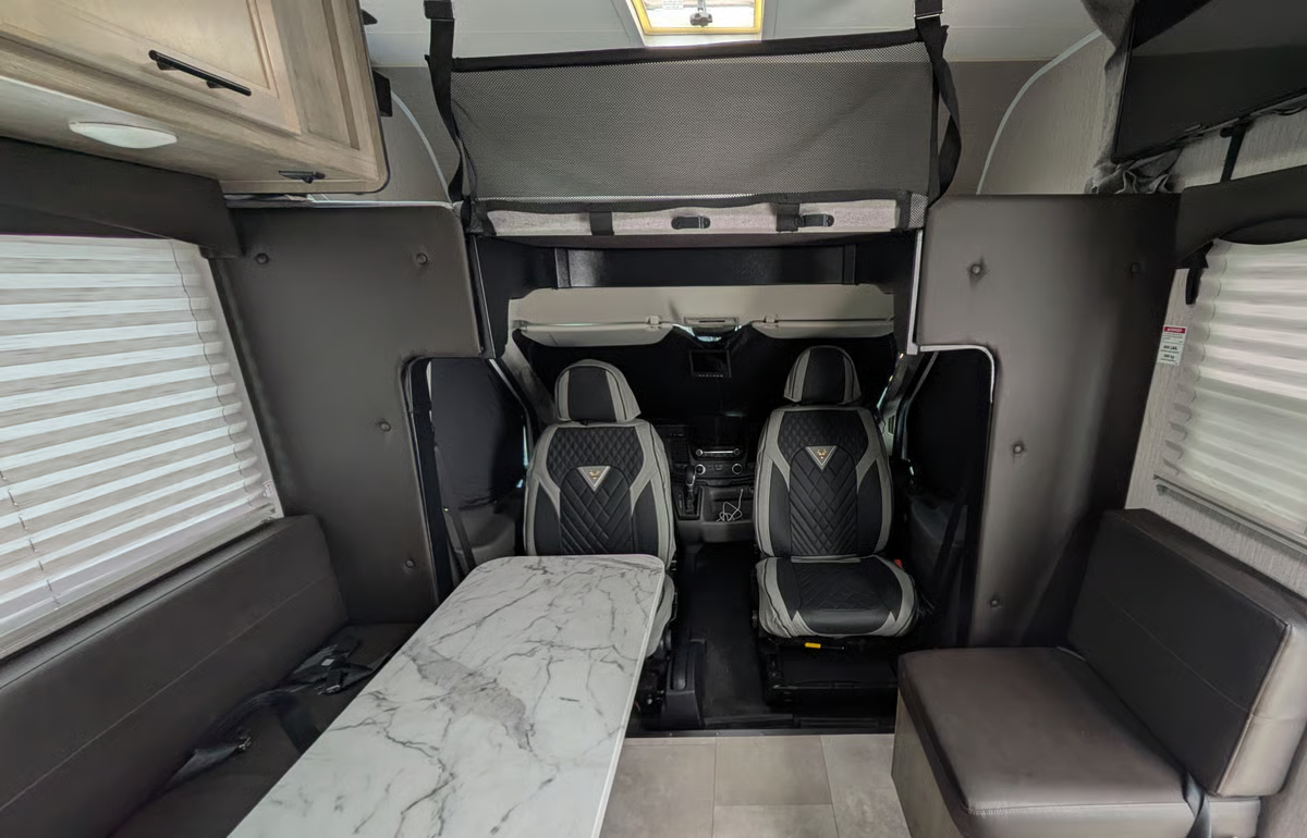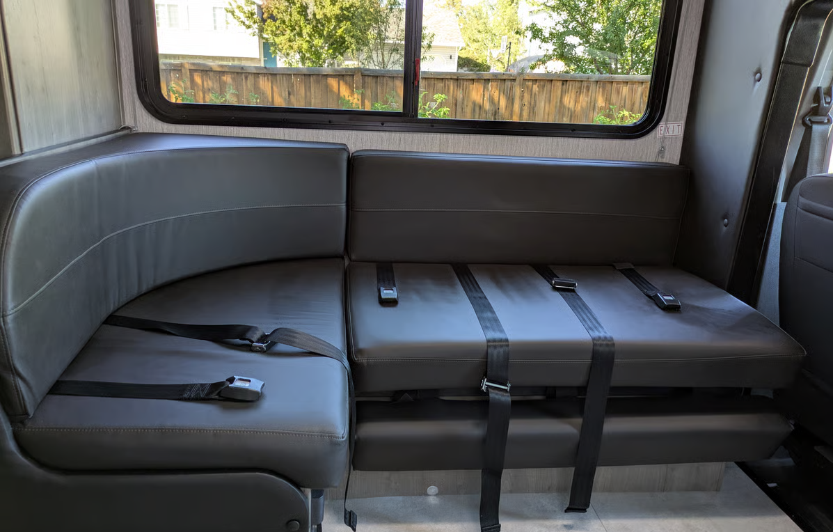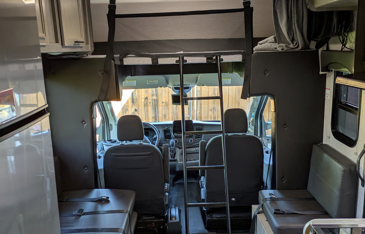 Equiped with the 3.5L Ecoboost Engine Great for 4-6 people. One of the most compact Class C RVs out there to that accomodates a full family. The front seats are quite comfortable and the rear bench seats have 4 seatbelts for a total of 6 seatbelts. A solar panel helps keep the battery charged and reduces the time needed to run the generator when spending multiple days in a single spot. The fridge runs off the 12V system making your 49lbs (12 gallons) of propane for the 3-burner stove, hot water and furnace last longer. The furnace warms the space quickly and the generator is great for running the A/C while on the go as well as to supplement the vehicle A/C when the weather is exceptionally hot. The generator runs off the vehicle's gas tank also reducing the frequency of needing to fill the propane tank. The vehicle's alternators quickly charge the house batteries giving you peace of mind that they will supply all the power you need if you roll into camp after quiet hours. 23'9" Long 7'9" Wide Excluding Mirrors. The modest length and smaller width than most class C RVs make this easier to maneuver and get you slightly better fuel economy. We have been averaging 12mpg on trips with mostly 70mph freeway speeds. Higher speeds or aggressive use of the available 300hp will quickly bring you down to 10 mpg. The AWD will give you added confidence if the conditions get slippery. The ground clearance is not enhanced and is not for off road adventures. The driver assistance features include adaptive cruise control, rear and side view cameras, auto high-beam, auto windshield wipers and lane keep assist. Our favorite is the adaptive cruise control. Letting the vehicle maintain a safe following distance simplifies driving letting you focus more on the journey. The dinette table that converts to a bed is best for a short person or two small children. The bunk over the cab is roomy and can easily fit two people if you don't mind crawling over the person closest to the edge. We think 3 small children can make it work. It also has the most room for a tall person. The fresh water tank is under the bed and is not directly exposed to the outside air. The waste tanks also have heater pads on the undersides. If the furnace thermostat is kept at a reasonable temperature, the water system can be used during the winter.