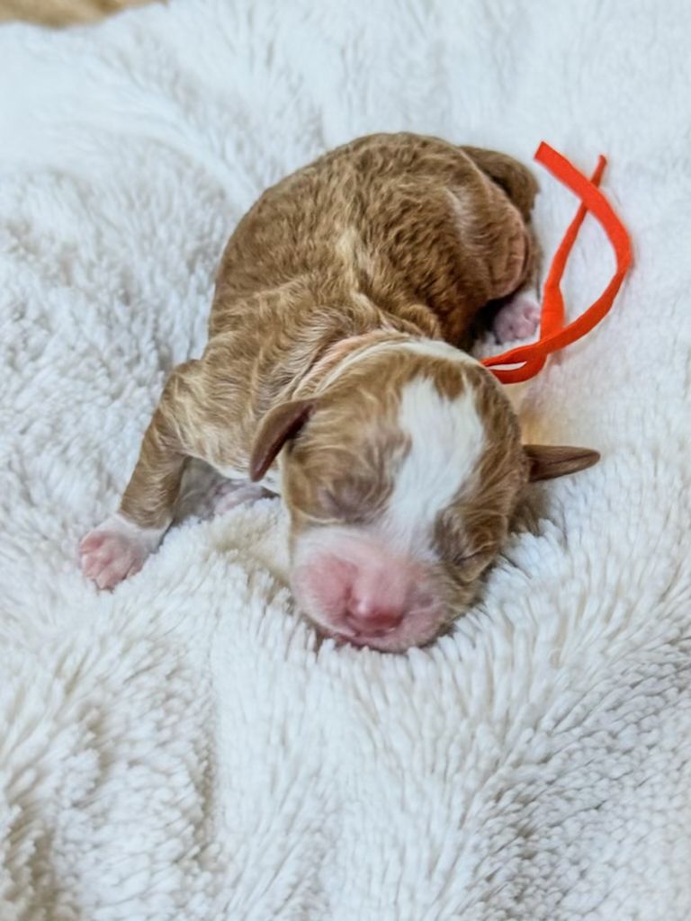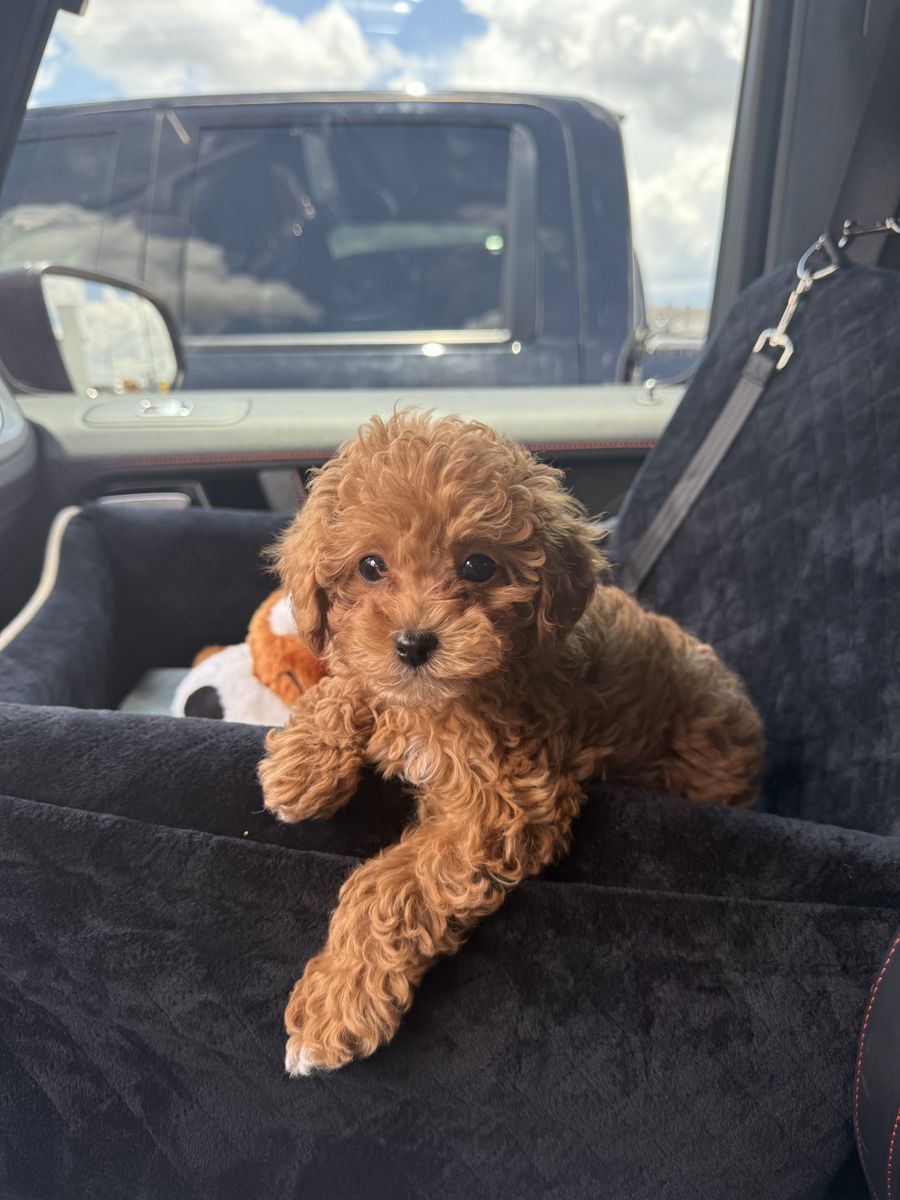 ZelleTucker is a red AKC registered toy/mini poodle with the sweetest little personality. He is a cuddle bug and loves everyone. He is my daughter emotional support animal and she totes him everywhere! Here are some details about Tucker! ️ He is weighing in at 8.5 lbs, 14 inches tall, he is lean with long legs. 🧬 He has had his DNA testing through Embark and 100% clear genetics and confirmed clear of CDDY/IVDD and CDPA through UC Davis. 🩻He has had OFA prelims done on his Hips, Elbows, Patella’s, Heart, and Eyes. Coat color: ee, kbky, ayat, BB, SS, no Merle, no sable tan, and FF and 9/10 Red intensity 🧸 He has a teddy bear face that is to die for and the most beautiful eyes. Hypoallergenic and non-shedding Tucker is a newer stud and has sired two previous litters, the lower stud price we hope will allow him practice ️