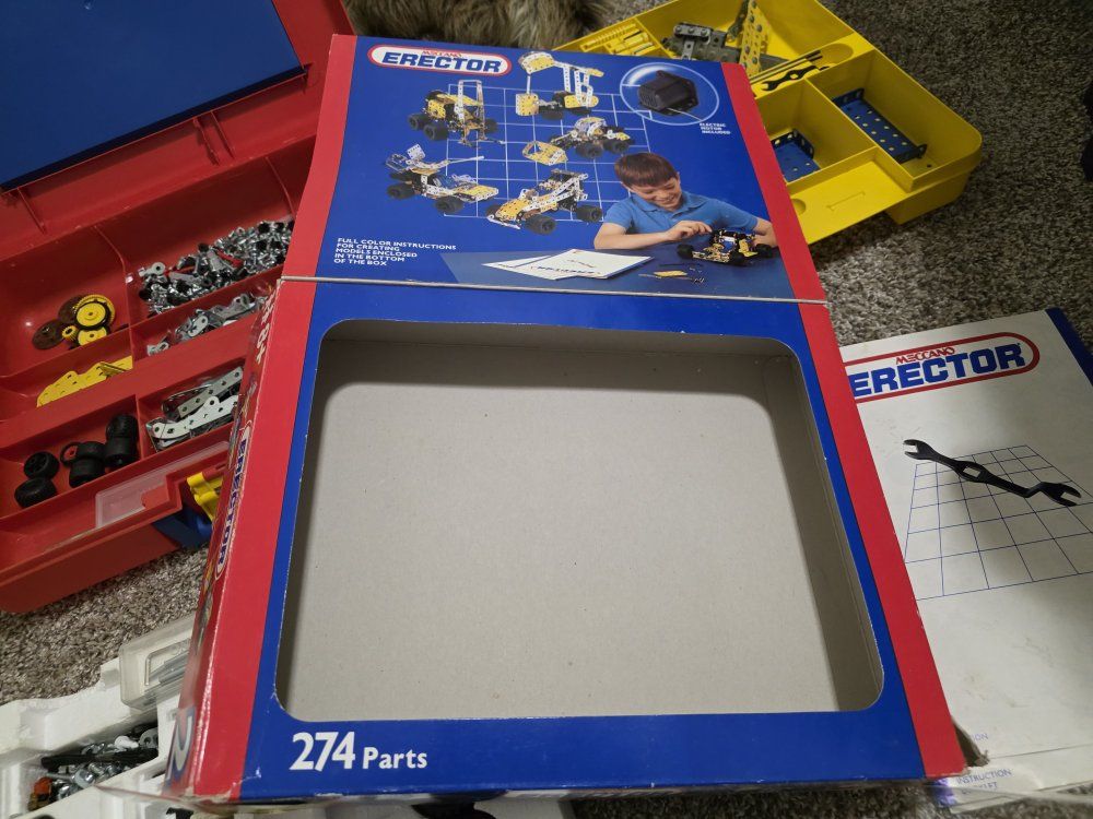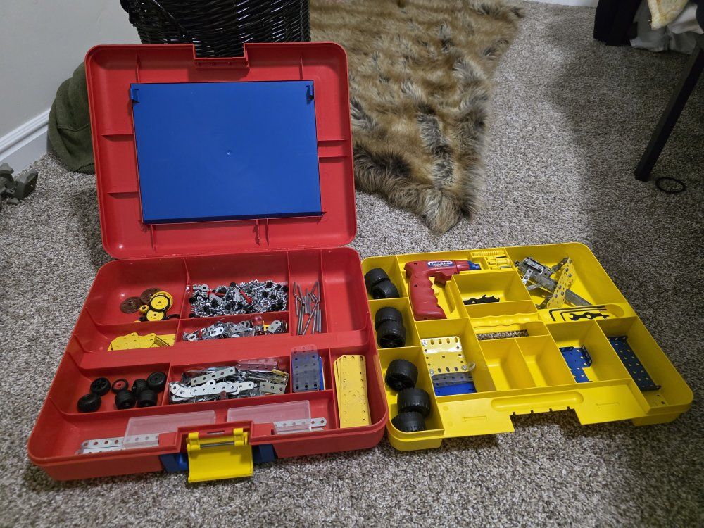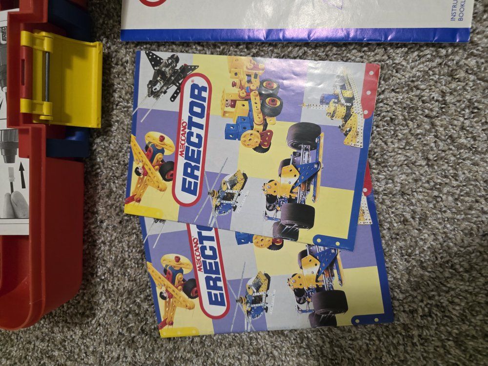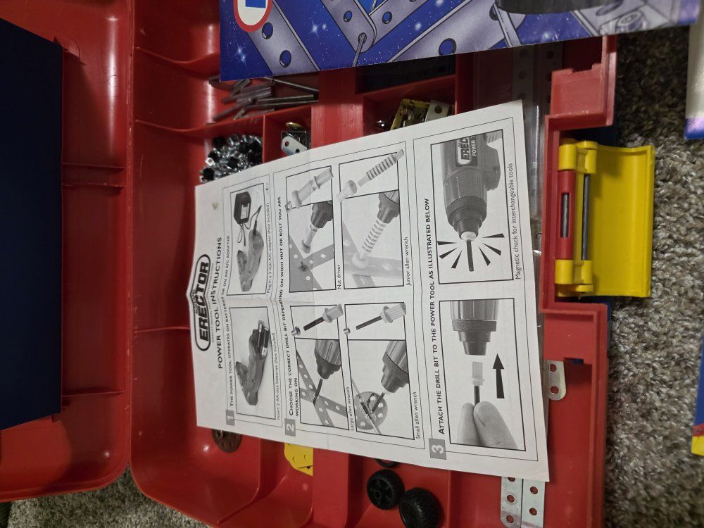 ZelleTwo Erector sets, they are not complete kits, but do have the majority of parts. They both have complete and great condition instruction manuals. the larger kit does have the power tool, only the long bit is missing. There are also several extra hand tools included. Asking $50 for the lot, O.B.O.