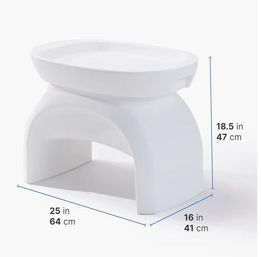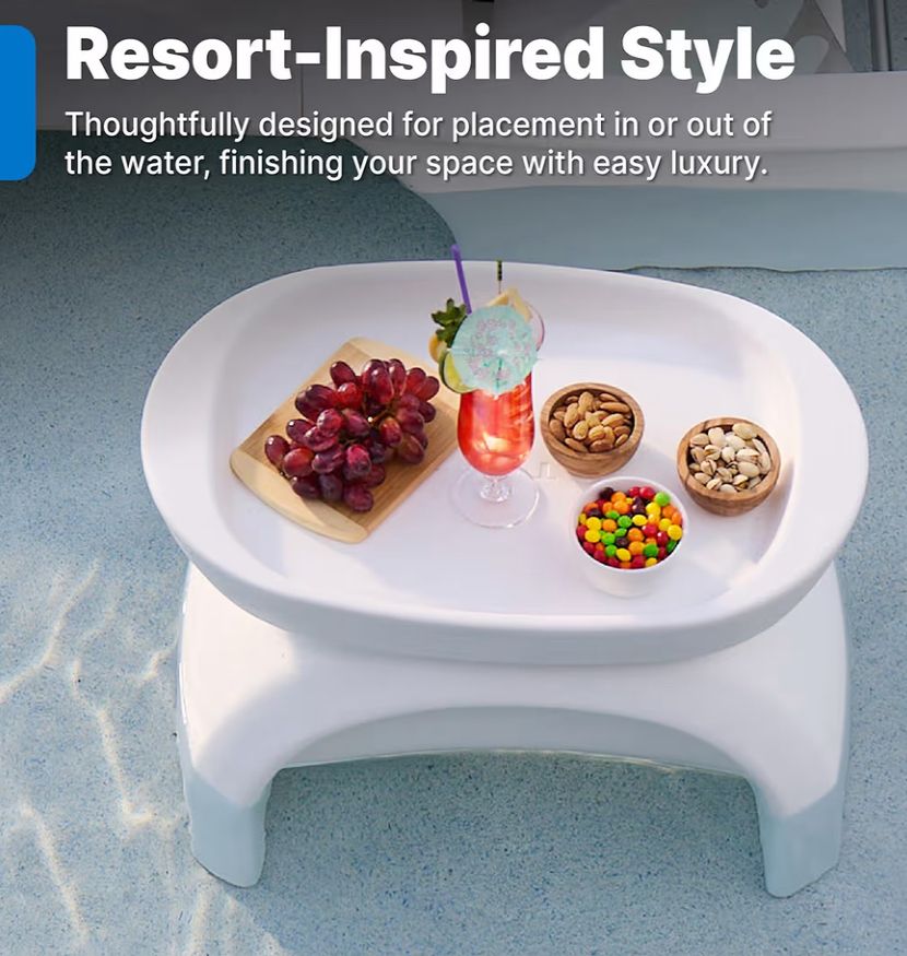 REMOVABLE TRAY: This side table’s tabletop doubles as a removable serving tray, leaving a usable surface underneath. Prepare your spread indoors and transport it to your backyard with ease! INTEGRATED WEIGHT SYSTEM: Holes in base allow water to flow in, anchoring the side table when used in pool for water depths up to 9". For in-water use, completely submerge and fill until all air bubbles are gone. Use caution when using the table in a pool with a liner. Excessive sliding of the table on the pool surface could cause scratches and/or discoloration to liner WEATHERPROOF: Built to withstand the elements and harsh outdoor pool environments, this patio side table is easy to clean and maintain through countless summer days and starlit evenings STYLISH DESIGN: Designed to hold everything from your morning coffee to snacks and chilled refreshments for evening swims. Assembled dimensions 18.5" H x 25" W x 16" D DURABILITY: Designed to withstand weather, chlorine, salt water, built to last, double-walled plastic construction, years of use with colors what won't chip, fade, crack, or peel. The resin is UV20 formulated to withstand approximately 20,000 hours of UV exposure